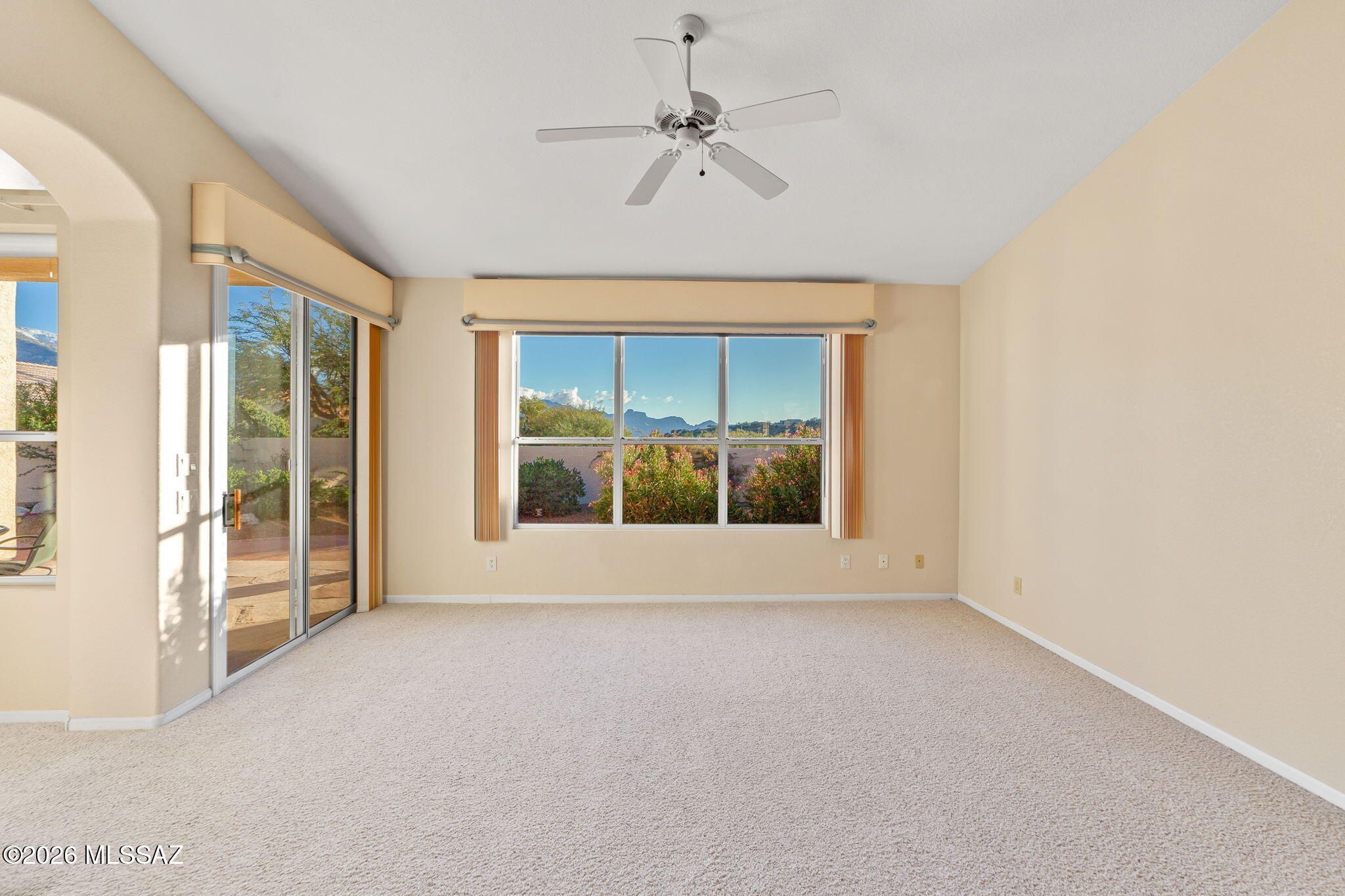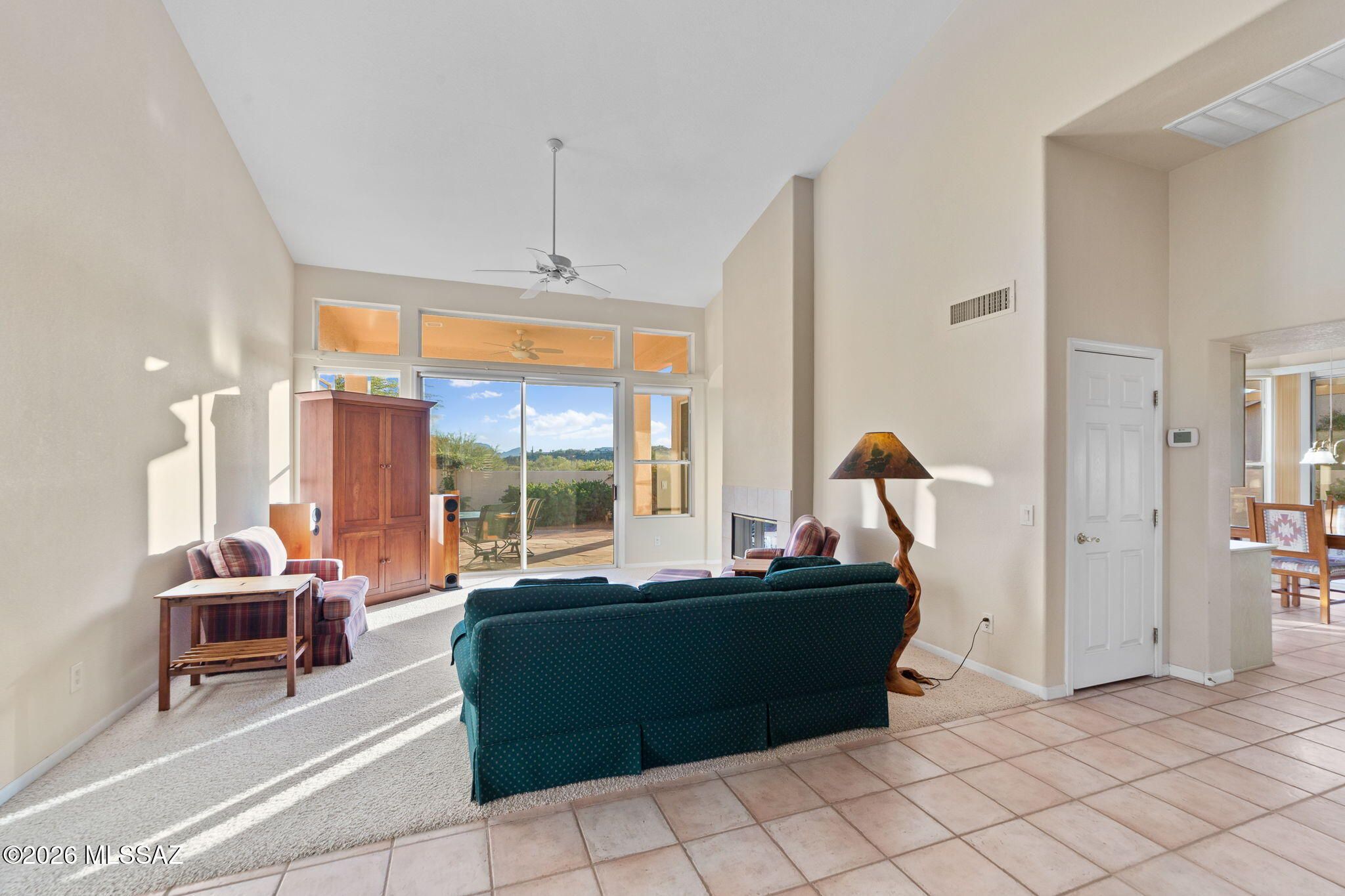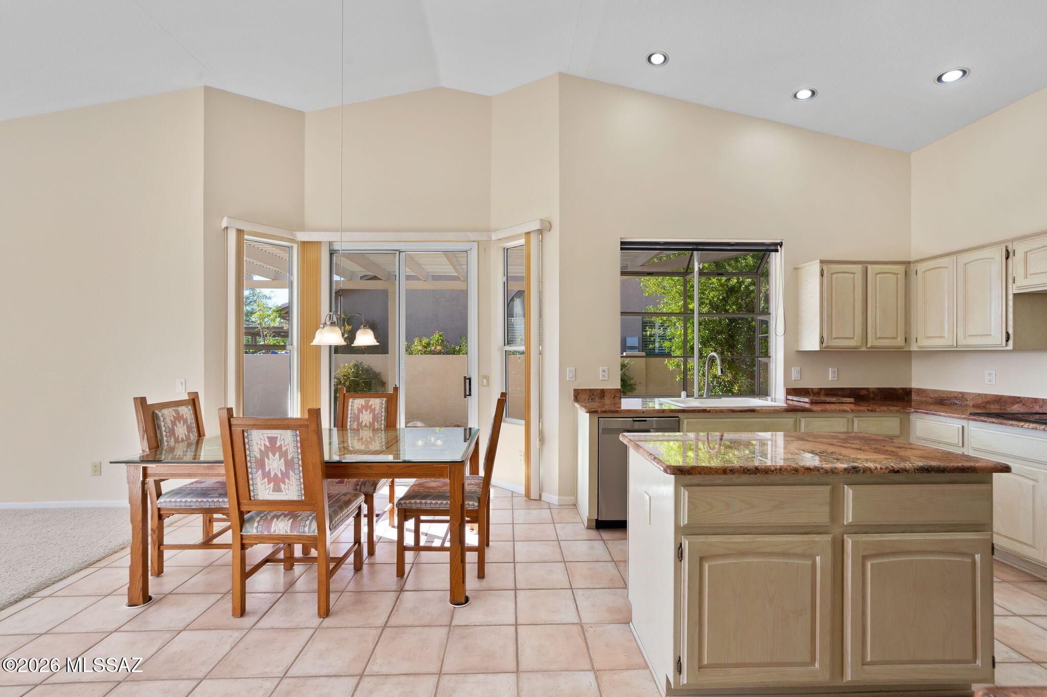 Welcome to this beautifully maintained Estancia model in the highly sought-after active adult community of SaddleBrooke, perfectly positioned to capture breathtaking Catalina Mountain views and unmatched privacy with no homes directly behind thanks to the lush greenbelt backdrop.This light-filled home features soaring vaulted ceilings and expansive picture windows that frame panoramic desert and mountain scenery, creating an open and inviting living space. The split, open floor plan offers two spacious bedrooms, two full bathrooms, plus a generous office that could easily be converted into a third bedroom.The kitchen is designed for both function and entertaining, showcasing Grand Canyon-hued granite countertops, a center island, ample cabinet space, and a breakfast nook