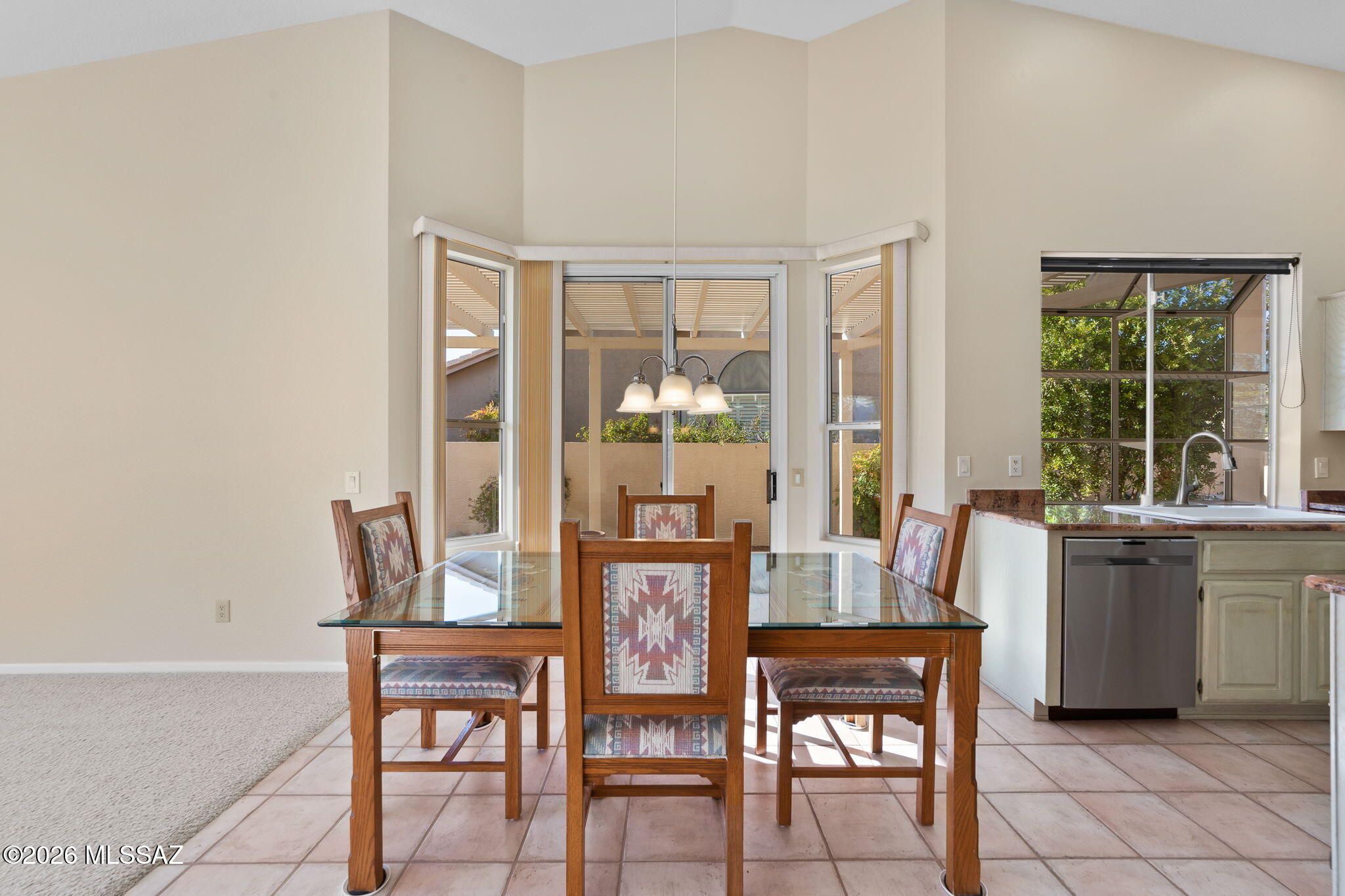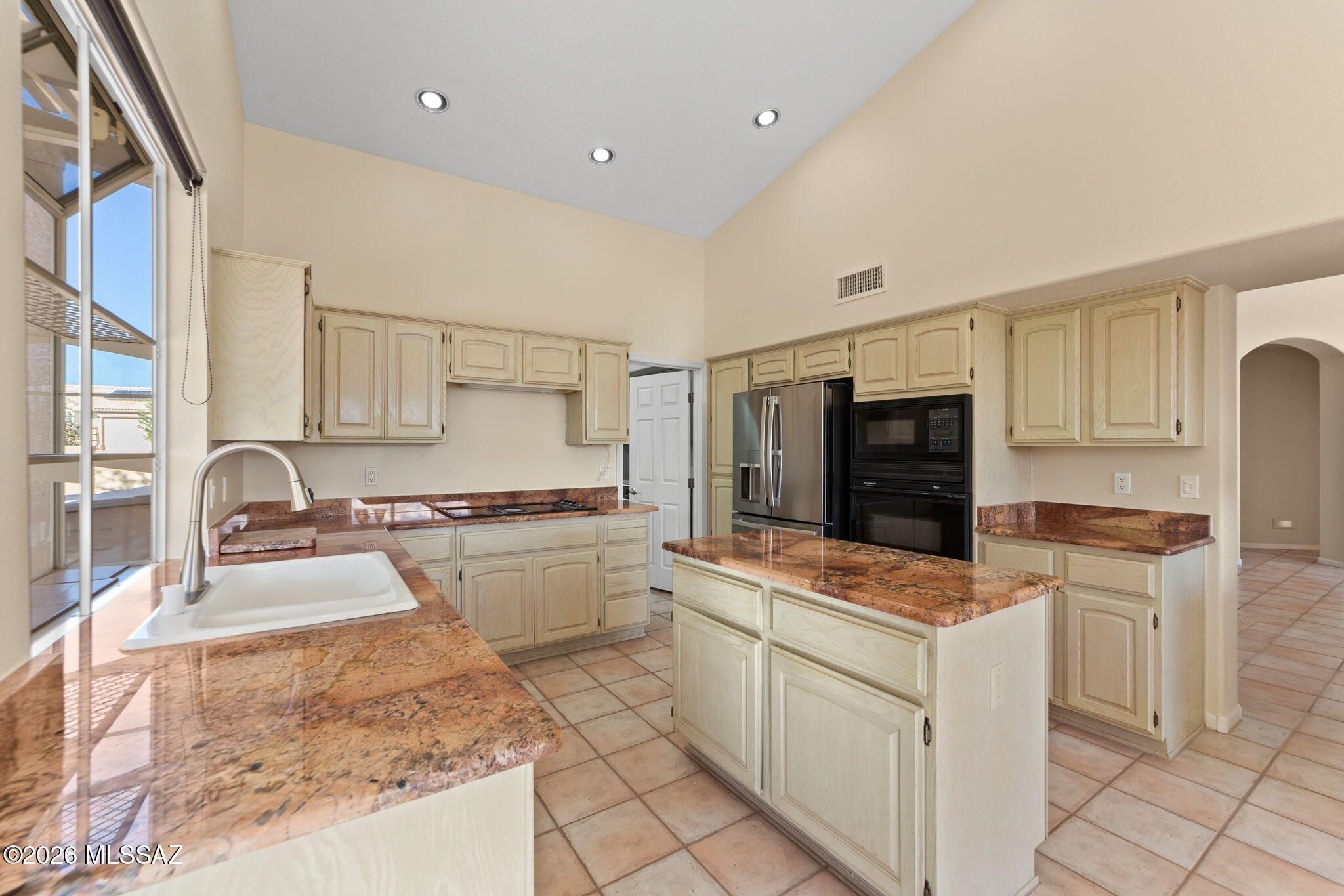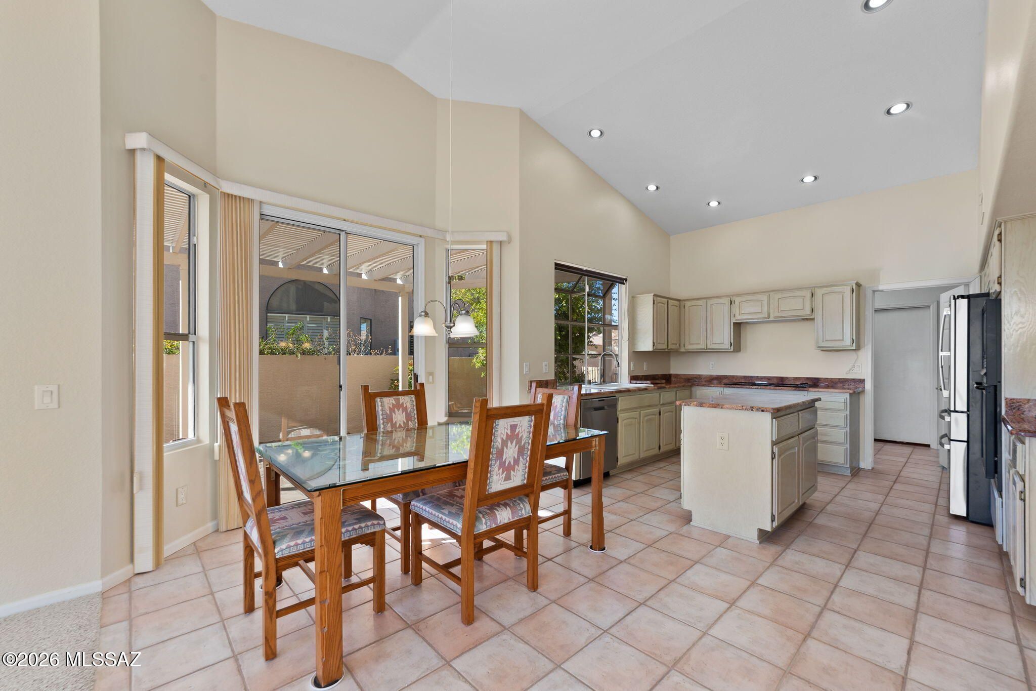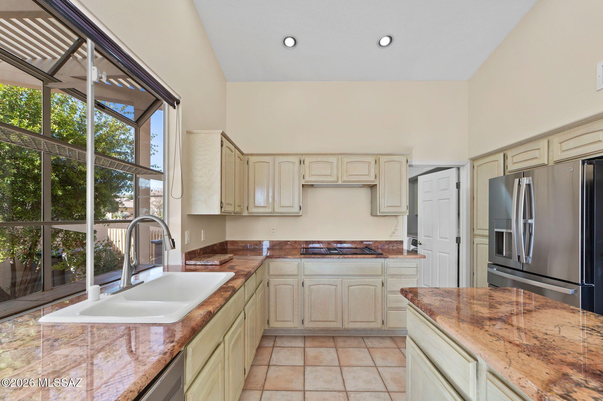 Welcome to this beautifully maintained Estancia model in the highly sought-after active adult community of SaddleBrooke, perfectly positioned to capture breathtaking Catalina Mountain views and unmatched privacy with no homes directly behind thanks to the lush greenbelt backdrop.This light-filled home features soaring vaulted ceilings and expansive picture windows that frame panoramic desert and mountain scenery, creating an open and inviting living space. The split, open floor plan offers two spacious bedrooms, two full bathrooms, plus a generous office that could easily be converted into a third bedroom.The kitchen is designed for both function and entertaining, showcasing Grand Canyon-hued granite countertops, a center island, ample cabinet space, and a breakfast nook