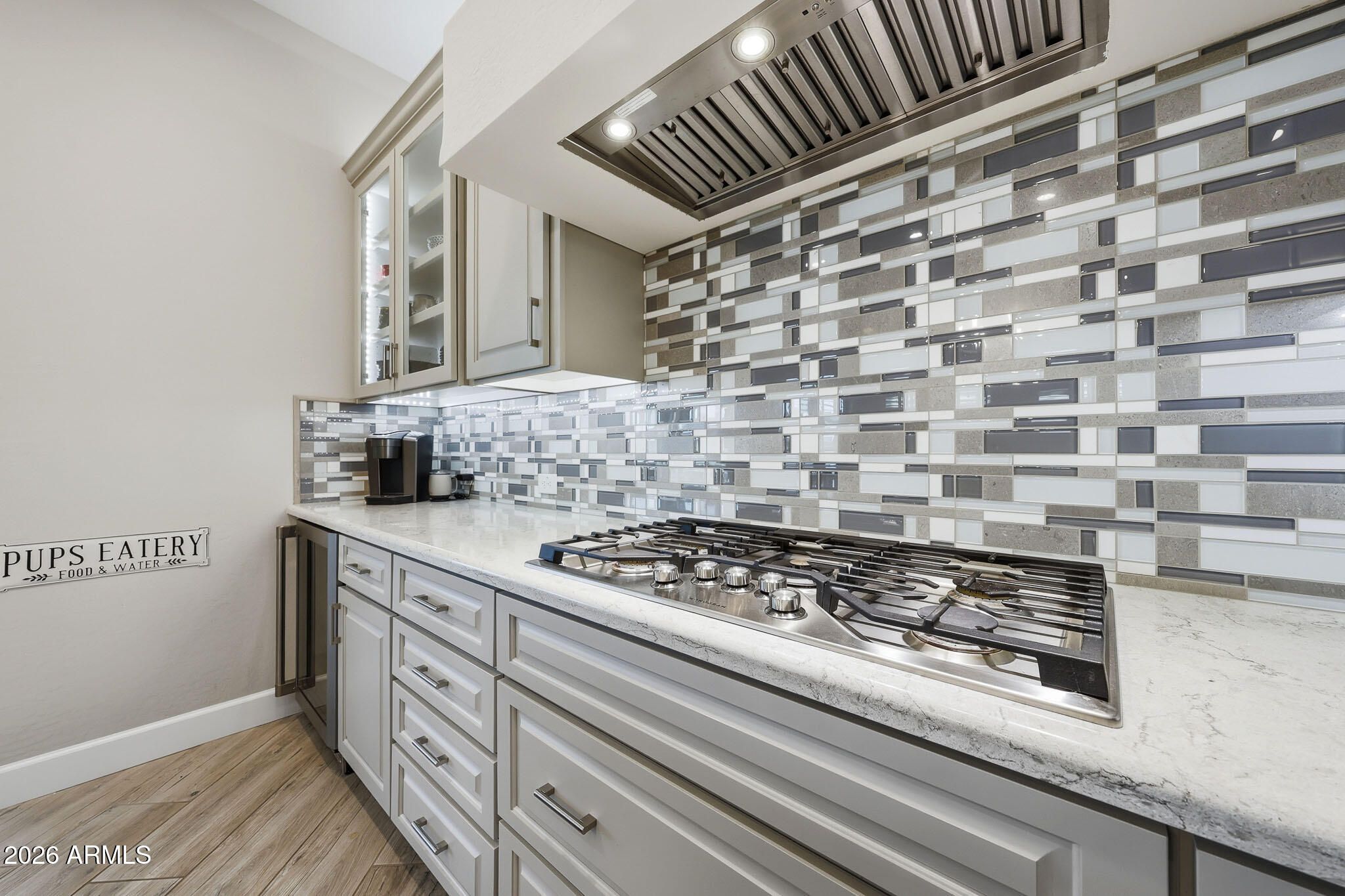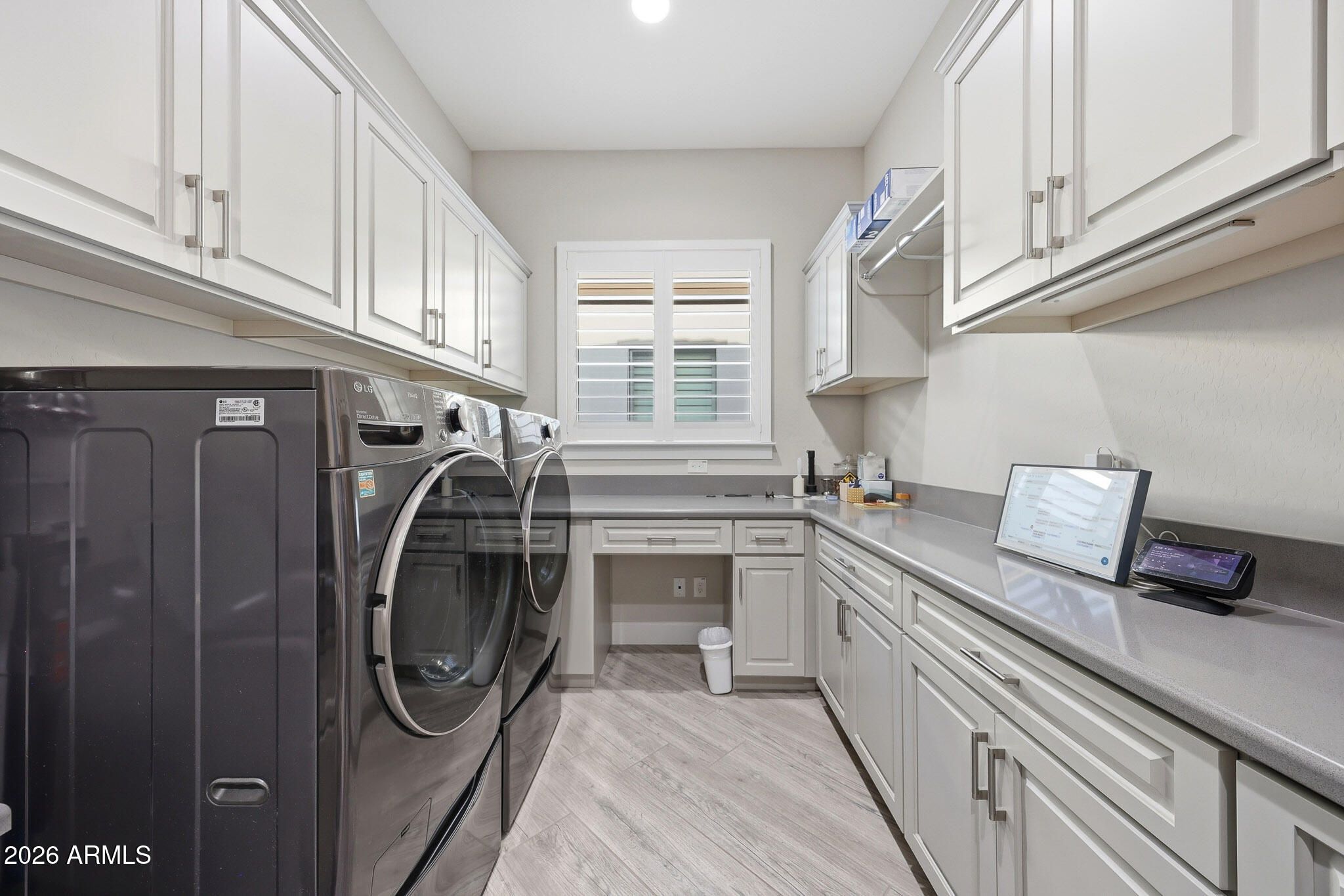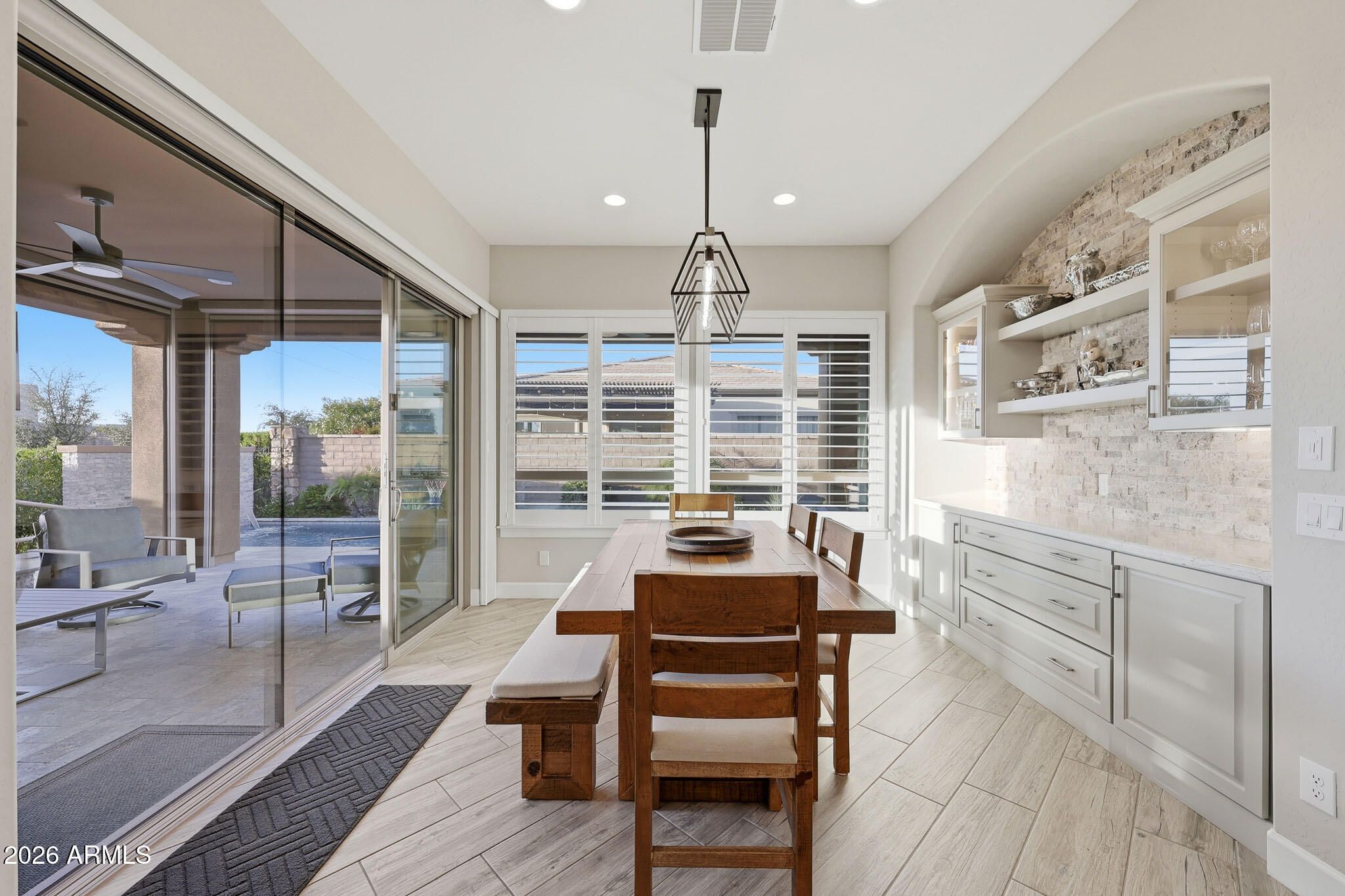 Newly built Shea Home with designer upgrades throughout. Light gray custom cabinetry pairs beautifully with wood-look gray tile flooring for a bright, modern feel. The chef's kitchen features polished white granite countertops, while the spacious primary suite offers a spa-style bath with soaking tub and oversized walk-in closet. Enjoy seamless indoor-outdoor living with retractable sliders opening to a resort backyard featuring a 55-ft heated lap pool with water feature, two sitting areas, two-way gas fireplace, grilling space, and electronic shades surrounding the patio for privacy and added living area. Fully owned solar panels provide energy efficiency. Newly added front arbor enhances shade and curb appeal.