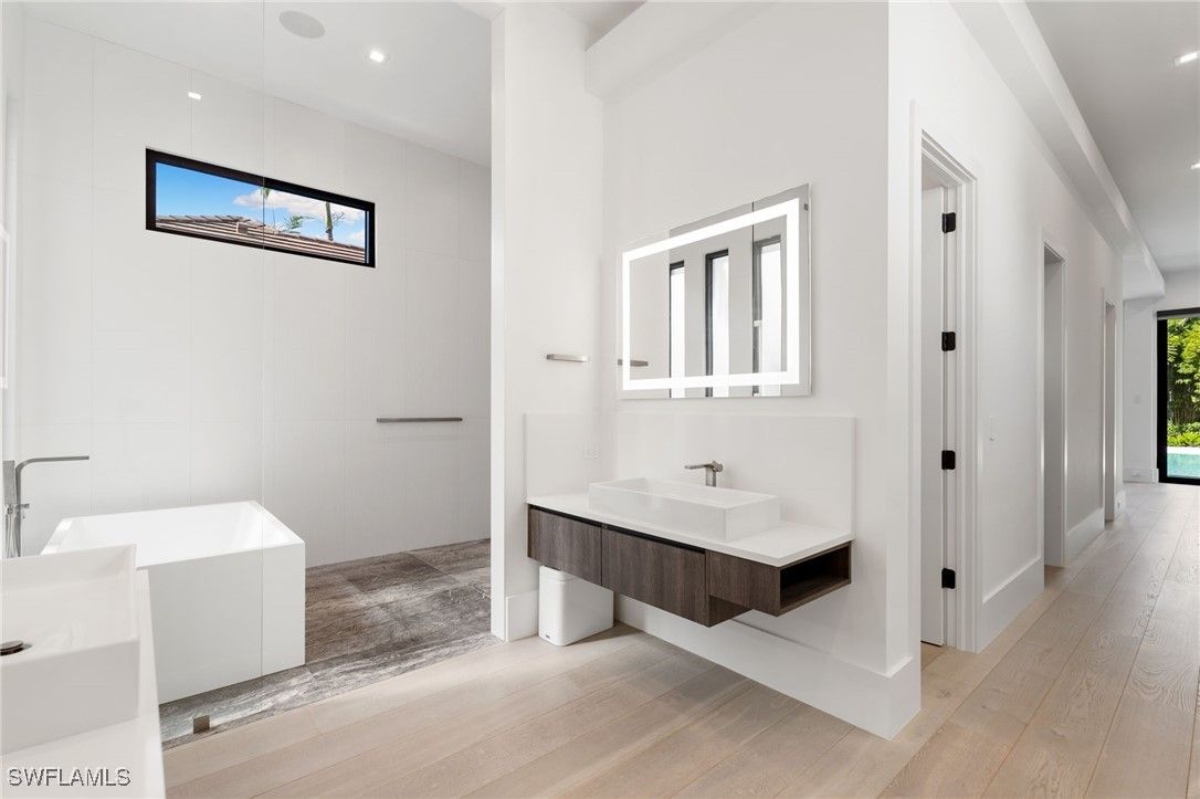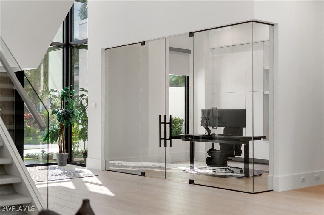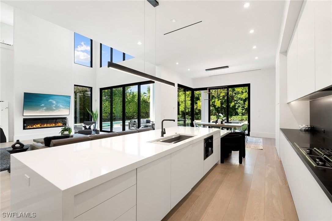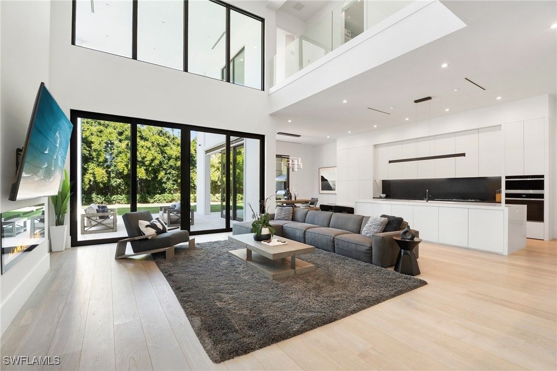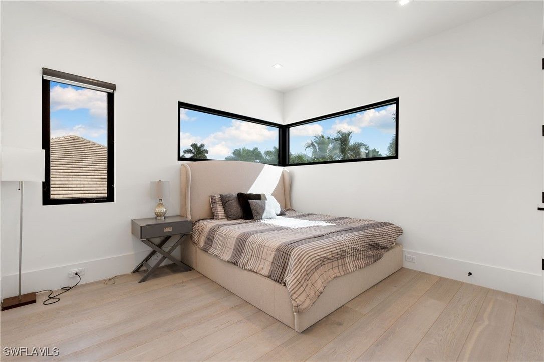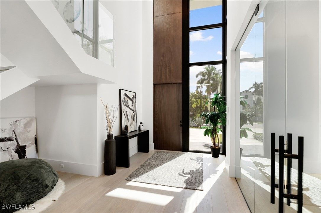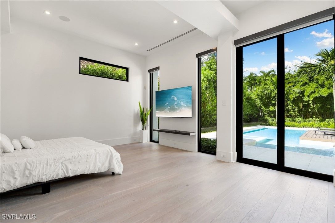 Perfectly positioned in the coveted Moorings neighborhood, this contemporary retreat masterfully balances form and function. Defined by clean architectural lines and sun-drenched interiors, the home embodies a minimalist’s ideal. Natural light pours across wide-plank oak floors, illuminating a gourmet kitchen outfitted with custom cabinetry and premium Wolf and Sub-Zero appliances—an elegant expression of understated luxury. Soaring ceilings amplify the home’s airy ambiance, while the easy flowing layout offers both privacy and flexibility. Dual primary suites—one on the main level and another upstairs—serve as serene sanctuaries, each featuring spa-inspired baths, dual walk-in closets, and convenient laundry access. Outdoors, a lush tropical backdrop framed by bamboo and a fruit-bearing mango tree sets the stage for the sleek modern pool and expansive yard—a private oasis ideal for quiet afternoons or stylish entertaining. With close proximity to downtown Naples and exclusive access to the Moorings Beach Park, this residence is the ideal full or part time residence.