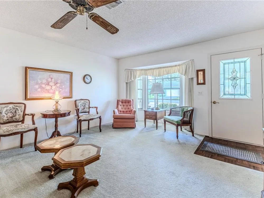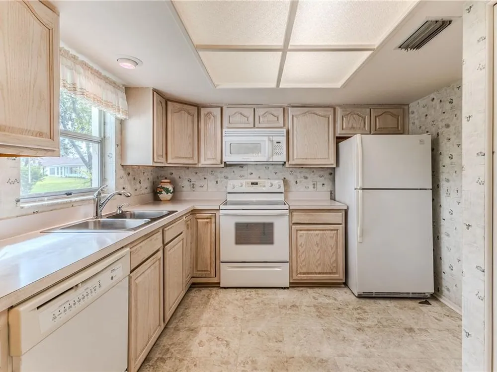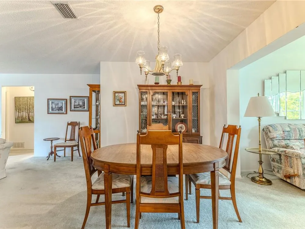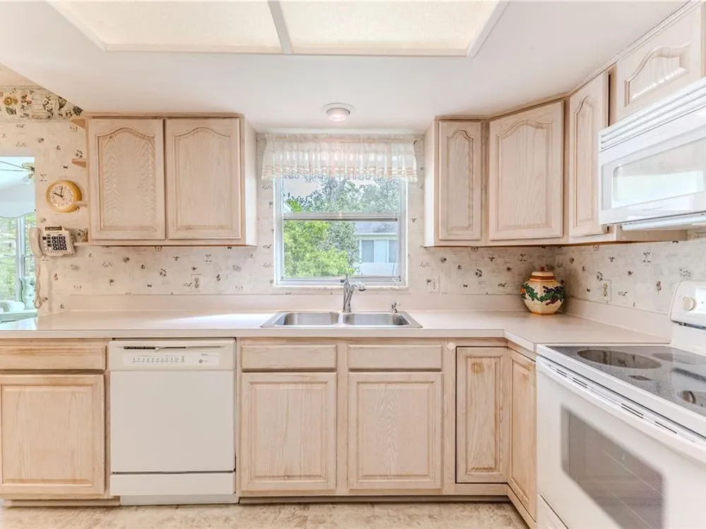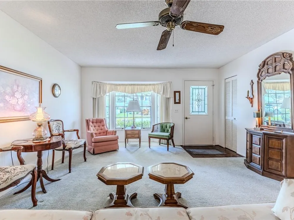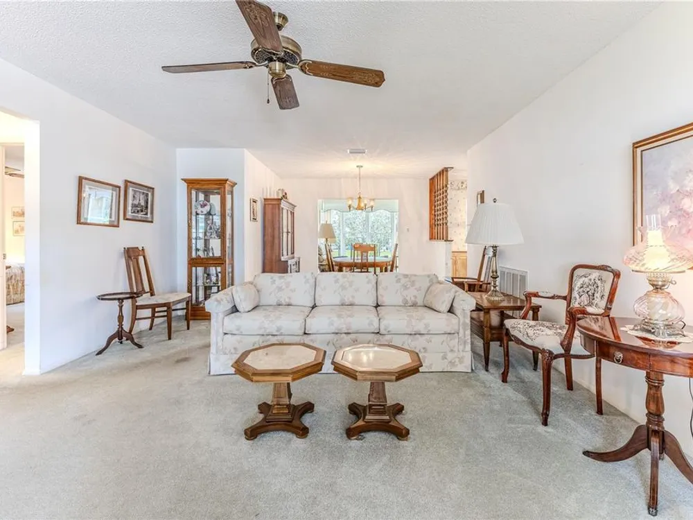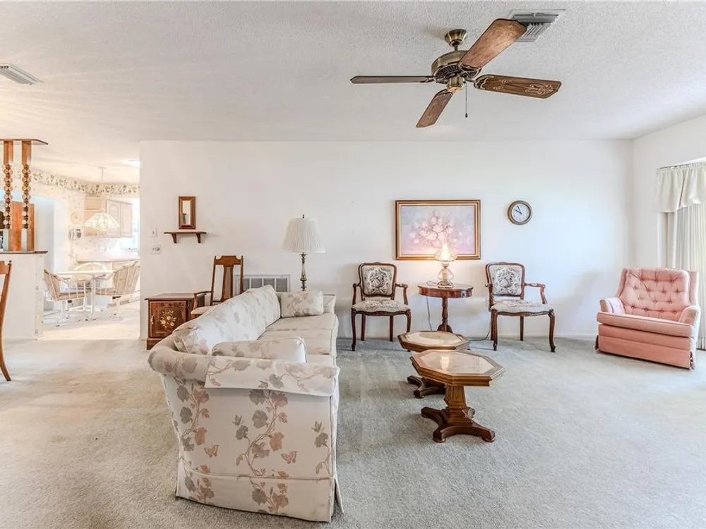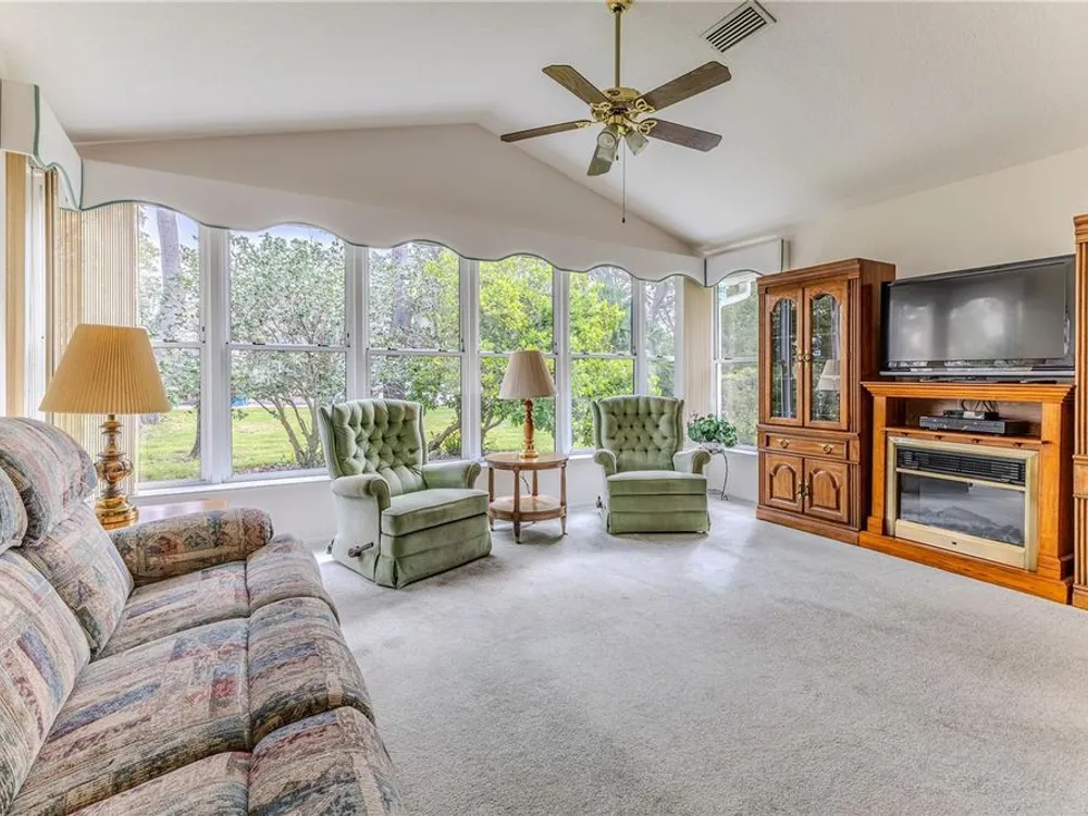 Welcome to this inviting 2-bedroom, 2-bathroom, 2-car garage home that offers a spacious and functional layout. Recent updates include a new roof in 2023, and the HVAC system was replaced in 2025, giving peace of mind for years to come. Step inside to find a living room and dining room combination, perfect for entertaining or everyday living. A separate family room with vaulted ceilings and a wall of windows provides an open, airy feel and fills the space with natural light. The kitchen features an eat-in area, solar tube, a double sink with a view of the garden, and a wall pantry for extra storage. A convenient closet houses the washer and dryer, keeping laundry within easy reach. The primary bedroom boasts an oversized walk-in closet, ceiling fan, and an en-suite bath with a step-in shower. The guest bedroom is generously sized with two large closets and easy access to the full hall bathroom, complete with tile flooring and a bathtub/shower combo. The garage includes a utility sink and work bench. Timber Pines is an award winning, guard-gated, 55+, deed-restricted community offering a resort-style lifestyle: three 18-hole golf courses, a 9-hole pitch & putt, tennis, 12 pickleball courts, two community swimming pools, country club restaurant and bar, fitness center, billiards, performing arts, and over 100 social clubs and activities. With its thoughtful floor plan, abundant natural light, and key system updates, this home is move-in ready and a fantastic opportunity to make your own.