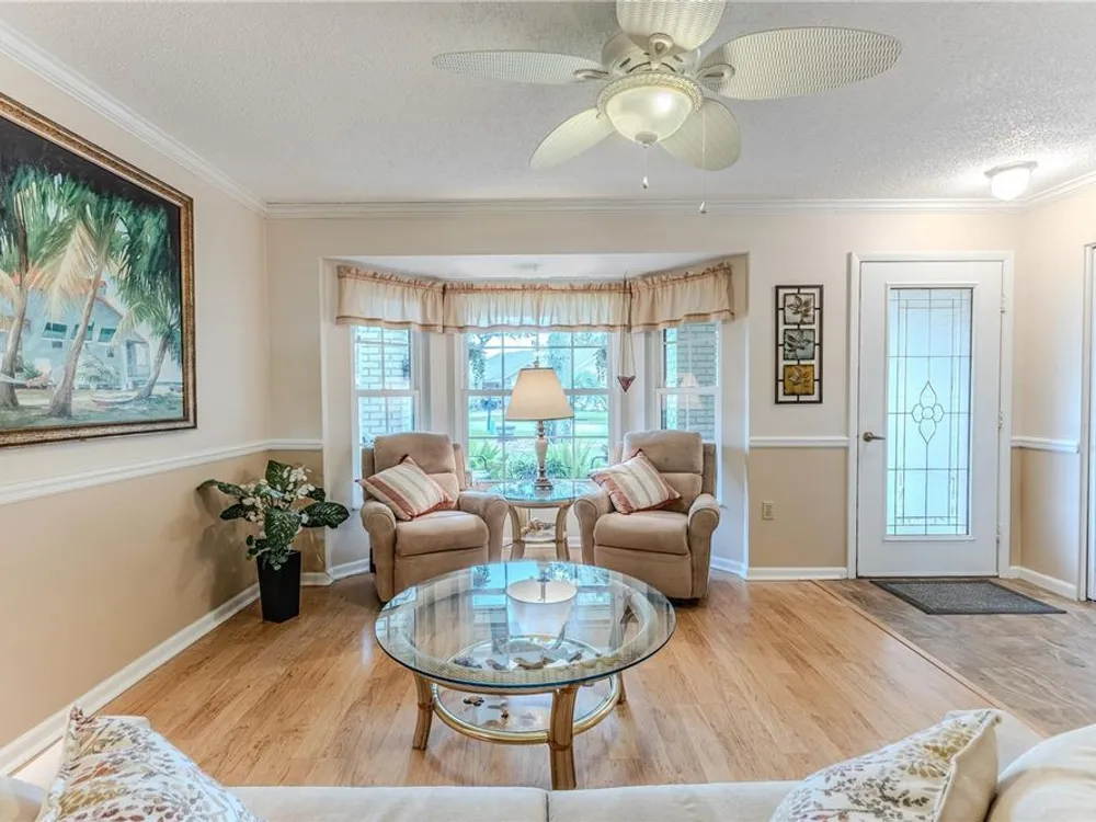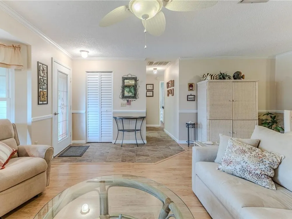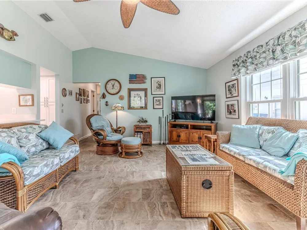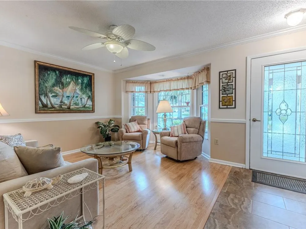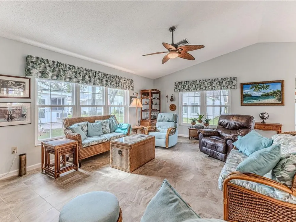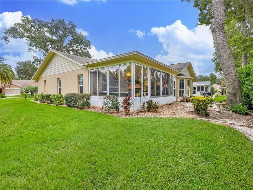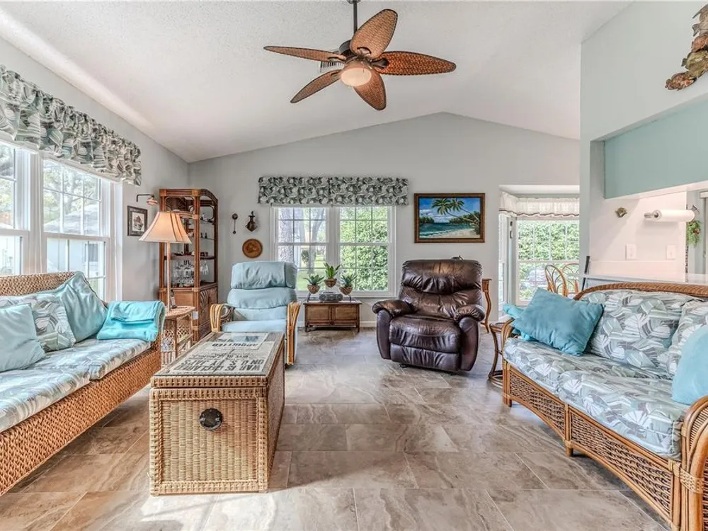 Welcome to this beautifully updated Victoria model, featuring 2 bedrooms, 2 bathrooms, and a spacious 2-car garage. Every detail has been thoughtfully designed for comfort, style, and function — starting with new windows, elegant laminate flooring, and tasteful updates throughout. The kitchen is a true showpiece, offering wood cabinetry, soft-close drawers, quartz countertops, a large pantry with pullouts, and thoughtful storage including spice racks, trash and recycling bins, cookie sheet organizers, and deep drawers for pots and pans. The kitchen opens to the family room, featuring vaulted ceilings and ceramic tile floors, creating an ideal flow for entertaining or everyday living. The living room and dining room combination is warm and inviting, enhanced by crown molding, chair rail detailing, and ceiling fans for comfort. The dining area opens to a bright enclosed Florida room with tile flooring, ceiling fans, and walls of windows that flood the space with natural light and relaxing views — the perfect spot to enjoy morning coffee or unwind in the evening. The primary bedroom offers laminate flooring, two large closets, and remodeled ensuite bath with dual sink vanities, wood cabinetry, Corian countertops, a beautiful tiled shower, and a modern ceiling fan. The guest bedroom boasts an impressive walk-in closet, while the guest bath has been tastefully updated with a soft-close vanity, Corian countertop, new toilet, and stylish tiled shower. Additional features include new interior doors throughout, inside laundry room with cabinetry and a deep utility sink, water softener, pavered drive and walkway, newer water heater. Roof 2017. Garage Door 2017. HVAC 2012. Timber Pines is an award winning, guard-gated, 55+, deed-restricted community offering a resort-style lifestyle: three18-hole golf courses, a 9-hole pitch & putt, tennis, 12 pickleball courts, two community swimming pools, country club restaurant and bar, fitness center, billiards, performing arts, woodworking and over 100 social clubs and activities. Furnishings and golf cart (2020) are available separately, making this home an exceptional opportunity to move right in and start enjoying the Florida lifestyle.