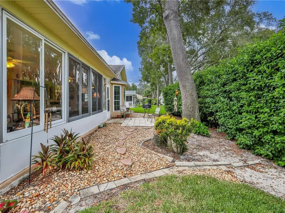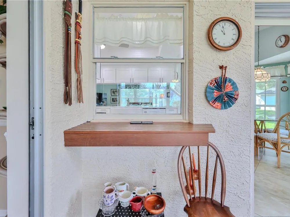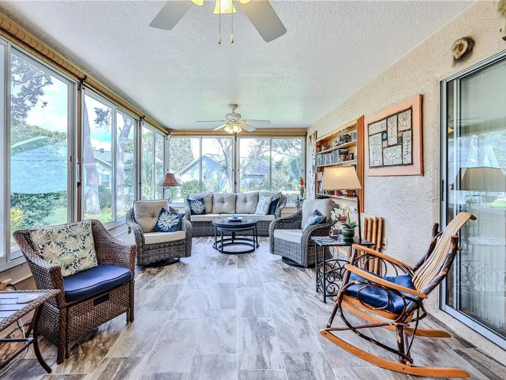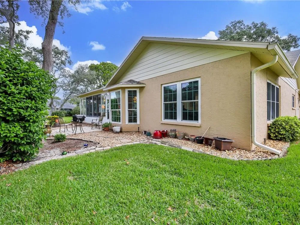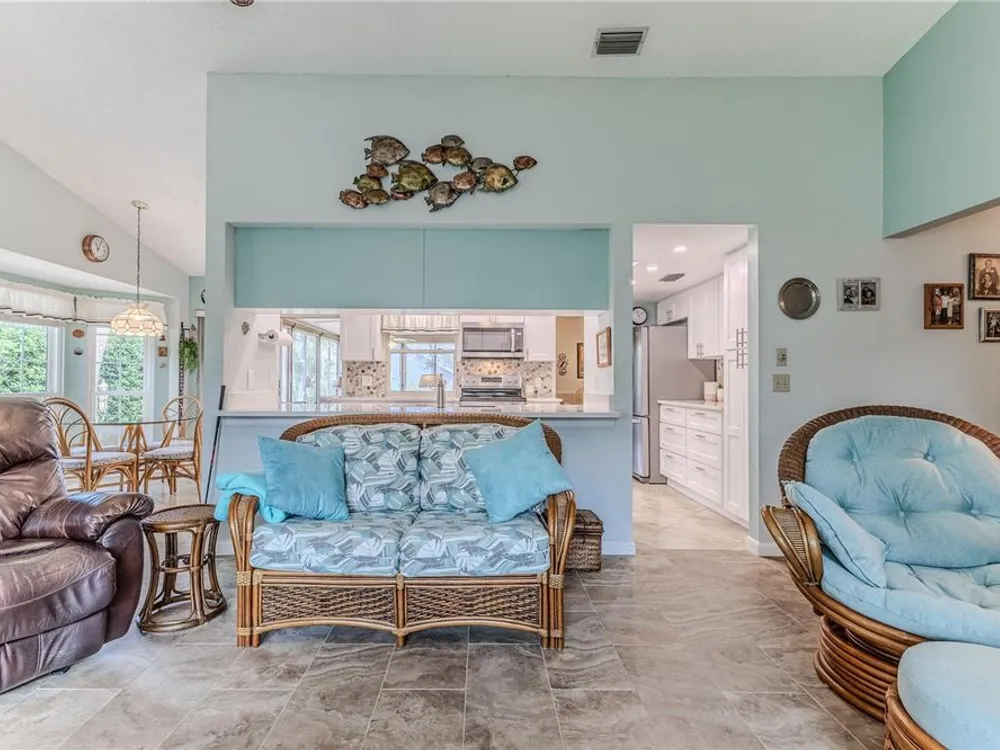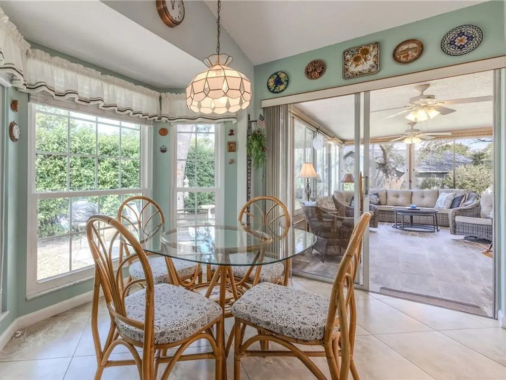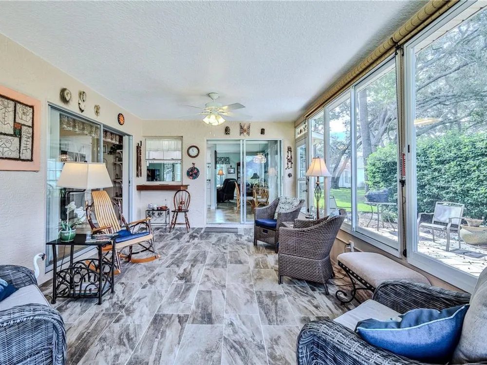 Welcome to this beautifully updated Victoria model, featuring 2 bedrooms, 2 bathrooms, and a spacious 2-car garage. Every detail has been thoughtfully designed for comfort, style, and function — starting with new windows, elegant laminate flooring, and tasteful updates throughout. The kitchen is a true showpiece, offering wood cabinetry, soft-close drawers, quartz countertops, a large pantry with pullouts, and thoughtful storage including spice racks, trash and recycling bins, cookie sheet organizers, and deep drawers for pots and pans. The kitchen opens to the family room, featuring vaulted ceilings and ceramic tile floors, creating an ideal flow for entertaining or everyday living. The living room and dining room combination is warm and inviting, enhanced by crown molding, chair rail detailing, and ceiling fans for comfort. The dining area opens to a bright enclosed Florida room with tile flooring, ceiling fans, and walls of windows that flood the space with natural light and relaxing views — the perfect spot to enjoy morning coffee or unwind in the evening. The primary bedroom offers laminate flooring, two large closets, and remodeled ensuite bath with dual sink vanities, wood cabinetry, Corian countertops, a beautiful tiled shower, and a modern ceiling fan. The guest bedroom boasts an impressive walk-in closet, while the guest bath has been tastefully updated with a soft-close vanity, Corian countertop, new toilet, and stylish tiled shower. Additional features include new interior doors throughout, inside laundry room with cabinetry and a deep utility sink, water softener, pavered drive and walkway, newer water heater. Roof 2017. Garage Door 2017. HVAC 2012. Timber Pines is an award winning, guard-gated, 55+, deed-restricted community offering a resort-style lifestyle: three18-hole golf courses, a 9-hole pitch & putt, tennis, 12 pickleball courts, two community swimming pools, country club restaurant and bar, fitness center, billiards, performing arts, woodworking and over 100 social clubs and activities. Furnishings and golf cart (2020) are available separately, making this home an exceptional opportunity to move right in and start enjoying the Florida lifestyle.