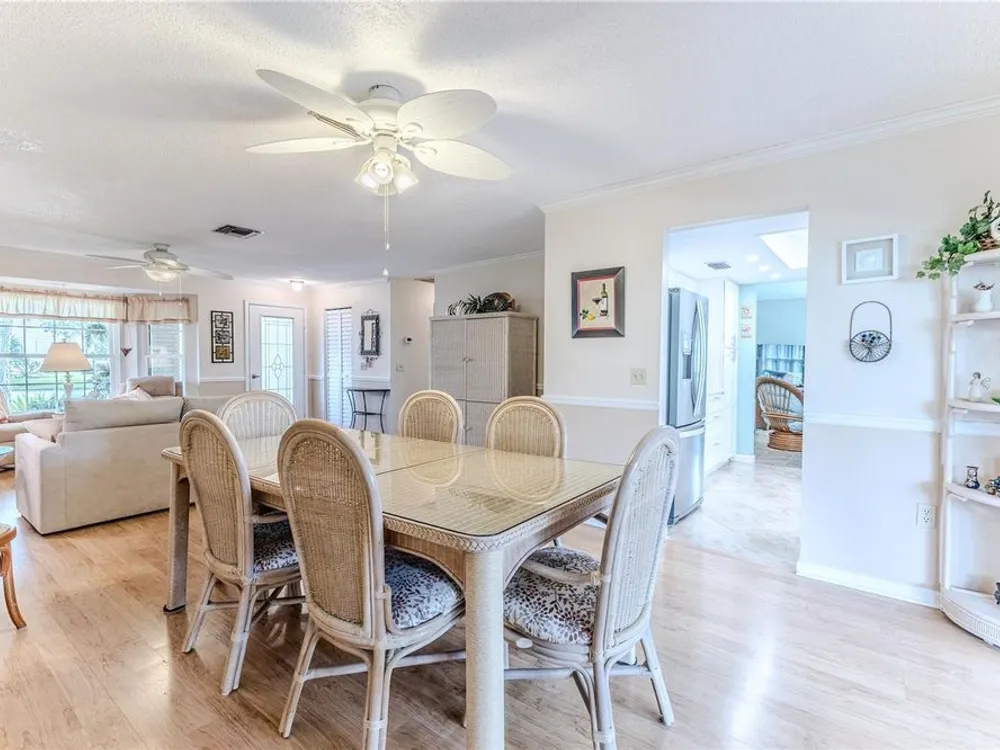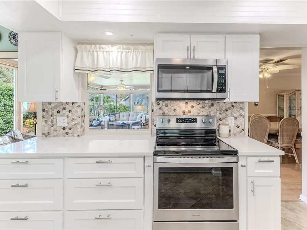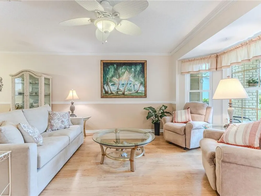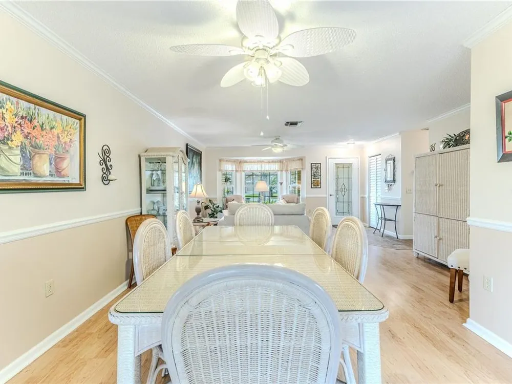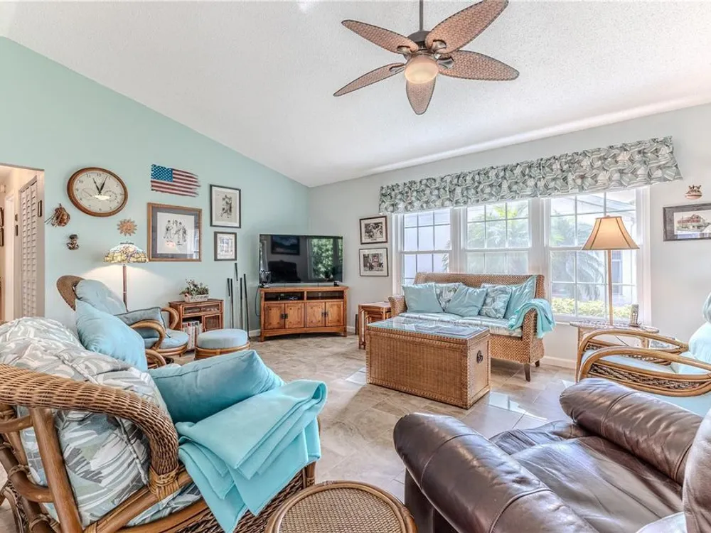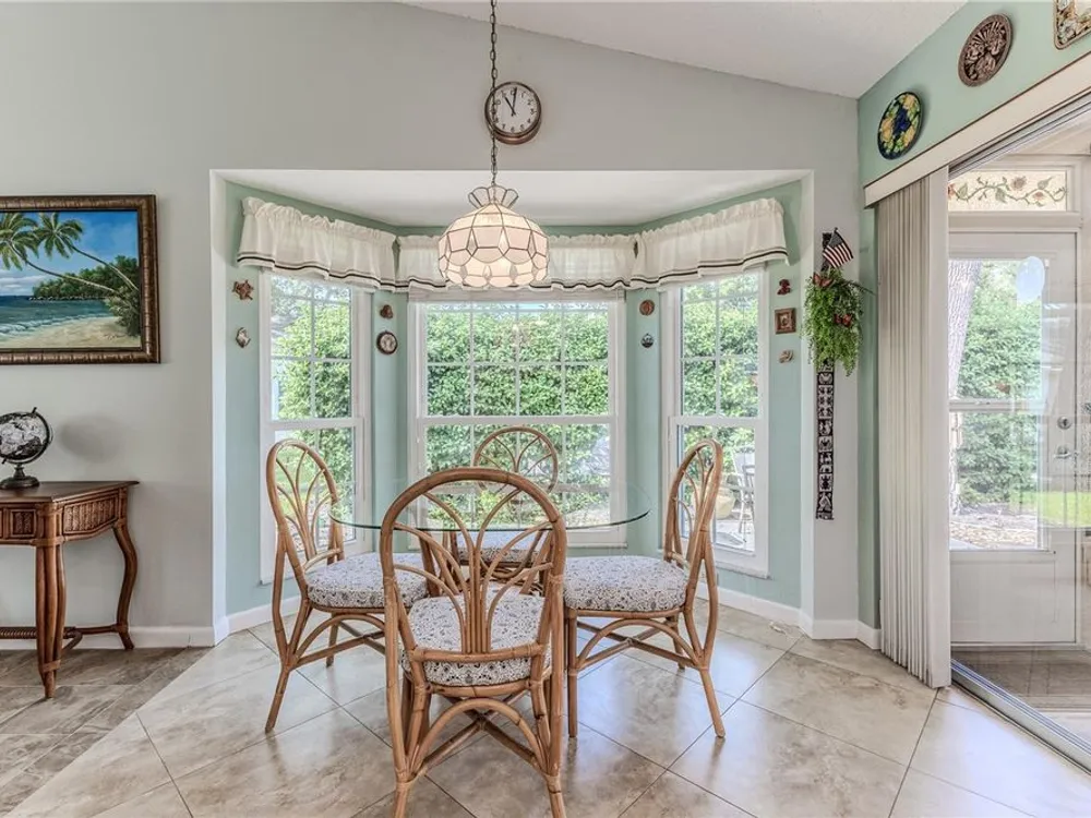 Welcome to this beautifully updated Victoria model, featuring 2 bedrooms, 2 bathrooms, and a spacious 2-car garage. Every detail has been thoughtfully designed for comfort, style, and function — starting with new windows, elegant laminate flooring, and tasteful updates throughout. The kitchen is a true showpiece, offering wood cabinetry, soft-close drawers, quartz countertops, a large pantry with pullouts, and thoughtful storage including spice racks, trash and recycling bins, cookie sheet organizers, and deep drawers for pots and pans. The kitchen opens to the family room, featuring vaulted ceilings and ceramic tile floors, creating an ideal flow for entertaining or everyday living. The living room and dining room combination is warm and inviting, enhanced by crown molding, chair rail detailing, and ceiling fans for comfort. The dining area opens to a bright enclosed Florida room with tile flooring, ceiling fans, and walls of windows that flood the space with natural light and relaxing views — the perfect spot to enjoy morning coffee or unwind in the evening. The primary bedroom offers laminate flooring, two large closets, and remodeled ensuite bath with dual sink vanities, wood cabinetry, Corian countertops, a beautiful tiled shower, and a modern ceiling fan. The guest bedroom boasts an impressive walk-in closet, while the guest bath has been tastefully updated with a soft-close vanity, Corian countertop, new toilet, and stylish tiled shower. Additional features include new interior doors throughout, inside laundry room with cabinetry and a deep utility sink, water softener, pavered drive and walkway, newer water heater. Roof 2017. Garage Door 2017. HVAC 2012. Timber Pines is an award winning, guard-gated, 55+, deed-restricted community offering a resort-style lifestyle: three18-hole golf courses, a 9-hole pitch & putt, tennis, 12 pickleball courts, two community swimming pools, country club restaurant and bar, fitness center, billiards, performing arts, woodworking and over 100 social clubs and activities. Furnishings and golf cart (2020) are available separately, making this home an exceptional opportunity to move right in and start enjoying the Florida lifestyle.