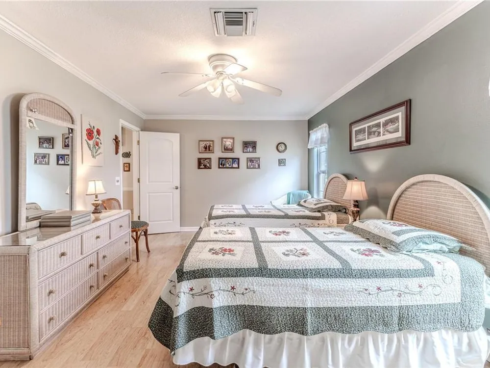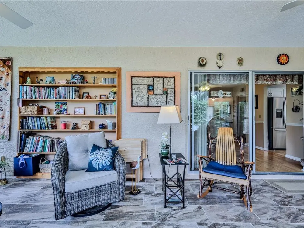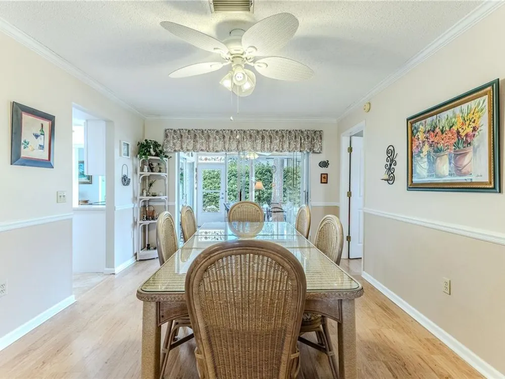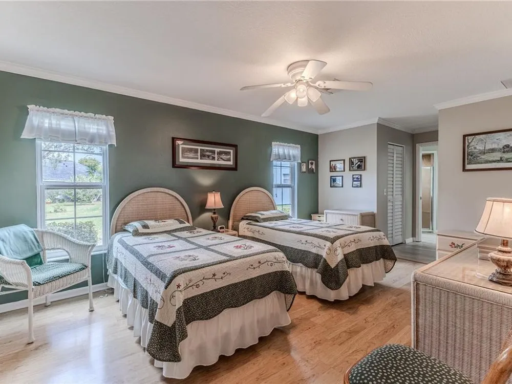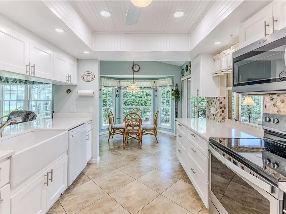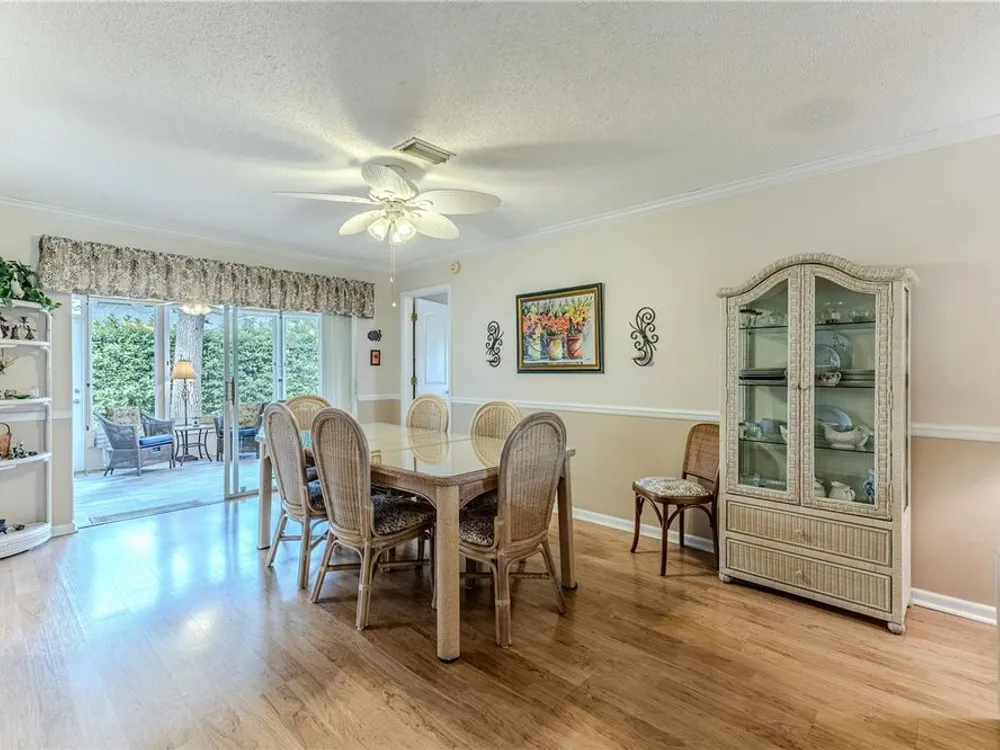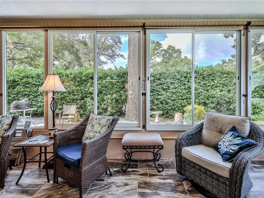 Welcome to this beautifully updated Victoria model, featuring 2 bedrooms, 2 bathrooms, and a spacious 2-car garage. Every detail has been thoughtfully designed for comfort, style, and function — starting with new windows, elegant laminate flooring, and tasteful updates throughout. The kitchen is a true showpiece, offering wood cabinetry, soft-close drawers, quartz countertops, a large pantry with pullouts, and thoughtful storage including spice racks, trash and recycling bins, cookie sheet organizers, and deep drawers for pots and pans. The kitchen opens to the family room, featuring vaulted ceilings and ceramic tile floors, creating an ideal flow for entertaining or everyday living. The living room and dining room combination is warm and inviting, enhanced by crown molding, chair rail detailing, and ceiling fans for comfort. The dining area opens to a bright enclosed Florida room with tile flooring, ceiling fans, and walls of windows that flood the space with natural light and relaxing views — the perfect spot to enjoy morning coffee or unwind in the evening. The primary bedroom offers laminate flooring, two large closets, and remodeled ensuite bath with dual sink vanities, wood cabinetry, Corian countertops, a beautiful tiled shower, and a modern ceiling fan. The guest bedroom boasts an impressive walk-in closet, while the guest bath has been tastefully updated with a soft-close vanity, Corian countertop, new toilet, and stylish tiled shower. Additional features include new interior doors throughout, inside laundry room with cabinetry and a deep utility sink, water softener, pavered drive and walkway, newer water heater. Roof 2017. Garage Door 2017. HVAC 2012. Timber Pines is an award winning, guard-gated, 55+, deed-restricted community offering a resort-style lifestyle: three18-hole golf courses, a 9-hole pitch & putt, tennis, 12 pickleball courts, two community swimming pools, country club restaurant and bar, fitness center, billiards, performing arts, woodworking and over 100 social clubs and activities. Furnishings and golf cart (2020) are available separately, making this home an exceptional opportunity to move right in and start enjoying the Florida lifestyle.