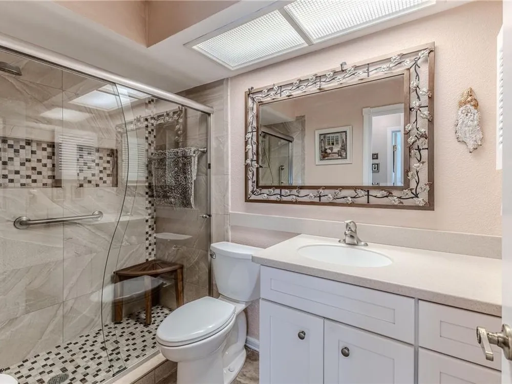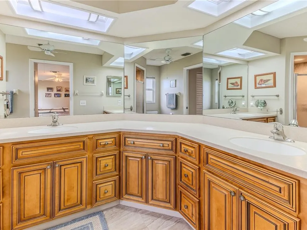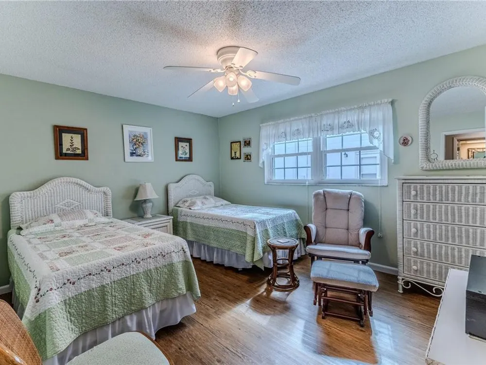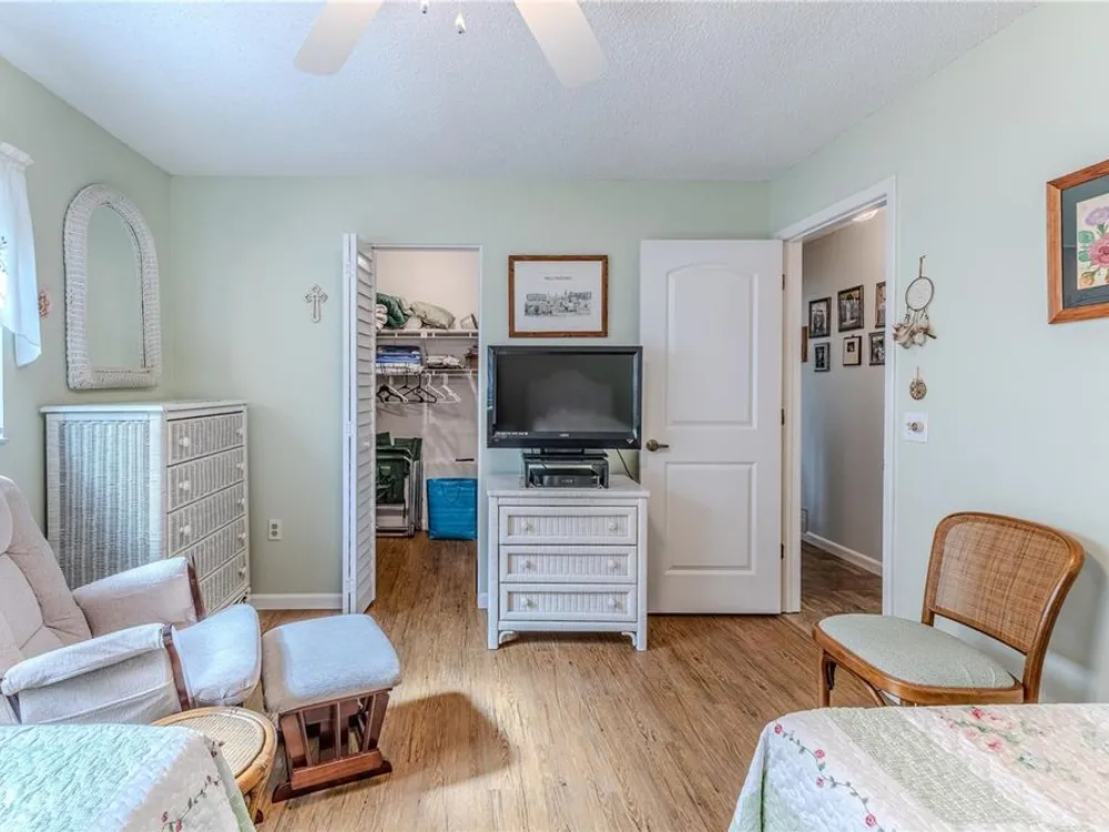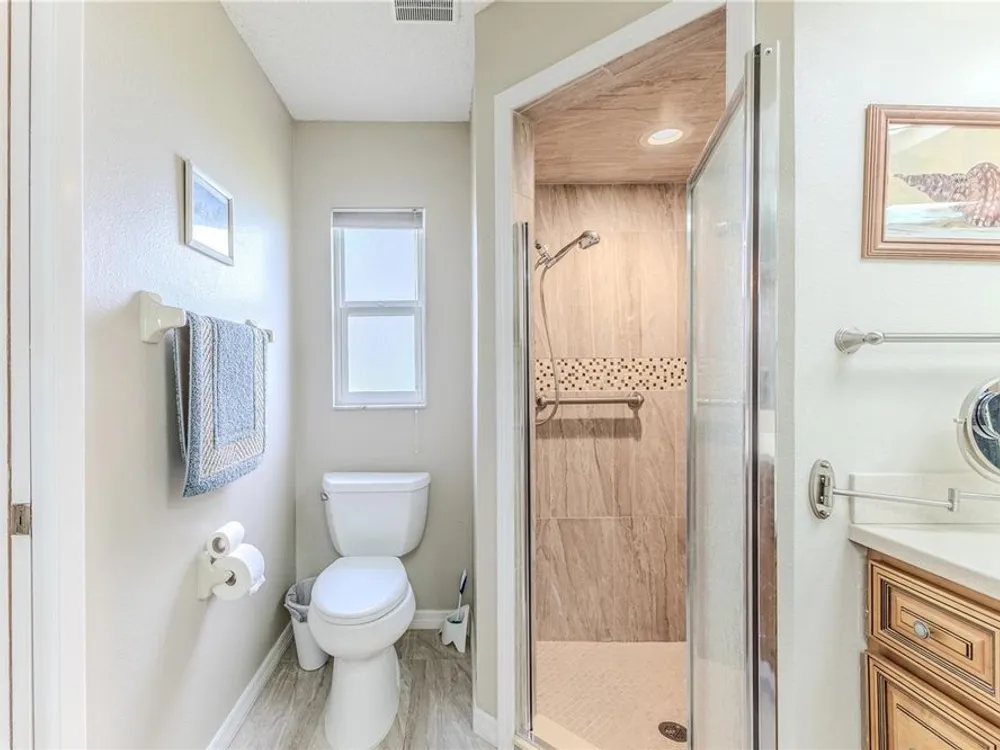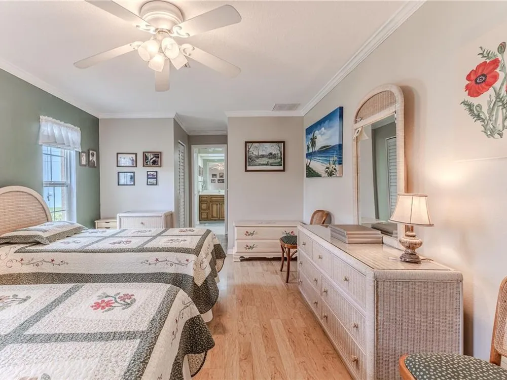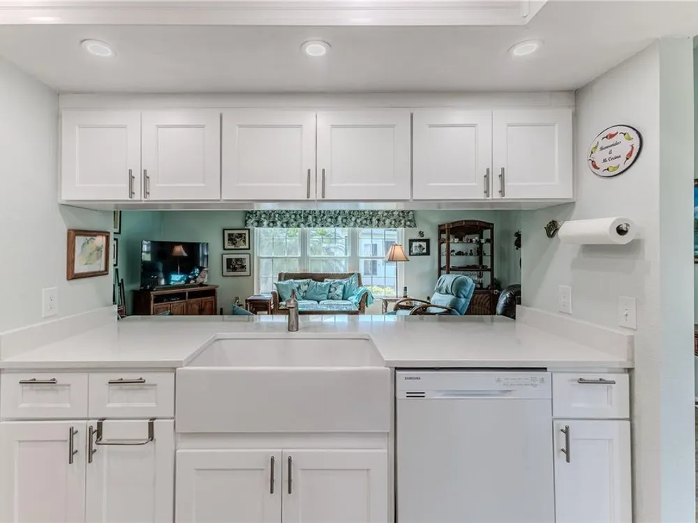 Welcome to this beautifully updated Victoria model, featuring 2 bedrooms, 2 bathrooms, and a spacious 2-car garage. Every detail has been thoughtfully designed for comfort, style, and function — starting with new windows, elegant laminate flooring, and tasteful updates throughout. The kitchen is a true showpiece, offering wood cabinetry, soft-close drawers, quartz countertops, a large pantry with pullouts, and thoughtful storage including spice racks, trash and recycling bins, cookie sheet organizers, and deep drawers for pots and pans. The kitchen opens to the family room, featuring vaulted ceilings and ceramic tile floors, creating an ideal flow for entertaining or everyday living. The living room and dining room combination is warm and inviting, enhanced by crown molding, chair rail detailing, and ceiling fans for comfort. The dining area opens to a bright enclosed Florida room with tile flooring, ceiling fans, and walls of windows that flood the space with natural light and relaxing views — the perfect spot to enjoy morning coffee or unwind in the evening. The primary bedroom offers laminate flooring, two large closets, and remodeled ensuite bath with dual sink vanities, wood cabinetry, Corian countertops, a beautiful tiled shower, and a modern ceiling fan. The guest bedroom boasts an impressive walk-in closet, while the guest bath has been tastefully updated with a soft-close vanity, Corian countertop, new toilet, and stylish tiled shower. Additional features include new interior doors throughout, inside laundry room with cabinetry and a deep utility sink, water softener, pavered drive and walkway, newer water heater. Roof 2017. Garage Door 2017. HVAC 2012. Timber Pines is an award winning, guard-gated, 55+, deed-restricted community offering a resort-style lifestyle: three18-hole golf courses, a 9-hole pitch & putt, tennis, 12 pickleball courts, two community swimming pools, country club restaurant and bar, fitness center, billiards, performing arts, woodworking and over 100 social clubs and activities. Furnishings and golf cart (2020) are available separately, making this home an exceptional opportunity to move right in and start enjoying the Florida lifestyle.