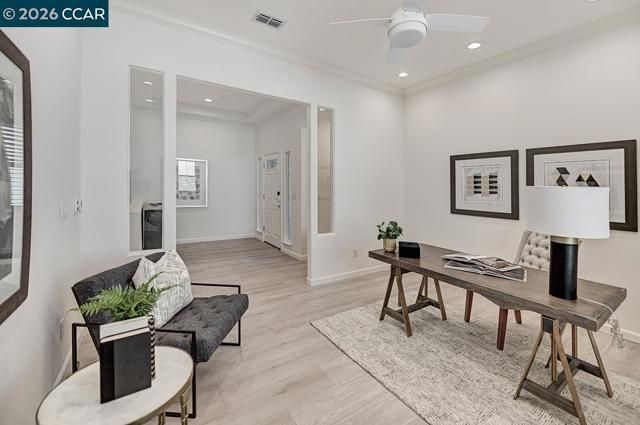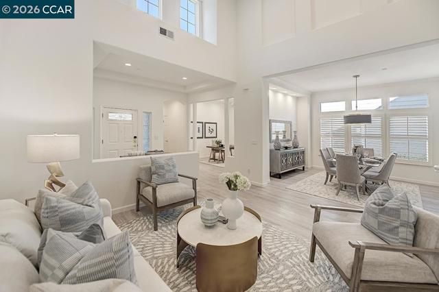 The highly sought-after Valley Oak model showcases perfectly placed windows that bathe the home in abundant natural light, creating a warm and inviting ambiance throughout. Nestled in a private, serene setting, this exceptional upscale residence is enhanced by beautiful views and lush landscaping. Designed with versatility and elegance in mind, the home features a unique architectural layout highlighted by soaring volume ceilings and premium finishes throughout. The spacious kitchen offers a generous breakfast nook that opens onto a private deck—ideal for morning coffee or al fresco dining—and flows seamlessly into the inviting family room, complete with a cozy gas fireplace, forming the perfect great room for everyday living and entertaining. The expansive primary suite serves as a tranquil retreat, featuring a luxurious en-suite bath with soaking tub, stall shower, and an oversized walk-in closet/dressing room. A spacious den provides flexibility to suit your lifestyle—ideal as a home office, media room, or library. The loft offers additional living space, perfect for relaxing or hosting grandchildren for overnight stays. Welcome home to one of Rossmoor’s finest residences—where comfort, elegance, and thoughtful design come together beautifully.