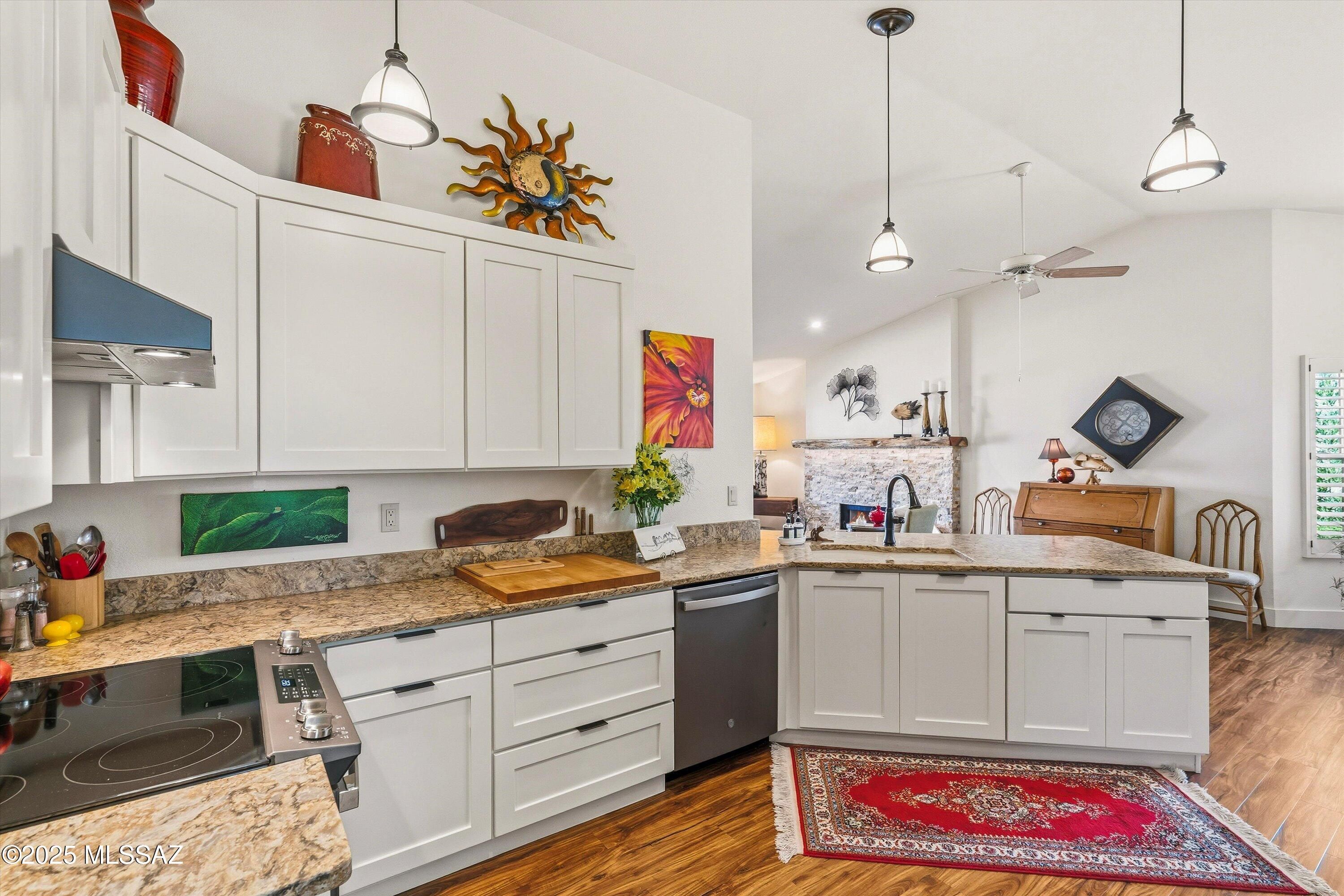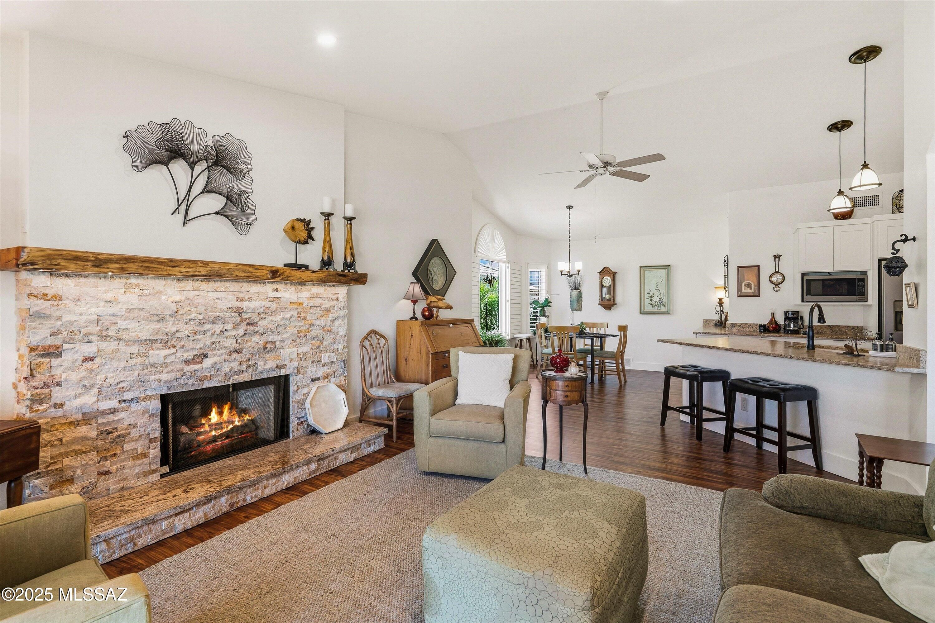 Exquisite 2BD/2BA +Den (2,137 sq ft) Topaz model on corner, cul-de-sac lot has been HIGHLY UPDATED inside & out and backs to a hill for ultimate privacy. Front flagstone patio and iron gated porch flow to a formal living/dining room with open concept family room and kitchen beyond. Showcasing an elegant interior boasting vaulted ceilings, plantation shutters and large picture windows throughout, this home has been updated with Luxury Vinyl Plank flooring throughout, quartz countertops in kitchen & baths, new windows & doors including custom entry door, plus fireplace with impressive stacked-stone surround, mesquite mantel and slab stone hearth in family room off patio. Chef's kitchen hosts ample cabinet and counter space, stainless appliances, breakfast bar, dining nook with bay window,