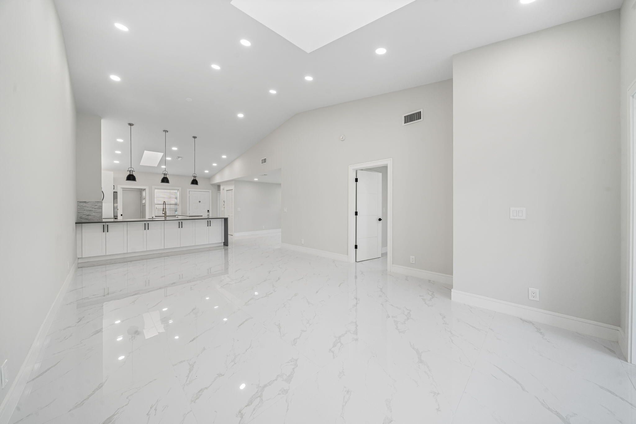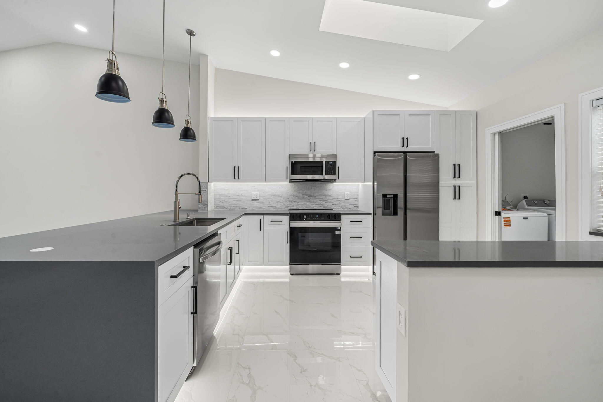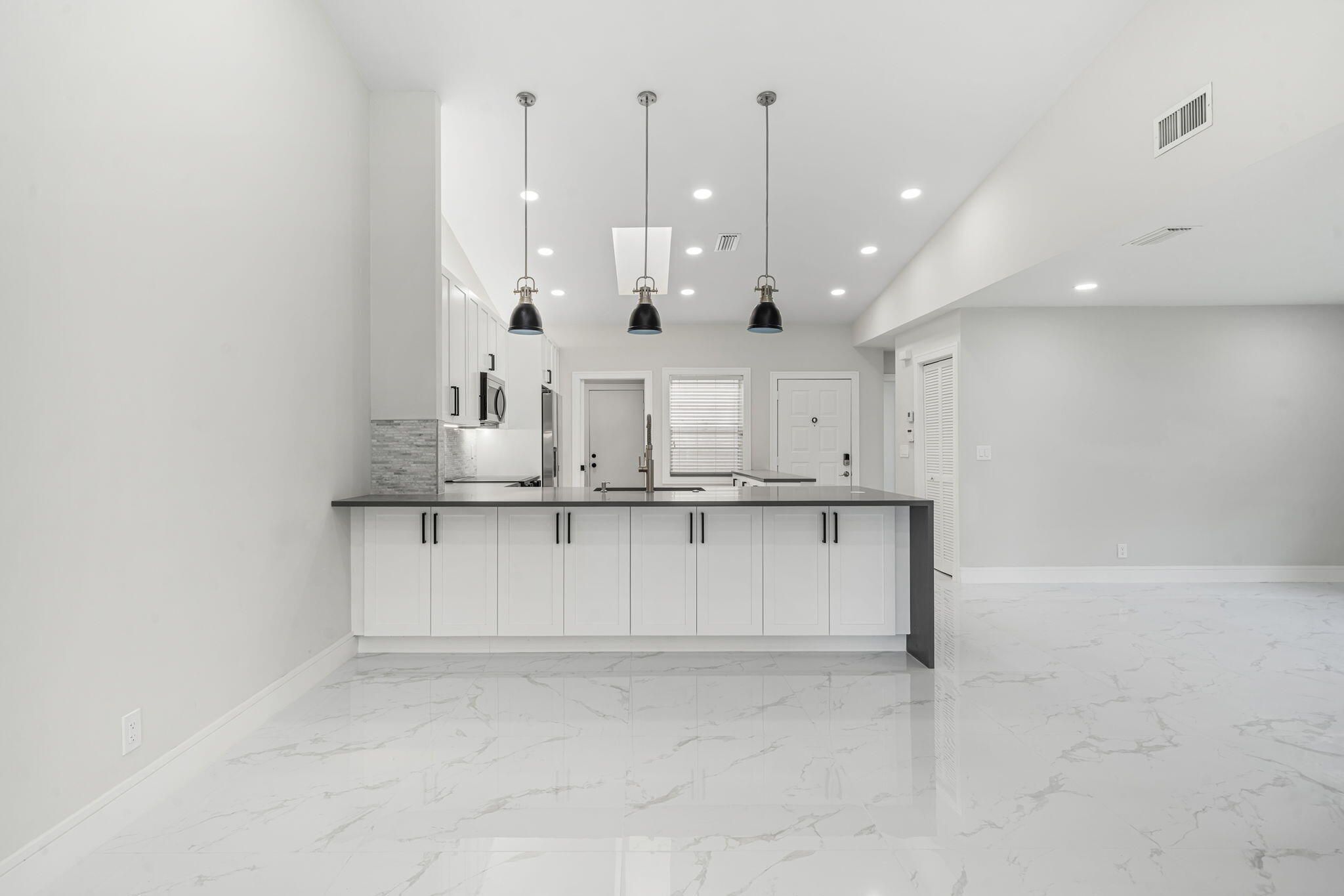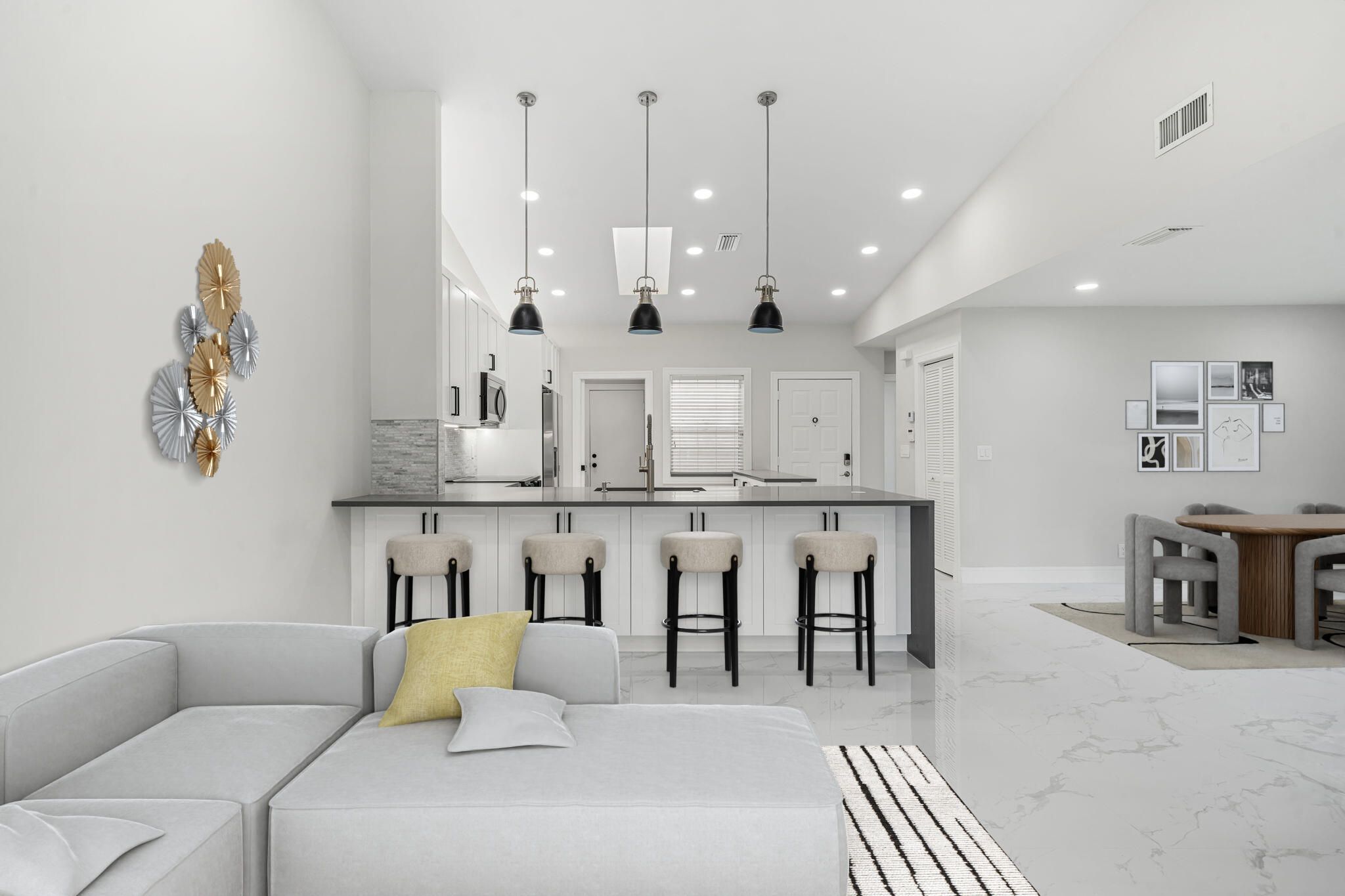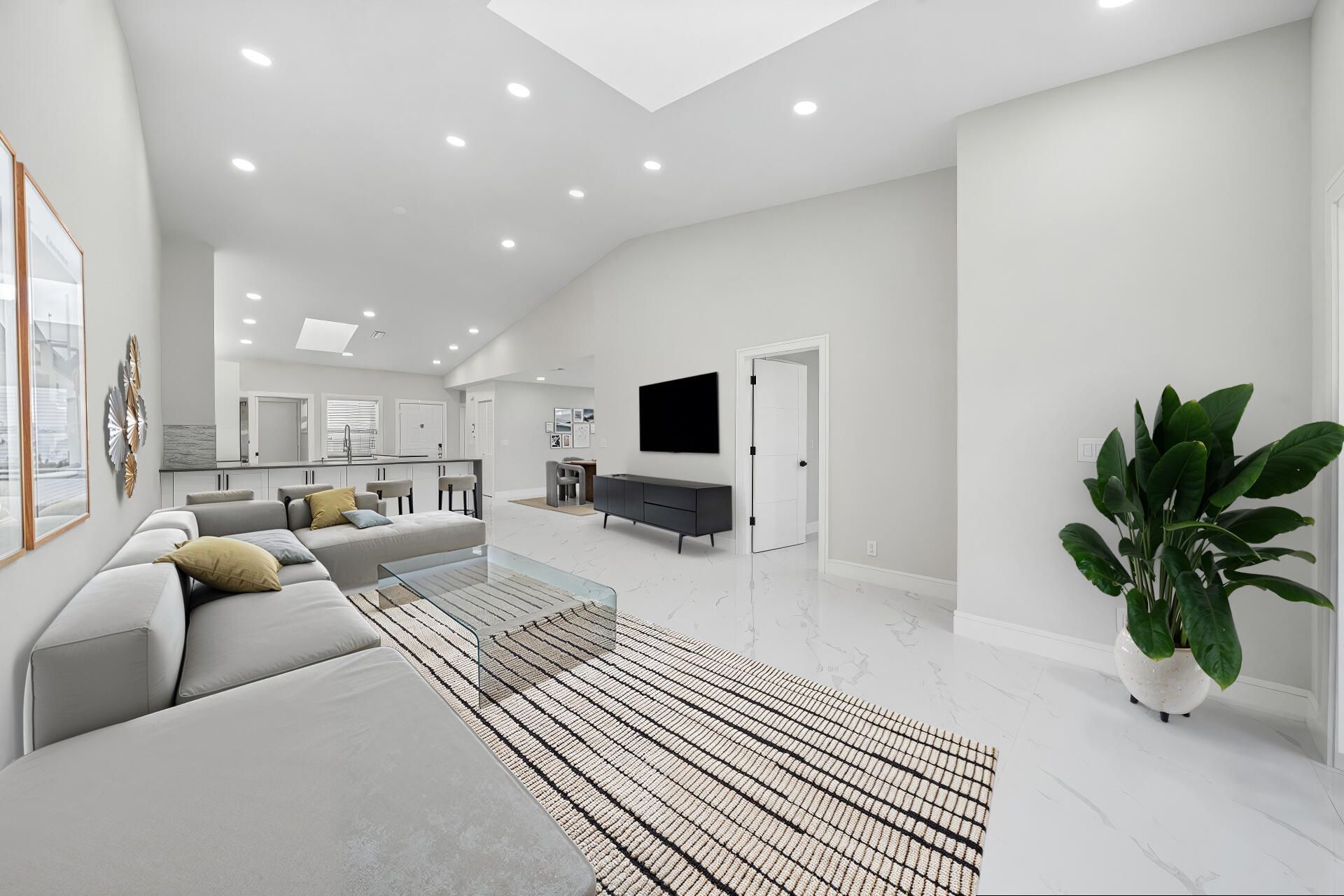 NEW ROOF COMING 2026! FULLY PAID BY SELLERS. Welcome to Huntington Pointe's largest Villa model! Completely renovated and professionally designed, this 2-bedroom, 2-bath residence with a den features modern upgrades throughout, including 32" x 32" imported porcelain tile flooring in every room. Two skylights fill the home with natural light, enhancing the bright and open feel. The fully remodeled patio has been seamlessly converted into interior living space and offers flexible use as a home office, den, or additional living area. Custom lighting highlights the home with LED mirrors, designer pendants, and recessed lighting in every room. The sleek kitchen offers white shaker cabinetry, stainless steel appliances, quartz countertops, and extensive lighting including under-cabinet, over-cabinet, and toe-kick illumination, along with abundant storage and a large pantry. Exterior features include a quiet street location, spacious driveway, epoxy-coated garage flooring, and lush landscaping. Huntington Pointe is a vibrant active adult community offering a newly renovated clubhouse, multiple swimming pools, social clubs, pickleball, a fitness center, sauna, steam room, on-site café, and more.