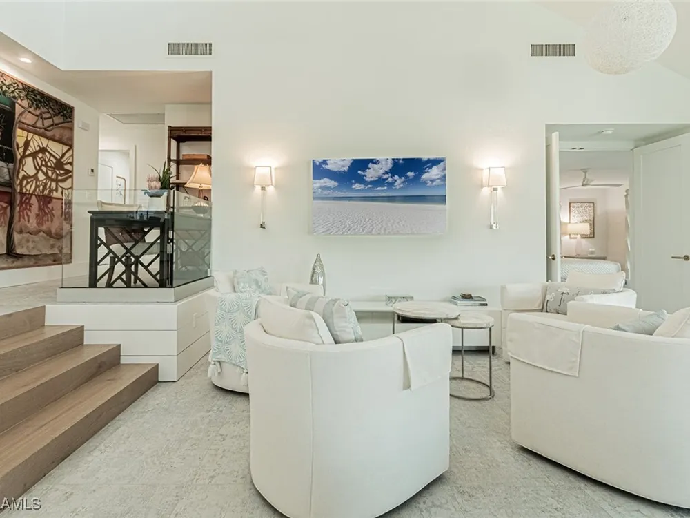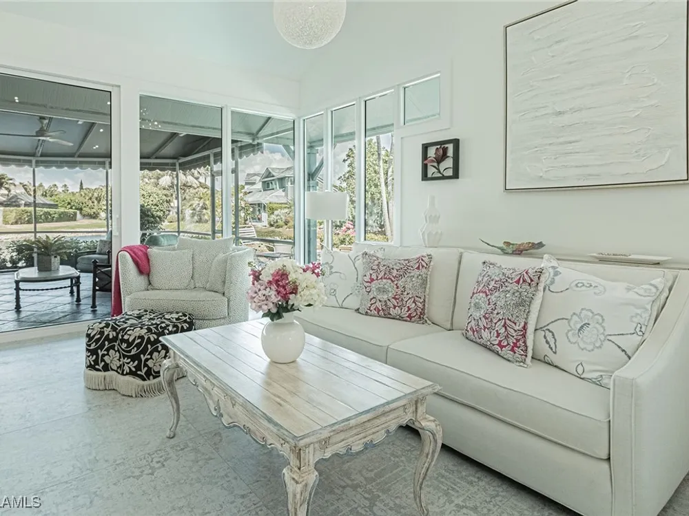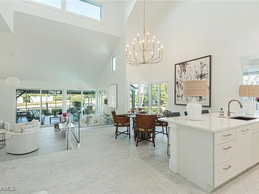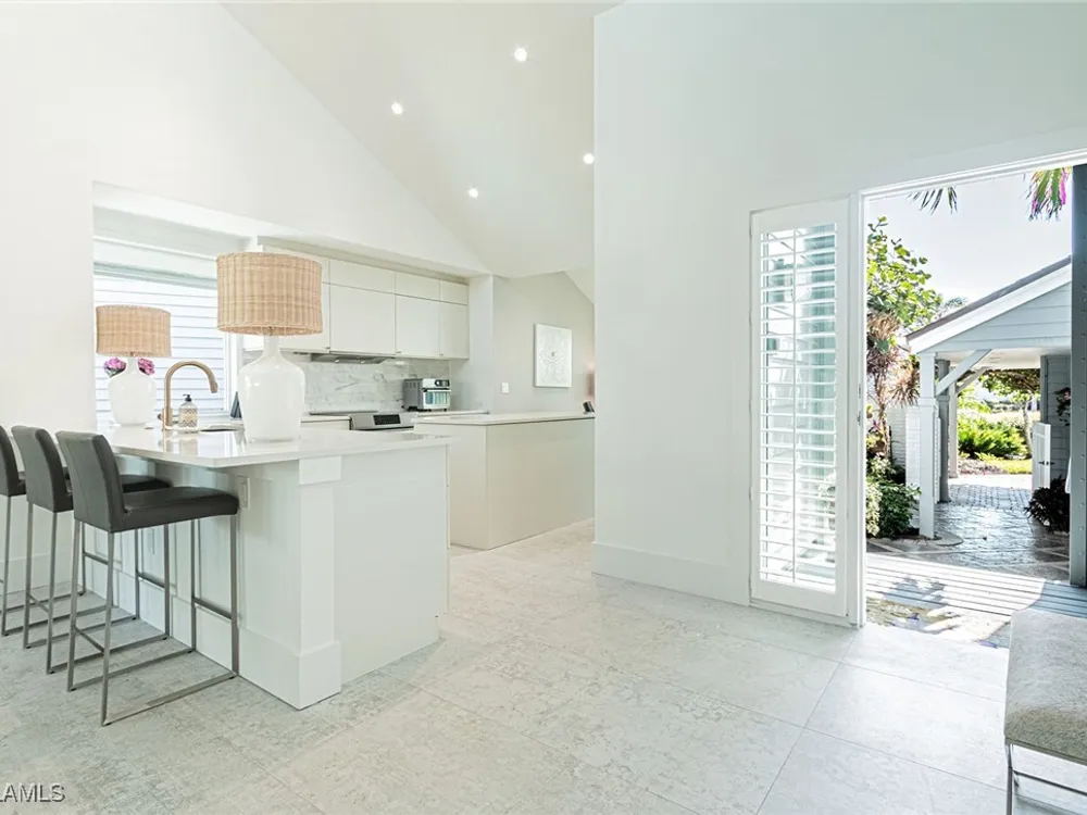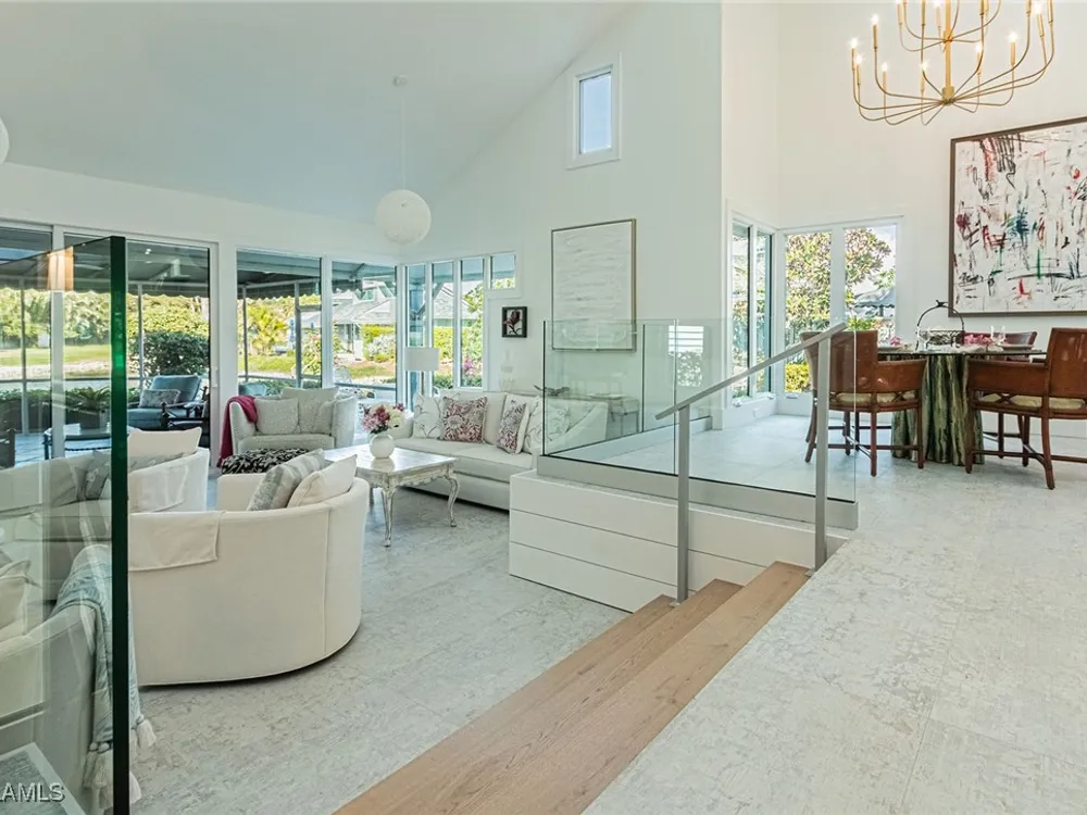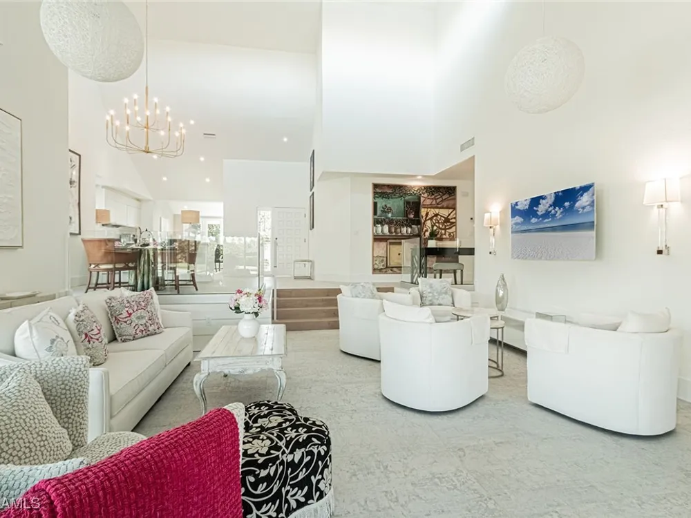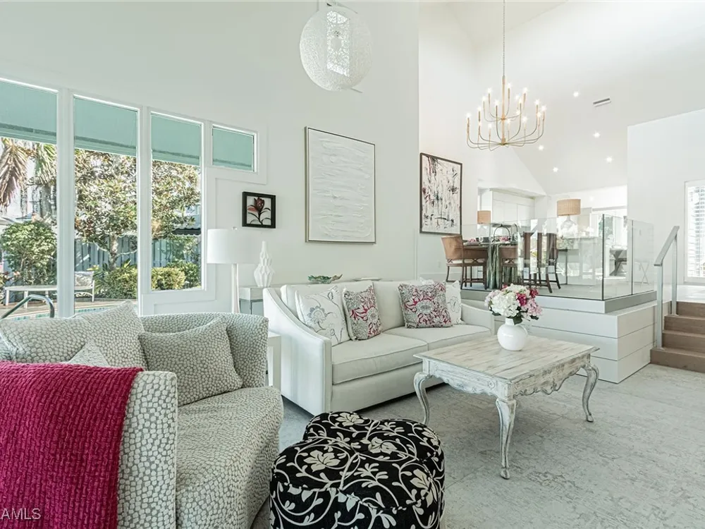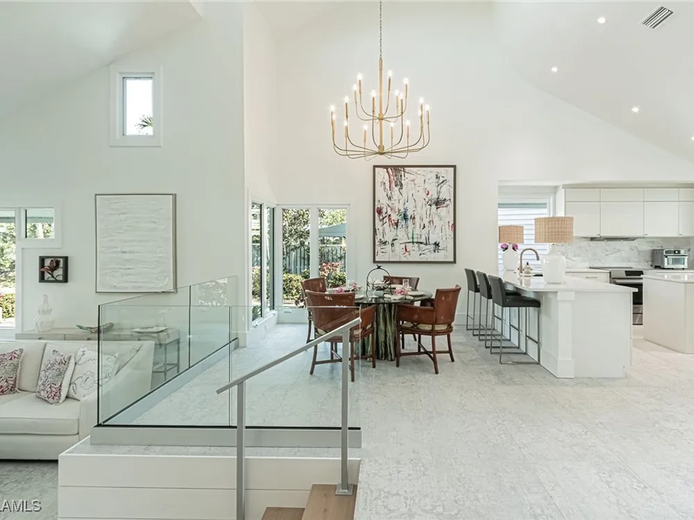 This rare, detached villa on a cul-de-sac in the sought-after, Nantucket-style community of Bridgeway Villas boasts one of the community’s best lake views. Renovated top to bottom, this three-bedroom, two-bath home features soaring ceilings, abundant natural light from clerestory windows and skylight, spectacular views inside and out of the pool/spa and lake, and designer furnishings, art and accessories. The open-concept living area includes a sunken living room with comfortable seating. Elegant glass railings and three 8-foot-wide hardwood steps separate the two living levels but do not interfere with the view. The upper level includes the front entry, a dining area with seating for six, and kitchen with island, custom built-in dining nook for four, a breakfast bar with seating for three, quartz counters, high-end appliances, off-white cabinetry and quartz counters. The primary suite offers a king-size bed, large primary bath with double vanity, large walk in closet with built-ins, additional closet, spacious shower, and separate toilet room. Two guest bedrooms, one with a king bed and the other with twins, provide ample space for visitors. Enjoy indoor/outdoor living at its finest with a spacious screened lanai offering comfortable seating and dining areas, a private pool and spa overlooking the lake, and lush, colorful gardens. Exterior updates include a newer roof, air conditioner, hurricane windows and doors, lighting and landscaping. Bridgeway Villas is just a short distance to Waterside Shops and Artis-Naples, and a quick tram ride to Pelican Bay’s private beach with waterfront dining and activities. Residents also enjoy access to Pelican Bay’s unparalleled amenities, including tennis, pickleball, a community center, tram service to Pelican Bay’s two beach clubs with restaurants, bars, snack bars and more. Lounges and umbrellas are provided complimentary at the beach and the attendants set them up for you. No more hauling equipment to the beach!