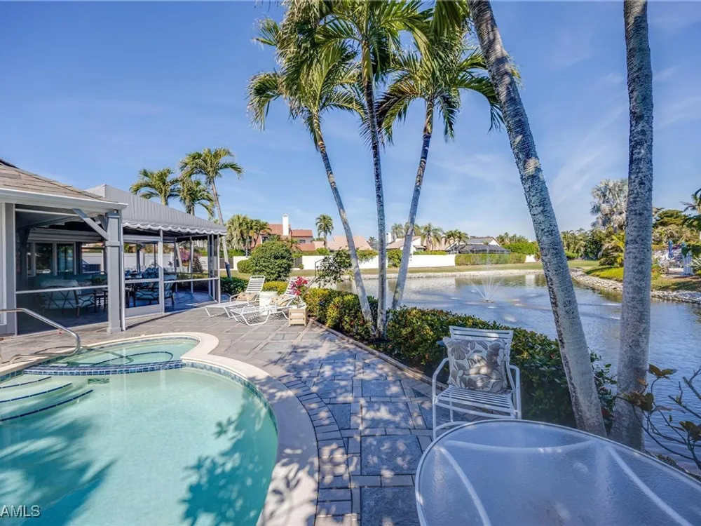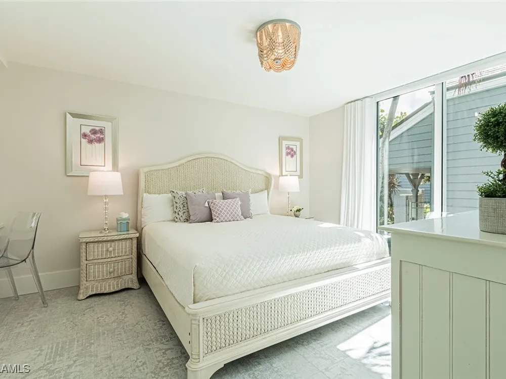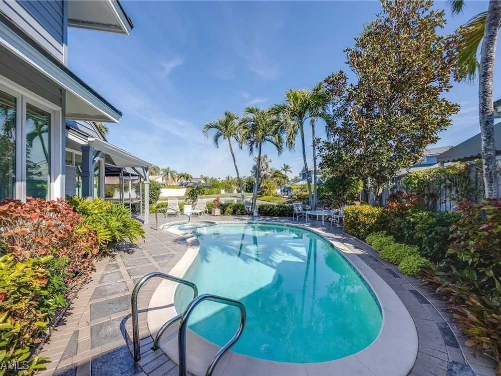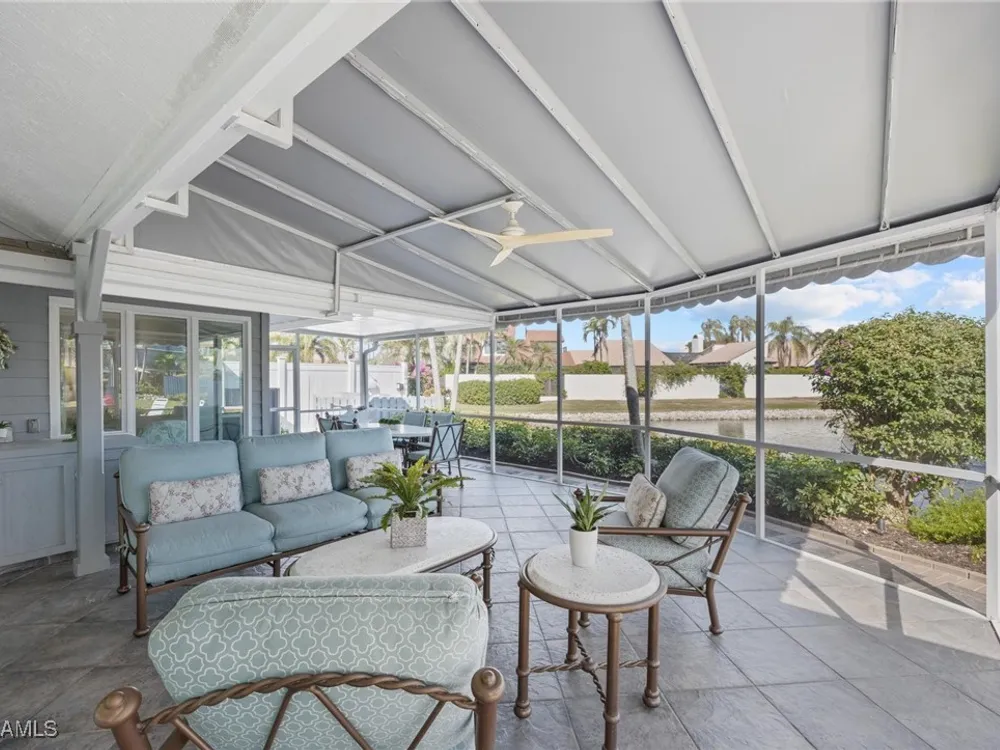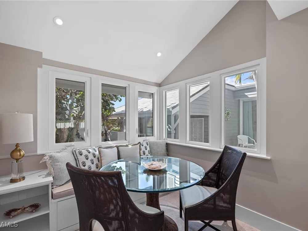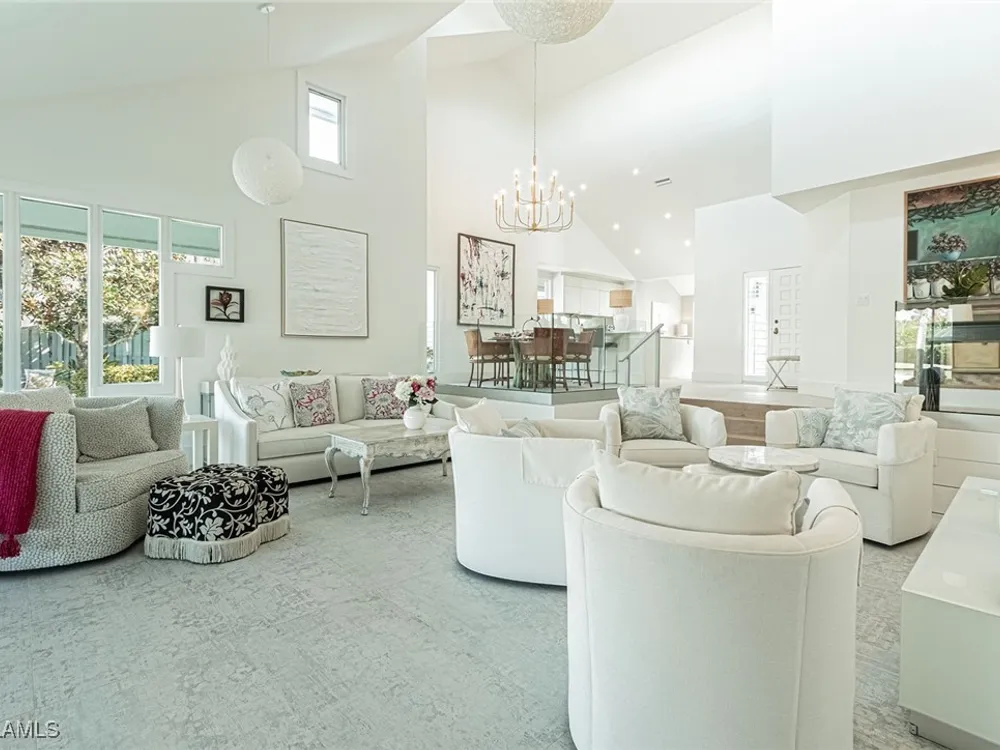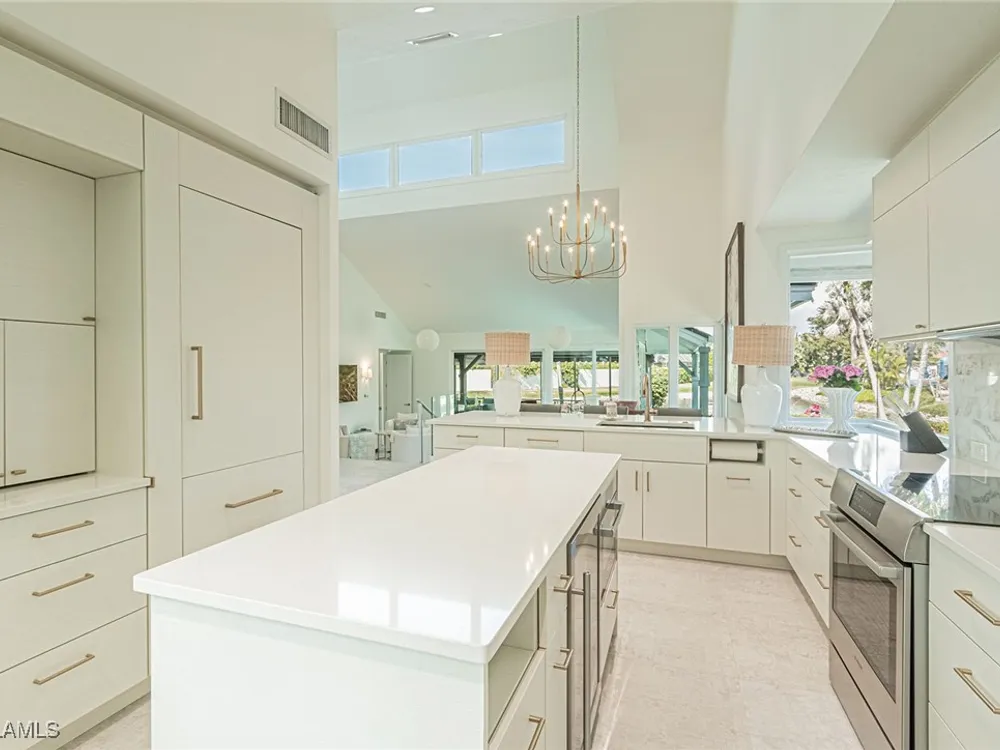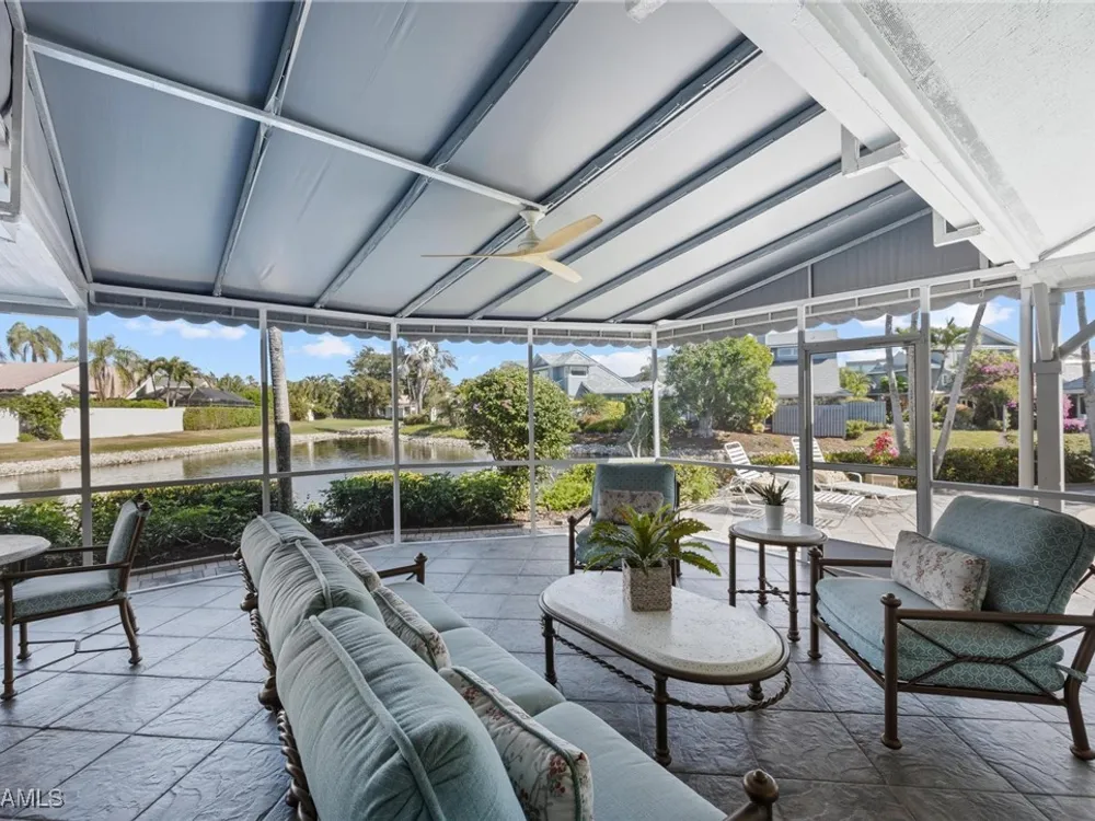 This rare, detached villa on a cul-de-sac in the sought-after, Nantucket-style community of Bridgeway Villas boasts one of the community’s best lake views. Renovated top to bottom, this three-bedroom, two-bath home features soaring ceilings, abundant natural light from clerestory windows and skylight, spectacular views inside and out of the pool/spa and lake, and designer furnishings, art and accessories. The open-concept living area includes a sunken living room with comfortable seating. Elegant glass railings and three 8-foot-wide hardwood steps separate the two living levels but do not interfere with the view. The upper level includes the front entry, a dining area with seating for six, and kitchen with island, custom built-in dining nook for four, a breakfast bar with seating for three, quartz counters, high-end appliances, off-white cabinetry and quartz counters. The primary suite offers a king-size bed, large primary bath with double vanity, large walk in closet with built-ins, additional closet, spacious shower, and separate toilet room. Two guest bedrooms, one with a king bed and the other with twins, provide ample space for visitors. Enjoy indoor/outdoor living at its finest with a spacious screened lanai offering comfortable seating and dining areas, a private pool and spa overlooking the lake, and lush, colorful gardens. Exterior updates include a newer roof, air conditioner, hurricane windows and doors, lighting and landscaping. Bridgeway Villas is just a short distance to Waterside Shops and Artis-Naples, and a quick tram ride to Pelican Bay’s private beach with waterfront dining and activities. Residents also enjoy access to Pelican Bay’s unparalleled amenities, including tennis, pickleball, a community center, tram service to Pelican Bay’s two beach clubs with restaurants, bars, snack bars and more. Lounges and umbrellas are provided complimentary at the beach and the attendants set them up for you. No more hauling equipment to the beach!