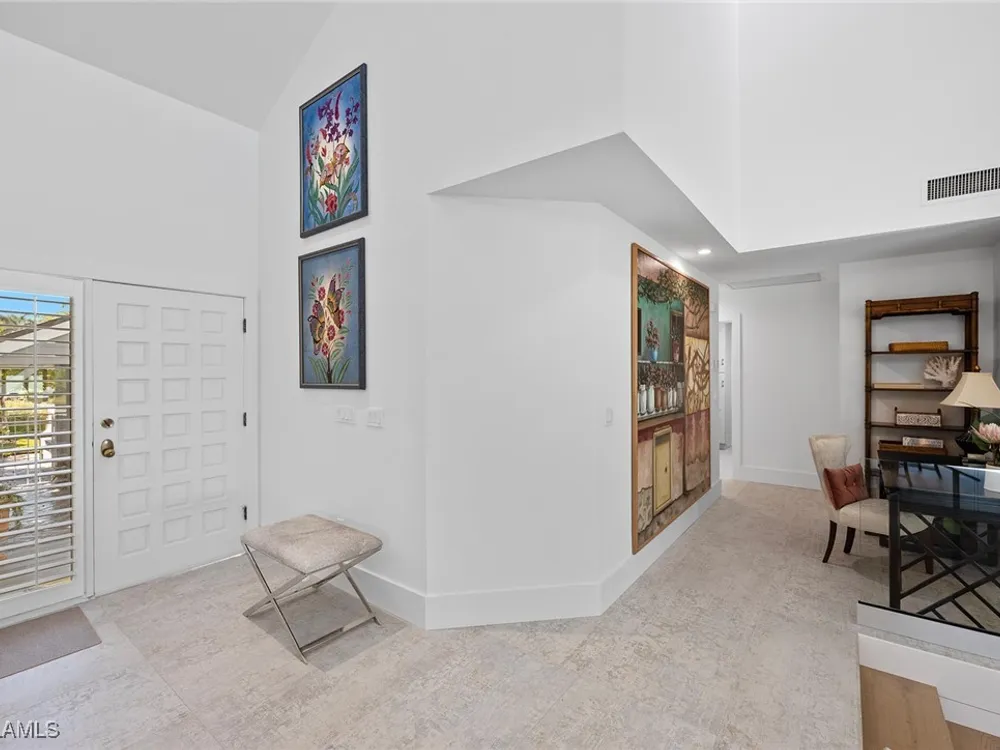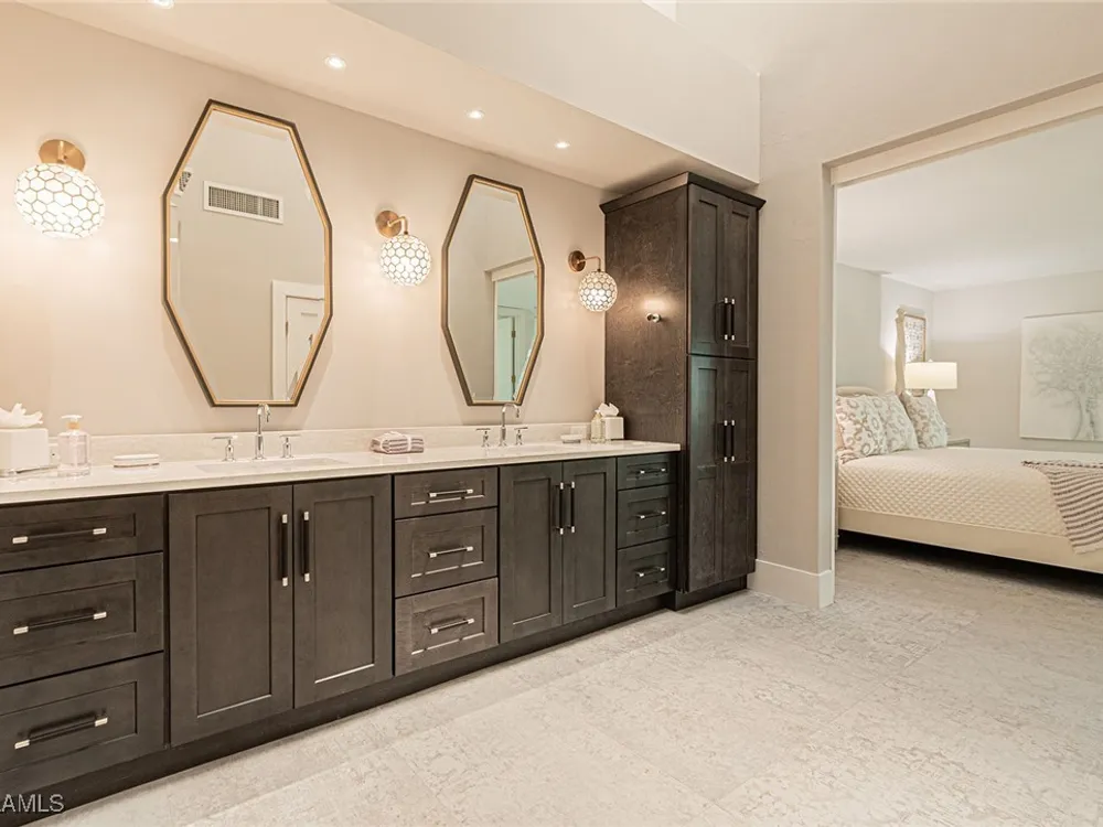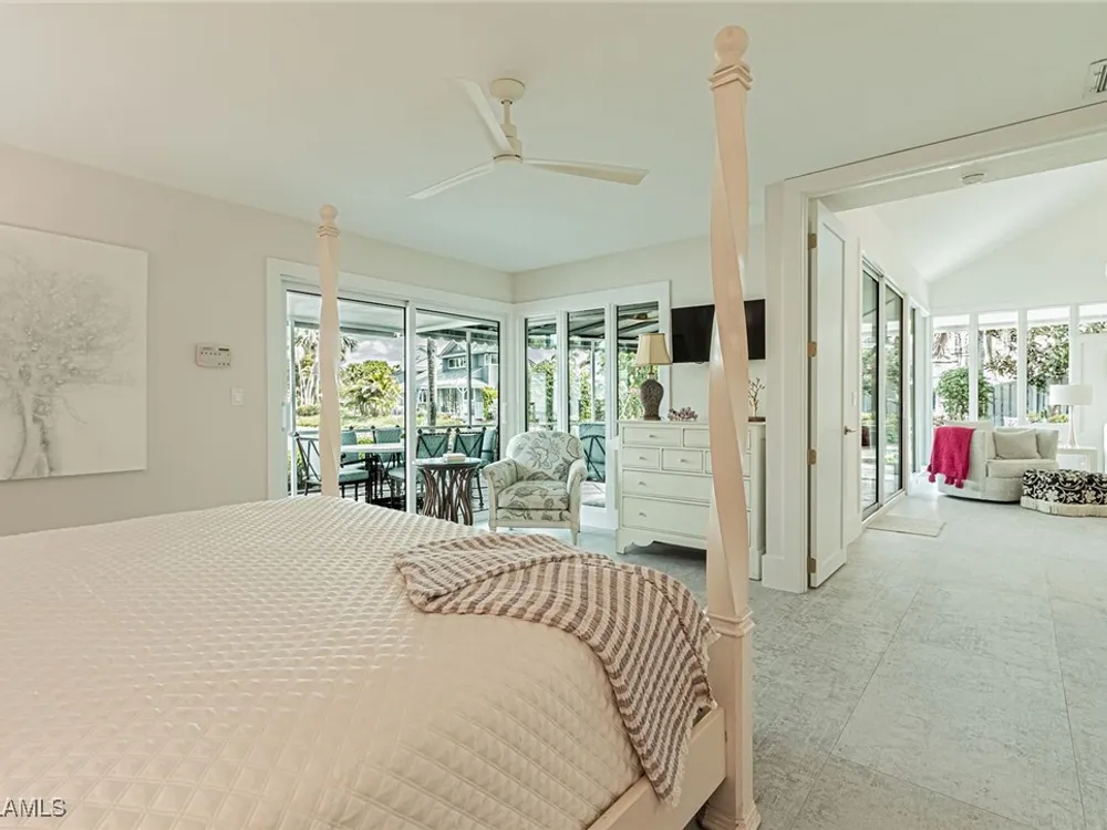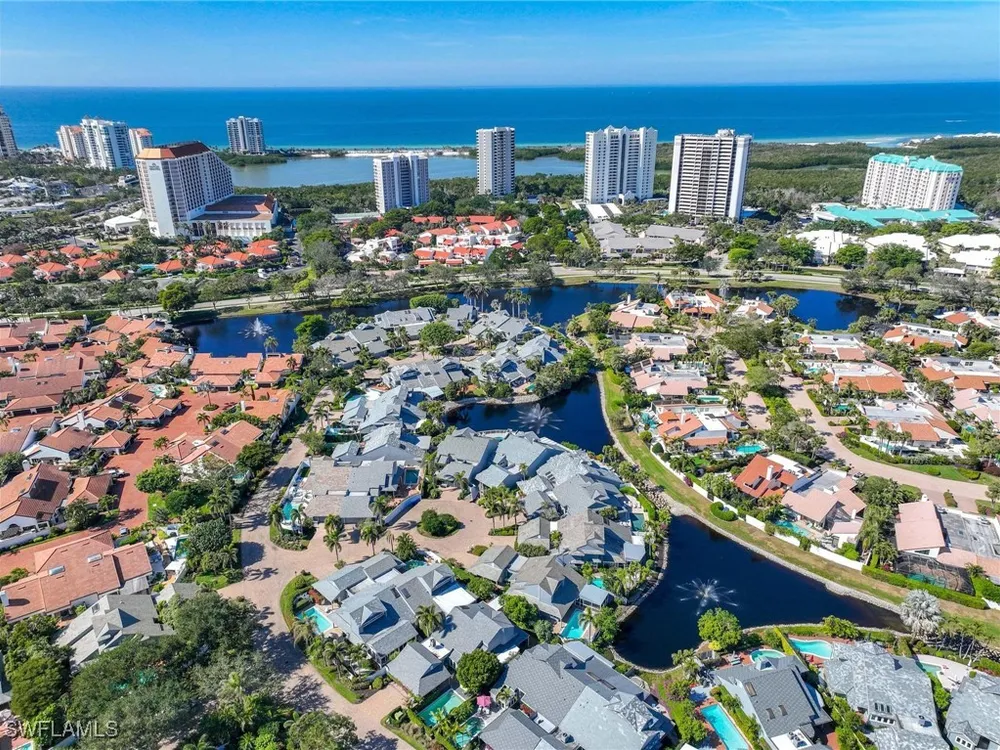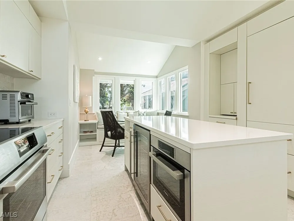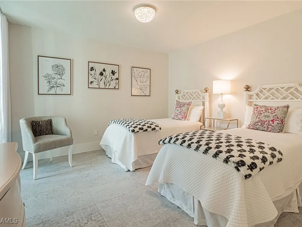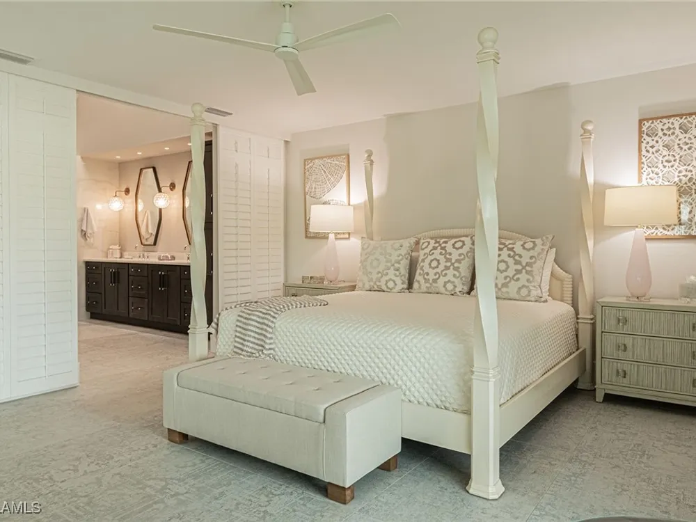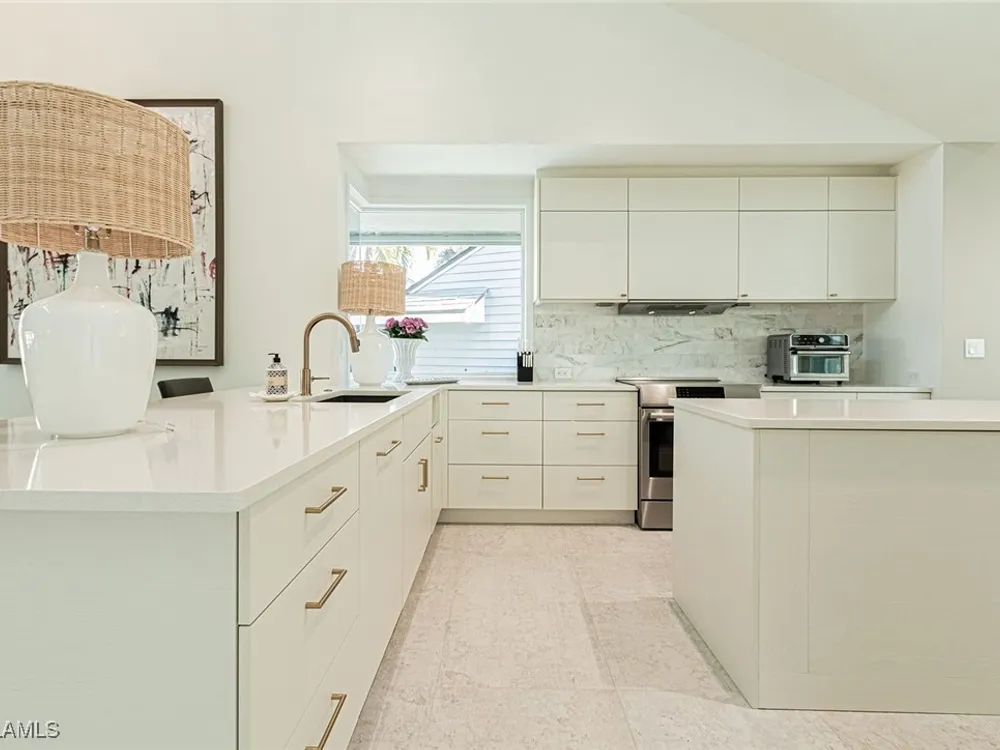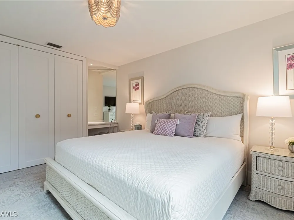 This rare, detached villa on a cul-de-sac in the sought-after, Nantucket-style community of Bridgeway Villas boasts one of the community’s best lake views. Renovated top to bottom, this three-bedroom, two-bath home features soaring ceilings, abundant natural light from clerestory windows and skylight, spectacular views inside and out of the pool/spa and lake, and designer furnishings, art and accessories. The open-concept living area includes a sunken living room with comfortable seating. Elegant glass railings and three 8-foot-wide hardwood steps separate the two living levels but do not interfere with the view. The upper level includes the front entry, a dining area with seating for six, and kitchen with island, custom built-in dining nook for four, a breakfast bar with seating for three, quartz counters, high-end appliances, off-white cabinetry and quartz counters. The primary suite offers a king-size bed, large primary bath with double vanity, large walk in closet with built-ins, additional closet, spacious shower, and separate toilet room. Two guest bedrooms, one with a king bed and the other with twins, provide ample space for visitors. Enjoy indoor/outdoor living at its finest with a spacious screened lanai offering comfortable seating and dining areas, a private pool and spa overlooking the lake, and lush, colorful gardens. Exterior updates include a newer roof, air conditioner, hurricane windows and doors, lighting and landscaping. Bridgeway Villas is just a short distance to Waterside Shops and Artis-Naples, and a quick tram ride to Pelican Bay’s private beach with waterfront dining and activities. Residents also enjoy access to Pelican Bay’s unparalleled amenities, including tennis, pickleball, a community center, tram service to Pelican Bay’s two beach clubs with restaurants, bars, snack bars and more. Lounges and umbrellas are provided complimentary at the beach and the attendants set them up for you. No more hauling equipment to the beach!