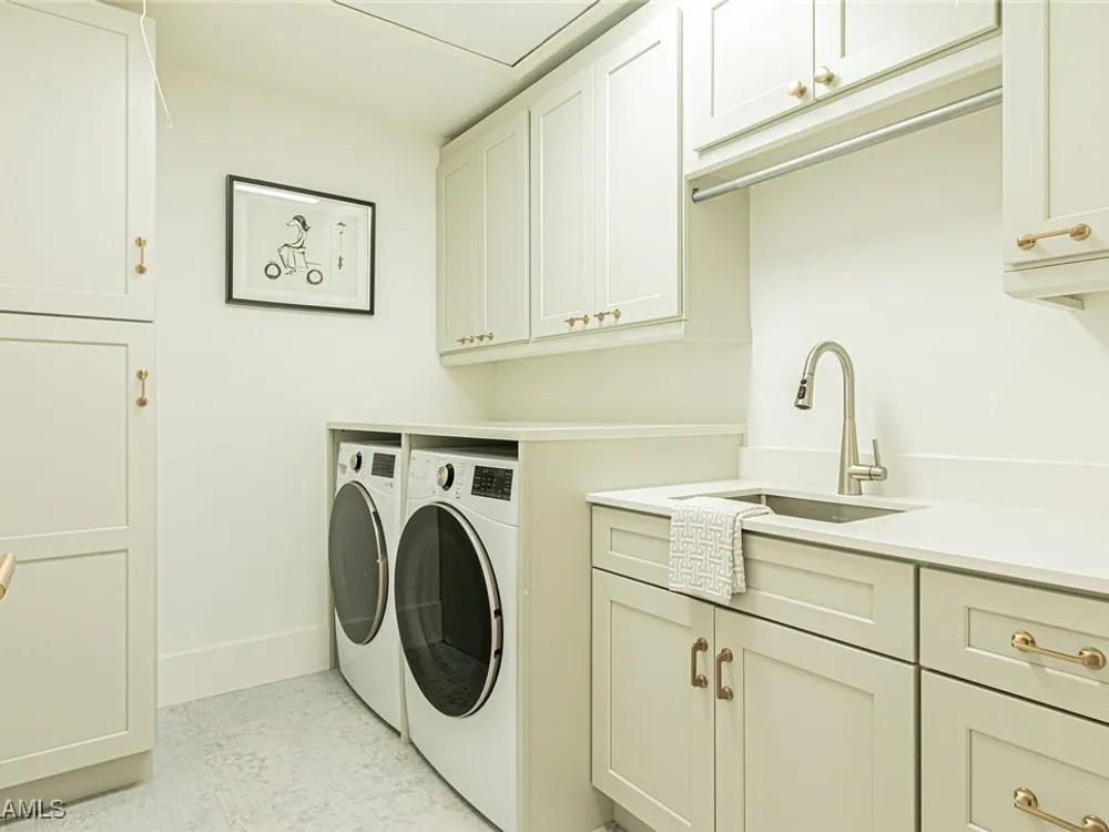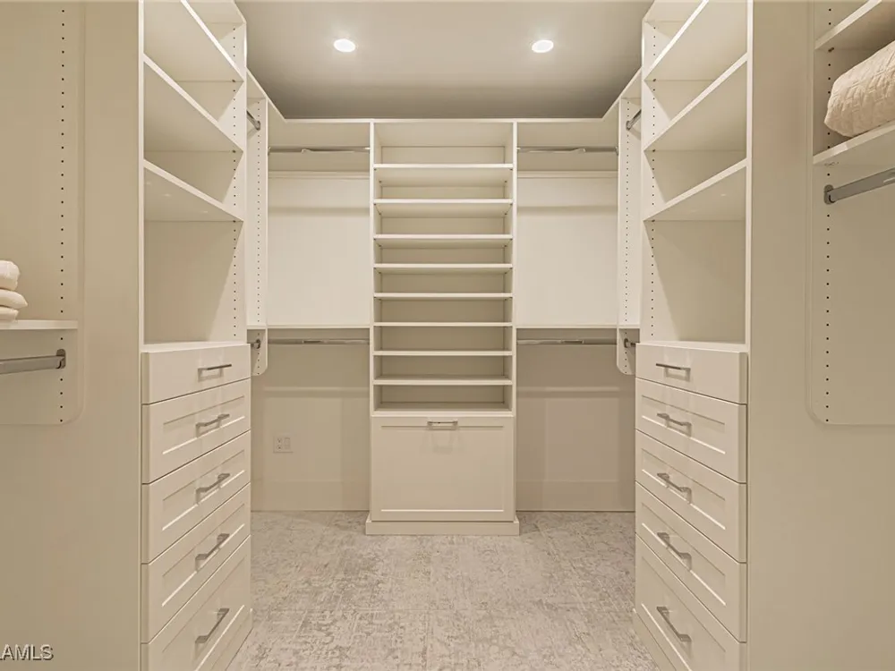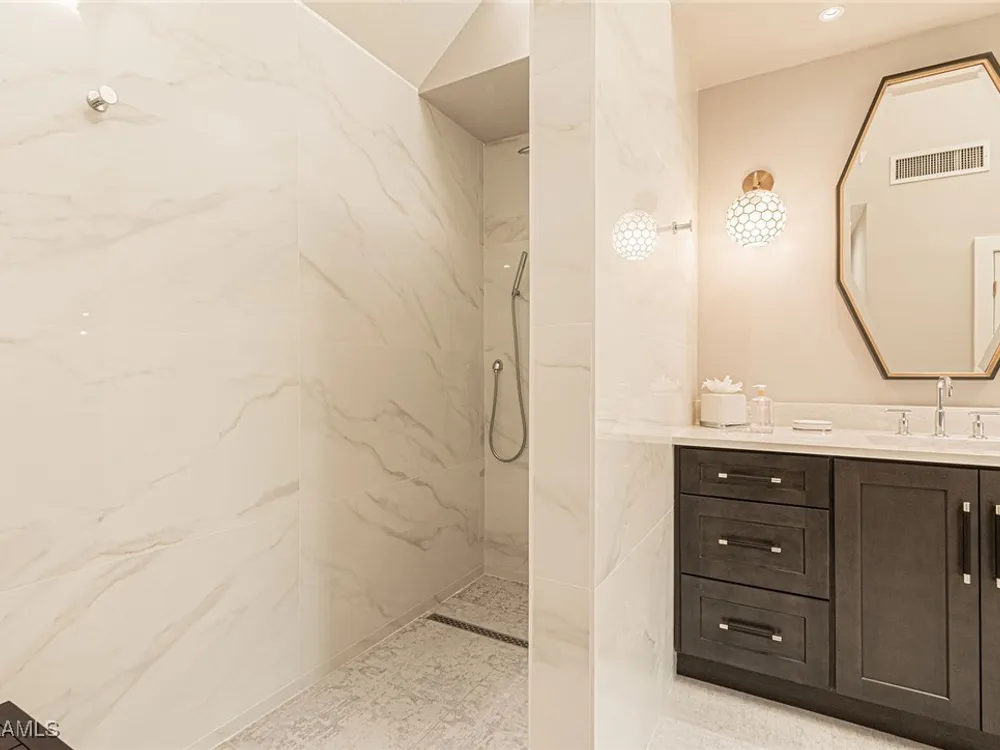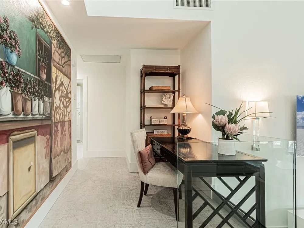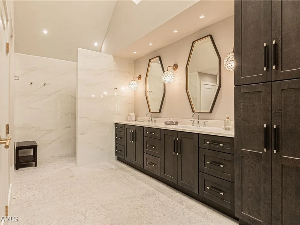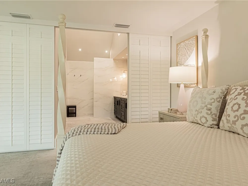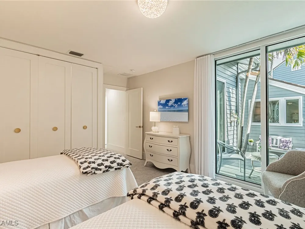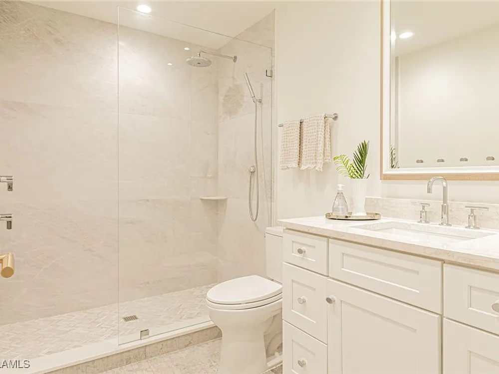This rare, detached villa on a cul-de-sac in the sought-after, Nantucket-style community of Bridgeway Villas boasts one of the community’s best lake views. Renovated top to bottom, this three-bedroom, two-bath home features soaring ceilings, abundant natural light from clerestory windows and skylight, spectacular views inside and out of the pool/spa and lake, and designer furnishings, art and accessories. The open-concept living area includes a sunken living room with comfortable seating. Elegant glass railings and three 8-foot-wide hardwood steps separate the two living levels but do not interfere with the view. The upper level includes the front entry, a dining area with seating for six, and kitchen with island, custom built-in dining nook for four, a breakfast bar with seating for three, quartz counters, high-end appliances, off-white cabinetry and quartz counters. The primary suite offers a king-size bed, large primary bath with double vanity, large walk in closet with built-ins, additional closet, spacious shower, and separate toilet room. Two guest bedrooms, one with a king bed and the other with twins, provide ample space for visitors. Enjoy indoor/outdoor living at its finest with a spacious screened lanai offering comfortable seating and dining areas, a private pool and spa overlooking the lake, and lush, colorful gardens. Exterior updates include a newer roof, air conditioner, hurricane windows and doors, lighting and landscaping. Bridgeway Villas is just a short distance to Waterside Shops and Artis-Naples, and a quick tram ride to Pelican Bay’s private beach with waterfront dining and activities. Residents also enjoy access to Pelican Bay’s unparalleled amenities, including tennis, pickleball, a community center, tram service to Pelican Bay’s two beach clubs with restaurants, bars, snack bars and more. Lounges and umbrellas are provided complimentary at the beach and the attendants set them up for you. No more hauling equipment to the beach!