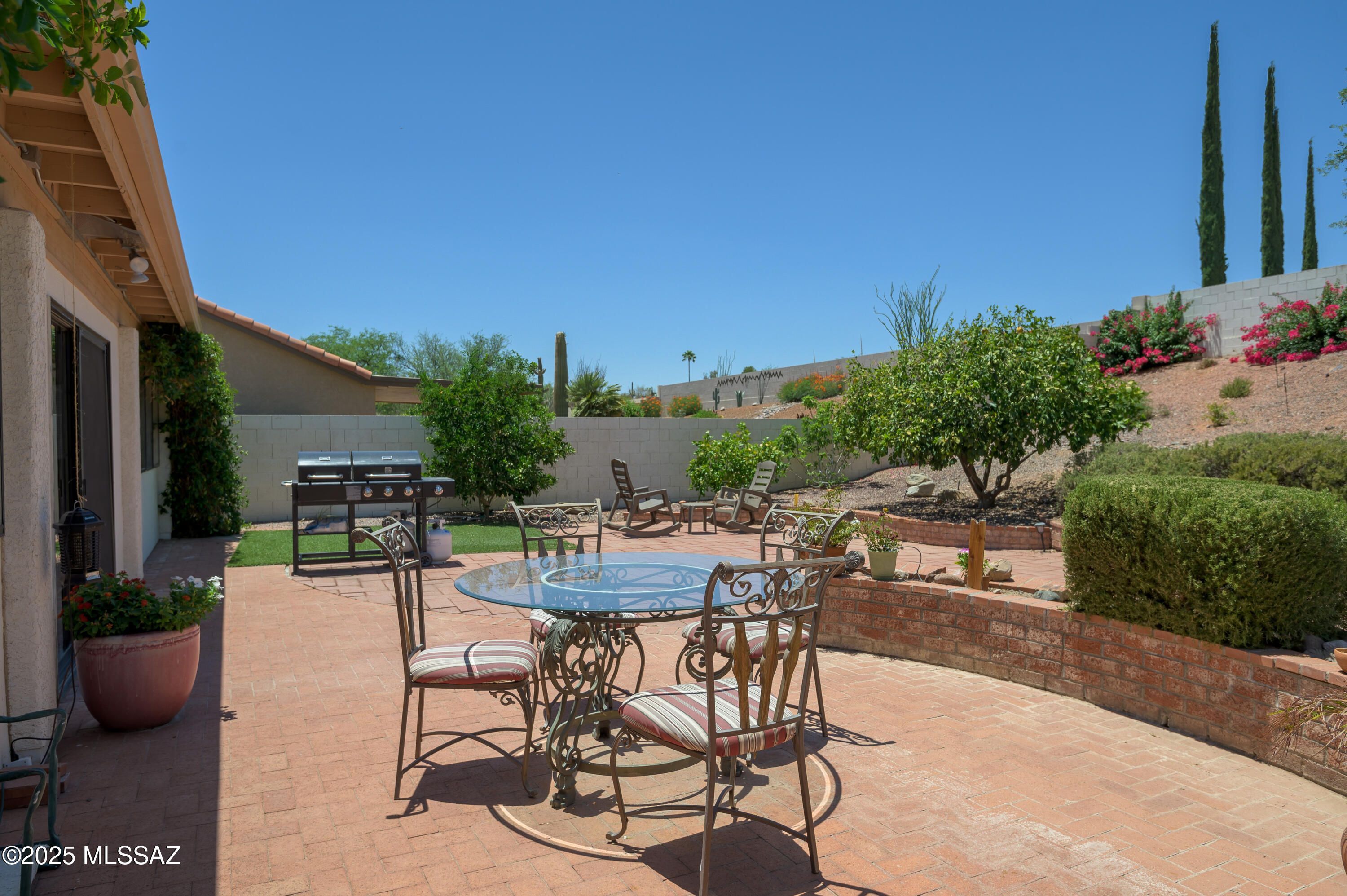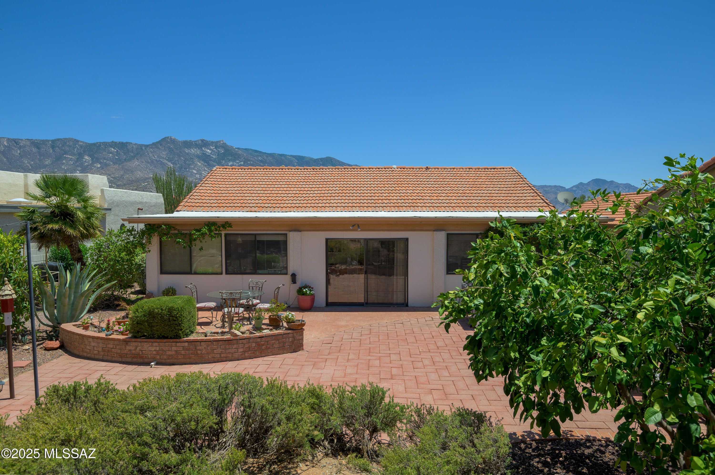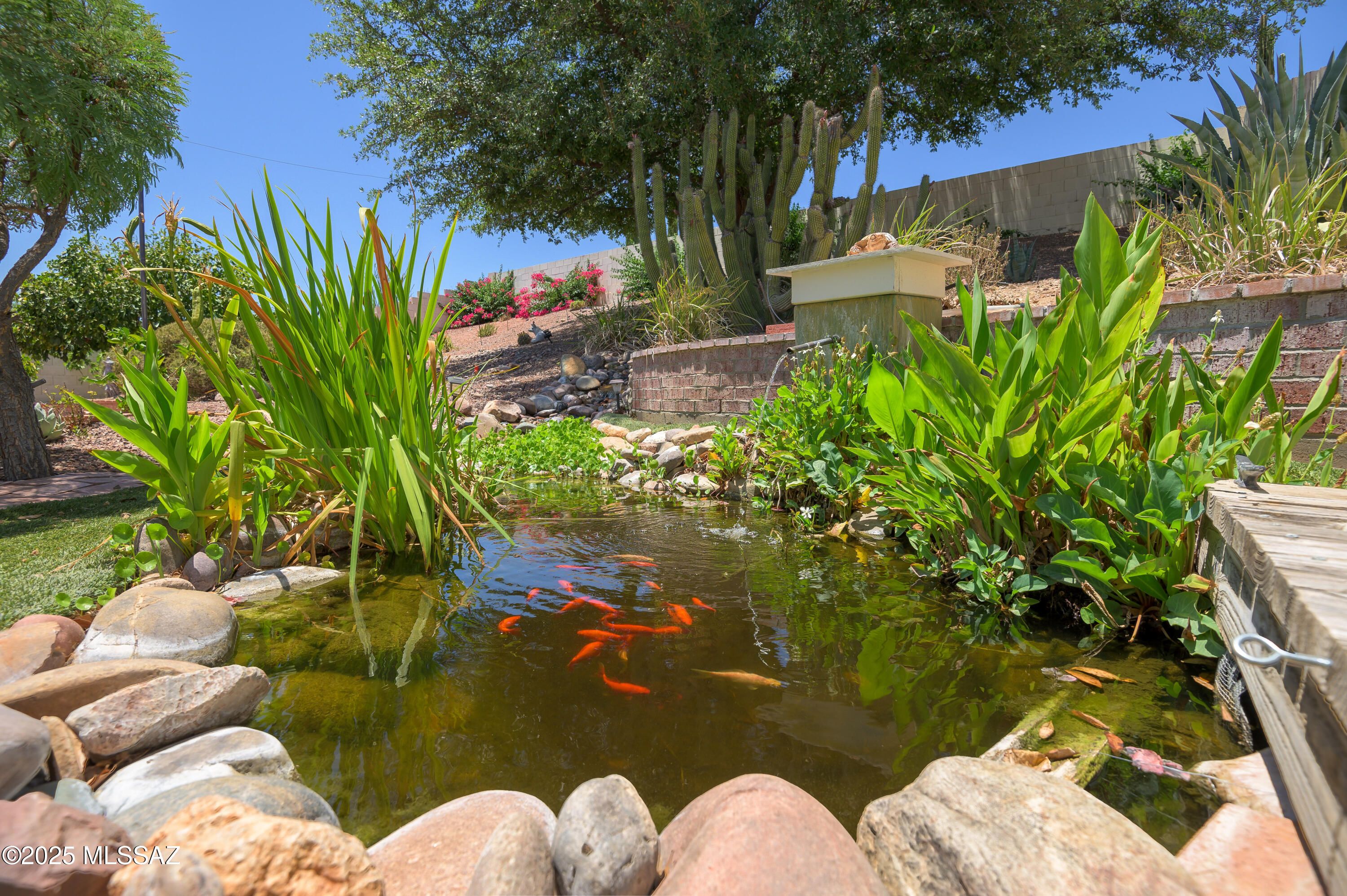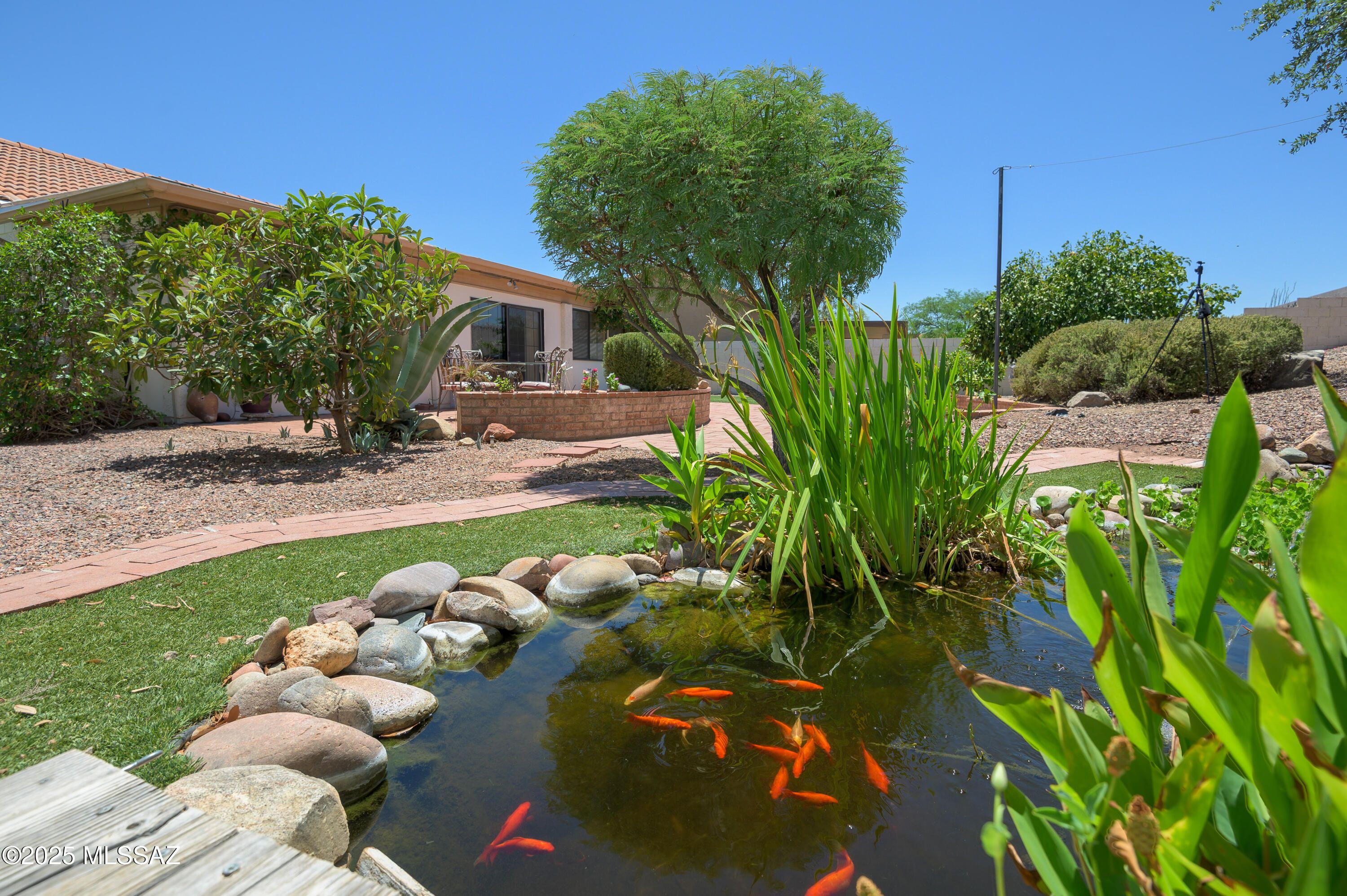 Charming 2BR/2BA with ~300 sq. ft. enclosed Arizona room (not included in SF) featuring portable AC and heating--perfect as an entertainment space, home office, cozy den, or extra guest room. Backyard oasis offers quiet serenity, with a low-maintenance cascading waterfall flowing into a pond, creating a peaceful retreat despite backing a less-traveled through street. Kitchen shines with abundant tongue-and-groove cabinetry, multiple pullouts, and a breakfast nook with Catalina views. Recent upgrades include HVAC (2025), water heater (2023), and garage door opener (2024) (ask your agent for the list of additional improvements). Lovingly maintained with improvements galore--move-in ready for your Arizona lifestyle!