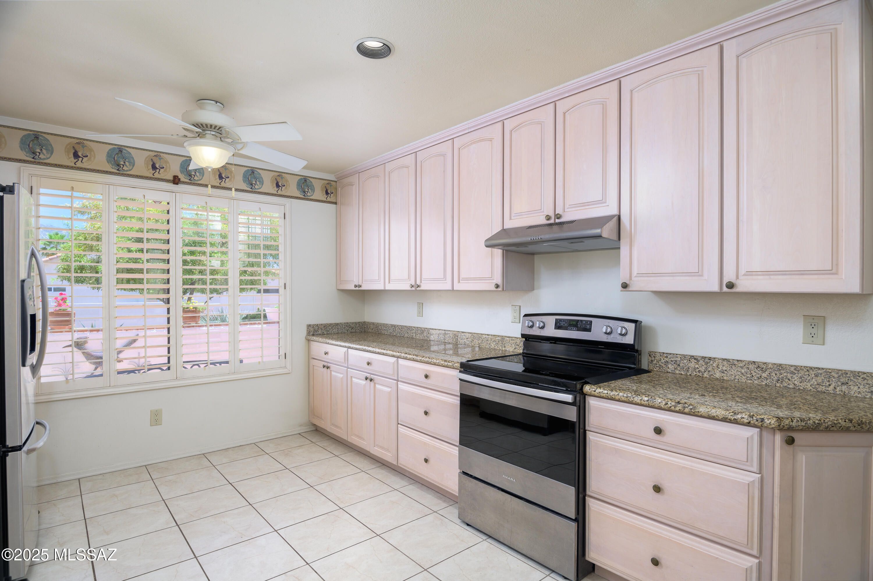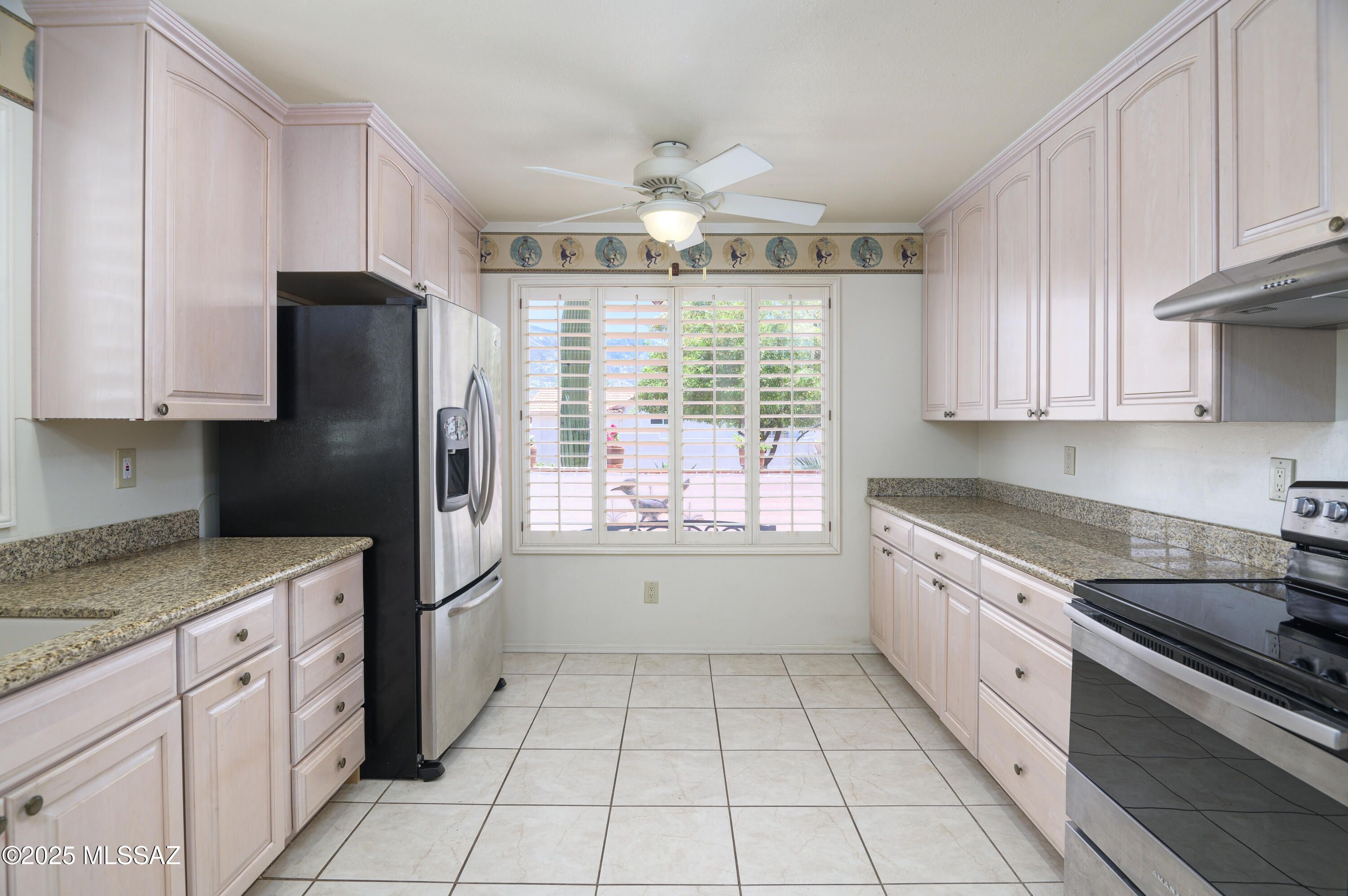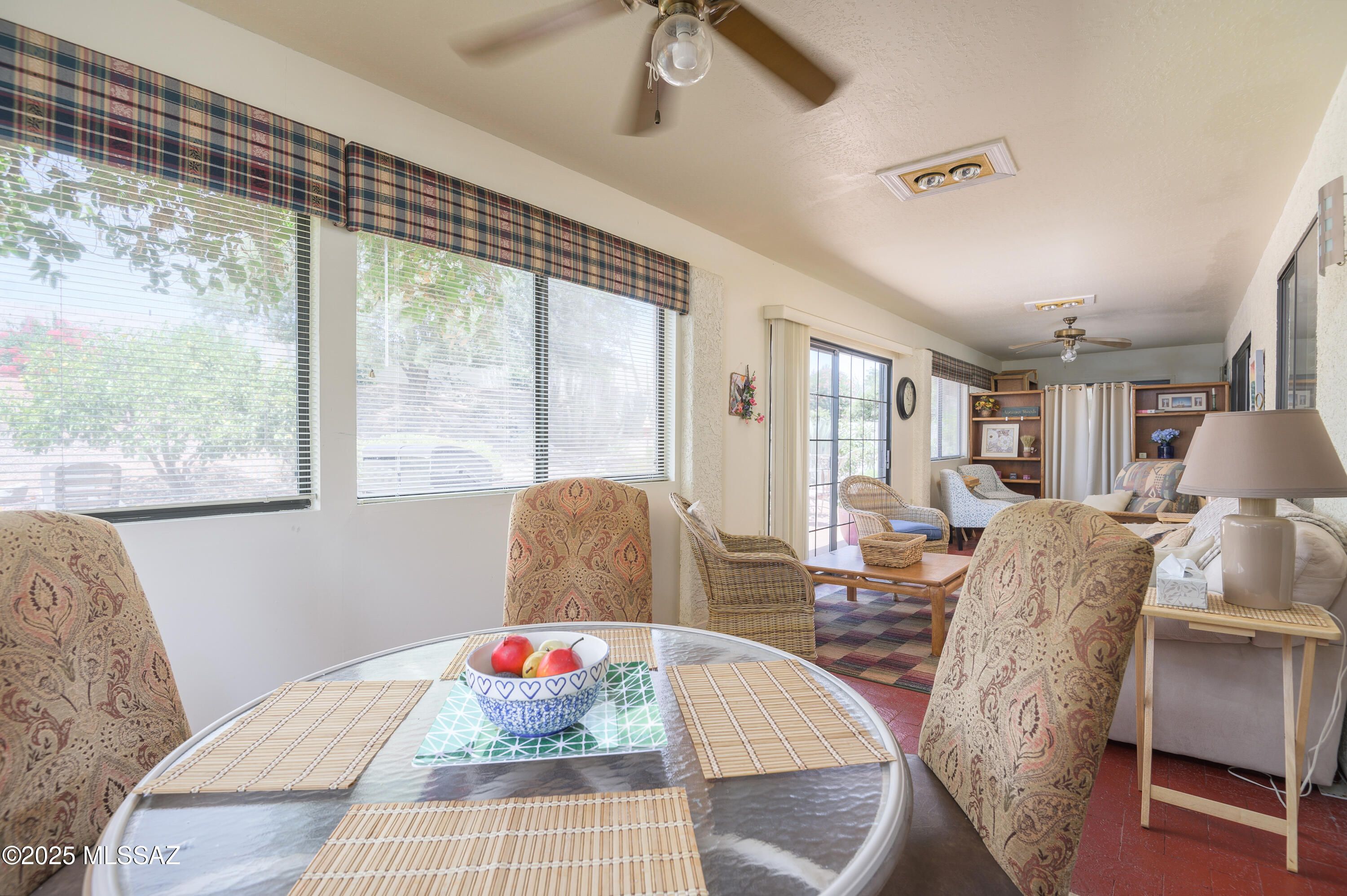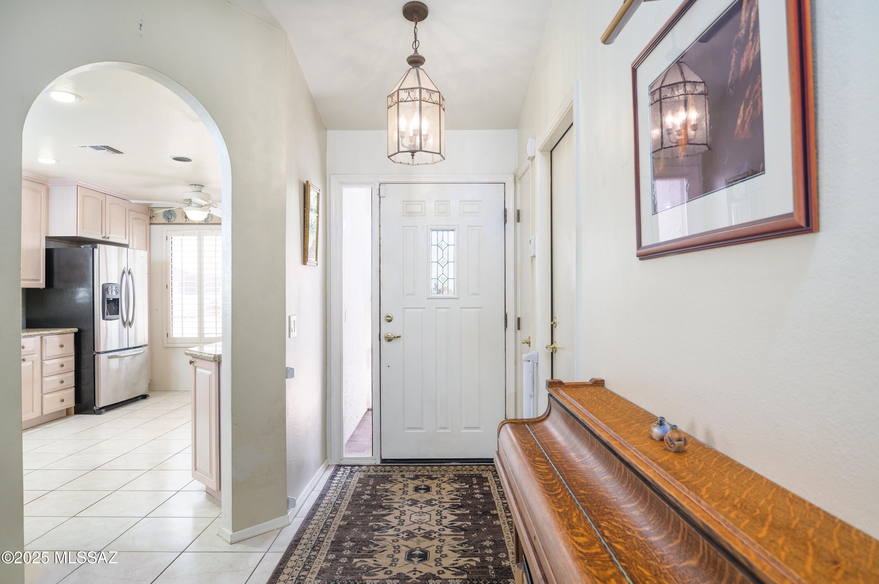 Charming 2BR/2BA with ~300 sq. ft. enclosed Arizona room (not included in SF) featuring portable AC and heating--perfect as an entertainment space, home office, cozy den, or extra guest room. Backyard oasis offers quiet serenity, with a low-maintenance cascading waterfall flowing into a pond, creating a peaceful retreat despite backing a less-traveled through street. Kitchen shines with abundant tongue-and-groove cabinetry, multiple pullouts, and a breakfast nook with Catalina views. Recent upgrades include HVAC (2025), water heater (2023), and garage door opener (2024) (ask your agent for the list of additional improvements). Lovingly maintained with improvements galore--move-in ready for your Arizona lifestyle!
