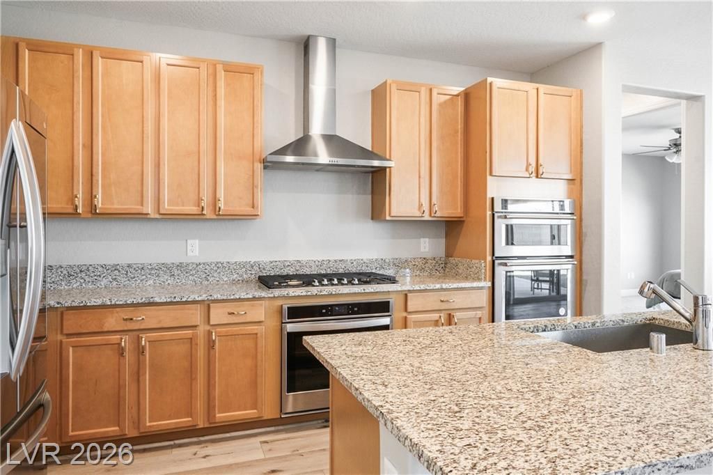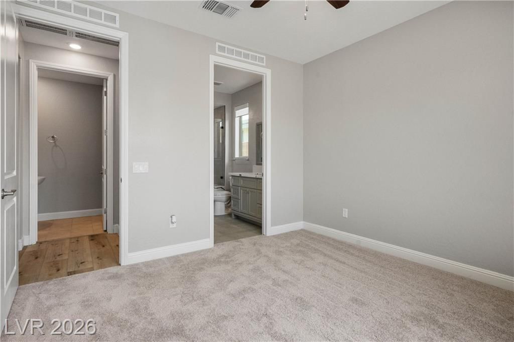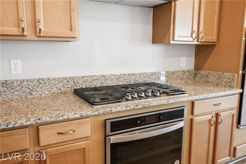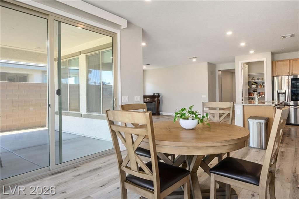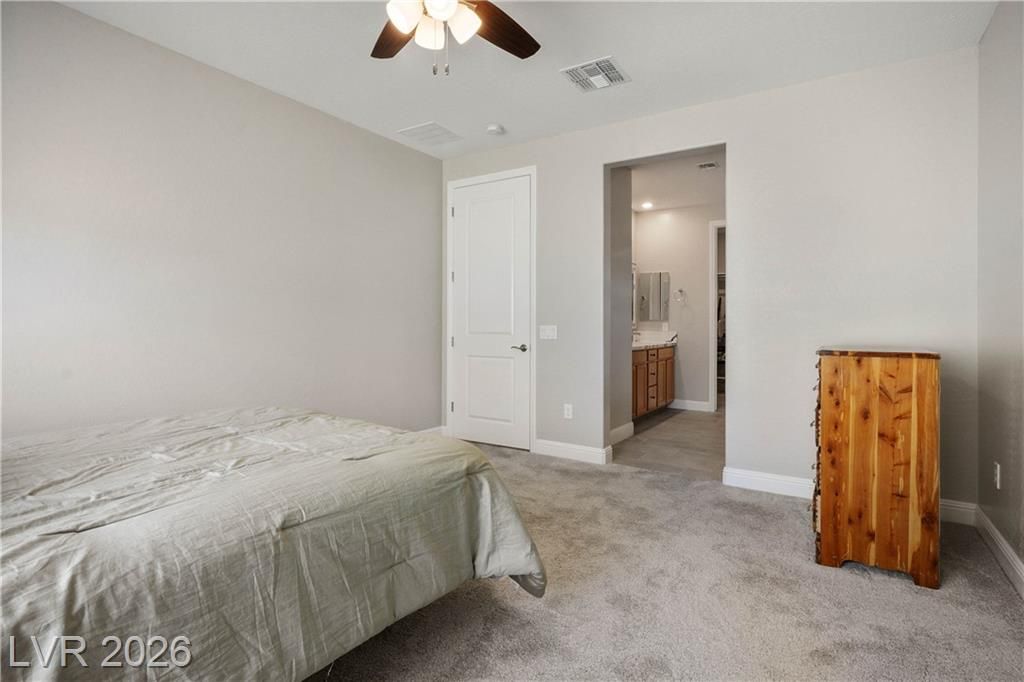 Extremely rare Sanctuary floorplan in the incredible lifestyle community of Del Webb North Ranch! Don't lift a finger in this completely TURN-KEY property. Wood flooring all throughout living areas, new carpet in bedrooms. Renovated custom bathrooms with new shower door, cabinet, and flooring. Stainless double ovens, slab granite island, wall to wall maple cabinetry and oversized pantry. 2 spacious primary bedrooms, both with low threshold showers and walk in closets. Home has low maintenance desert landscaping, large 2 car extended garage with 2 ft. extension and 10X10 storage tandem space. Enjoy energy efficiency with blown in cellulose insulation, tankless water heater, and Low-E Dual Pane Windows! Clubhouse has EVERYTHING from Pickleball, Pools, Workout Facilities. You are close to 215, Costco, VA Hospital, Shopping, Golf, and Gaming. WASHER, DRYER, REFRIGERATOR AND WALL MOUNT TV IN FAMILY ROOM INCLUDED.