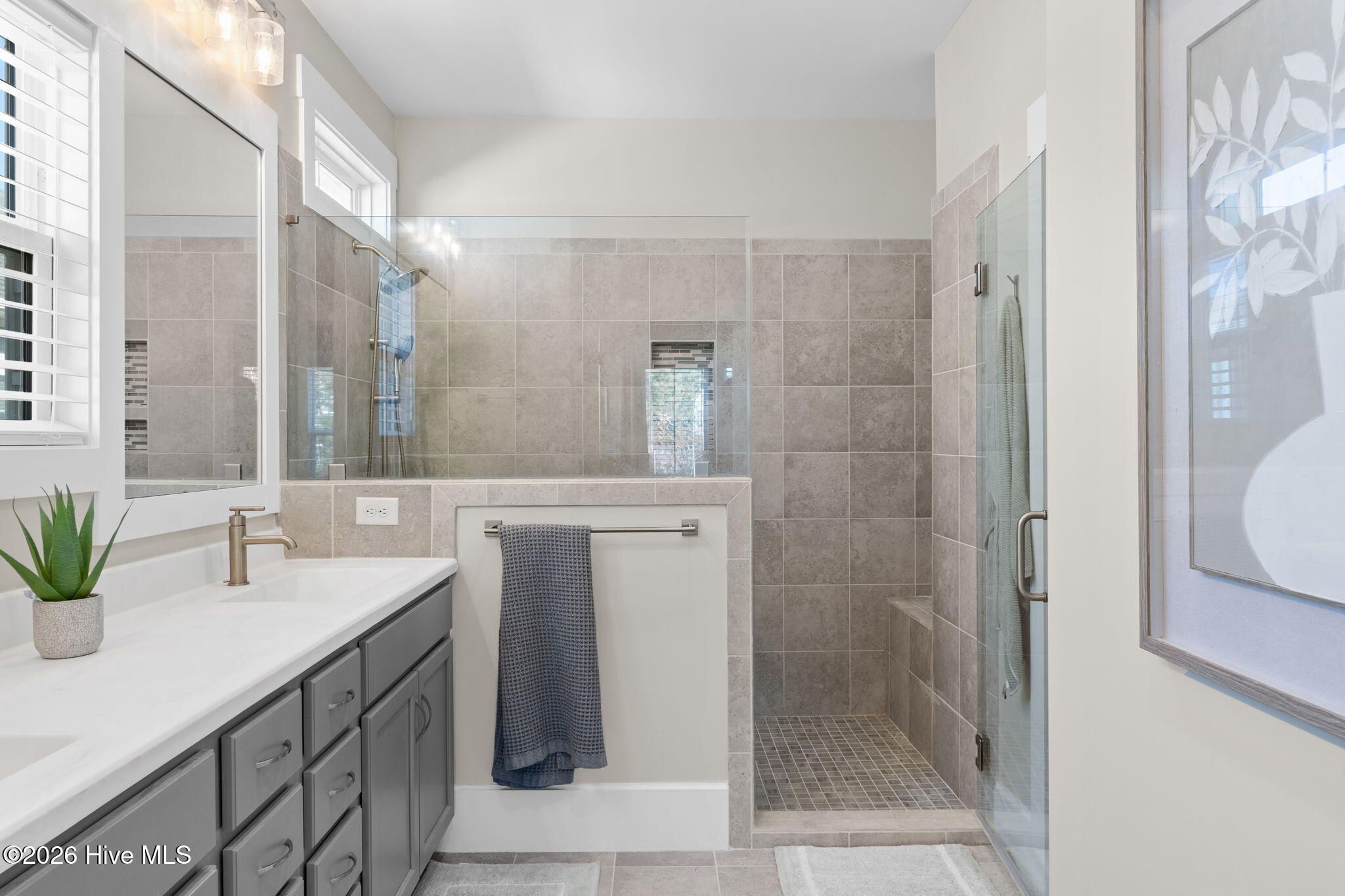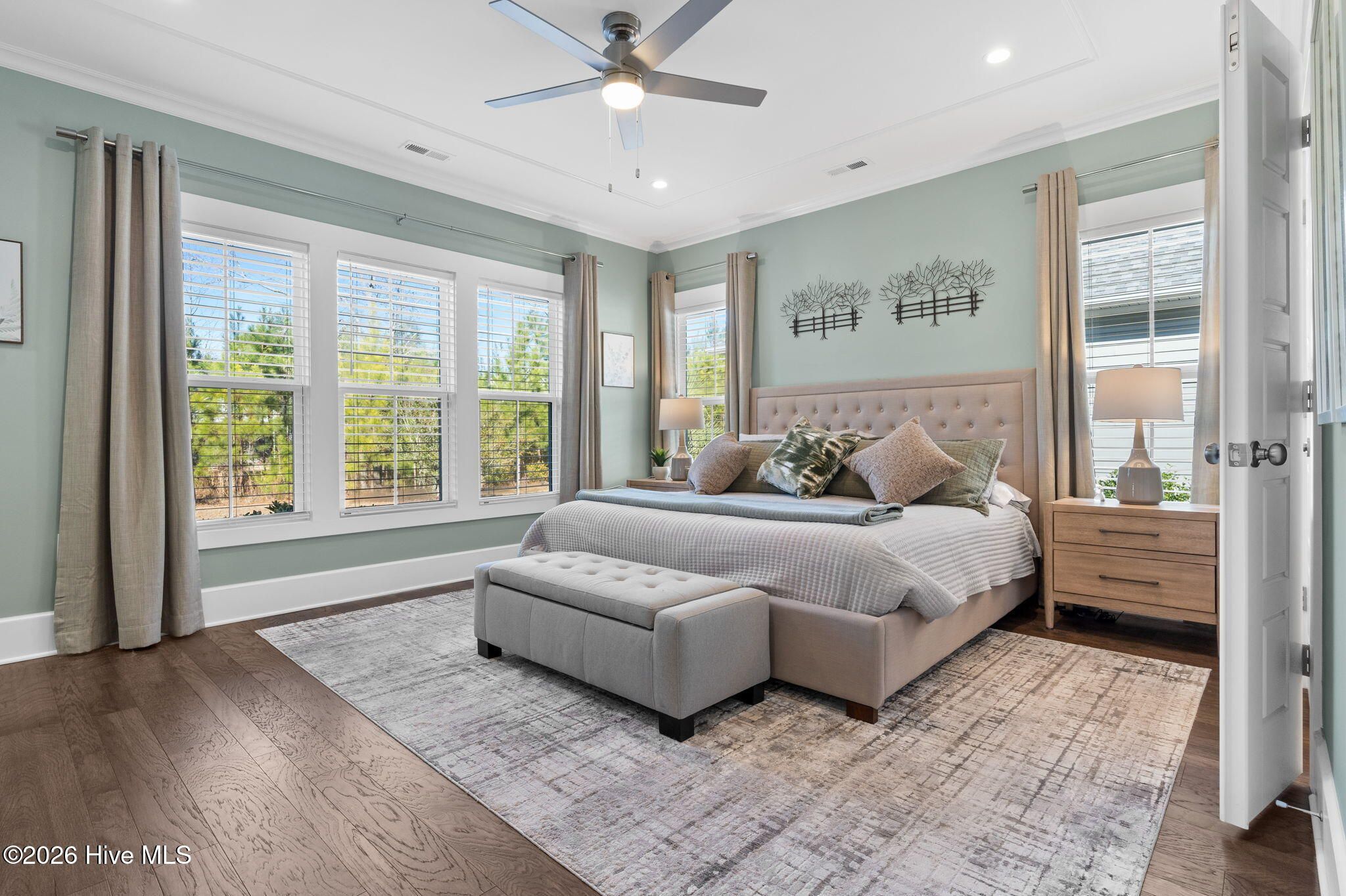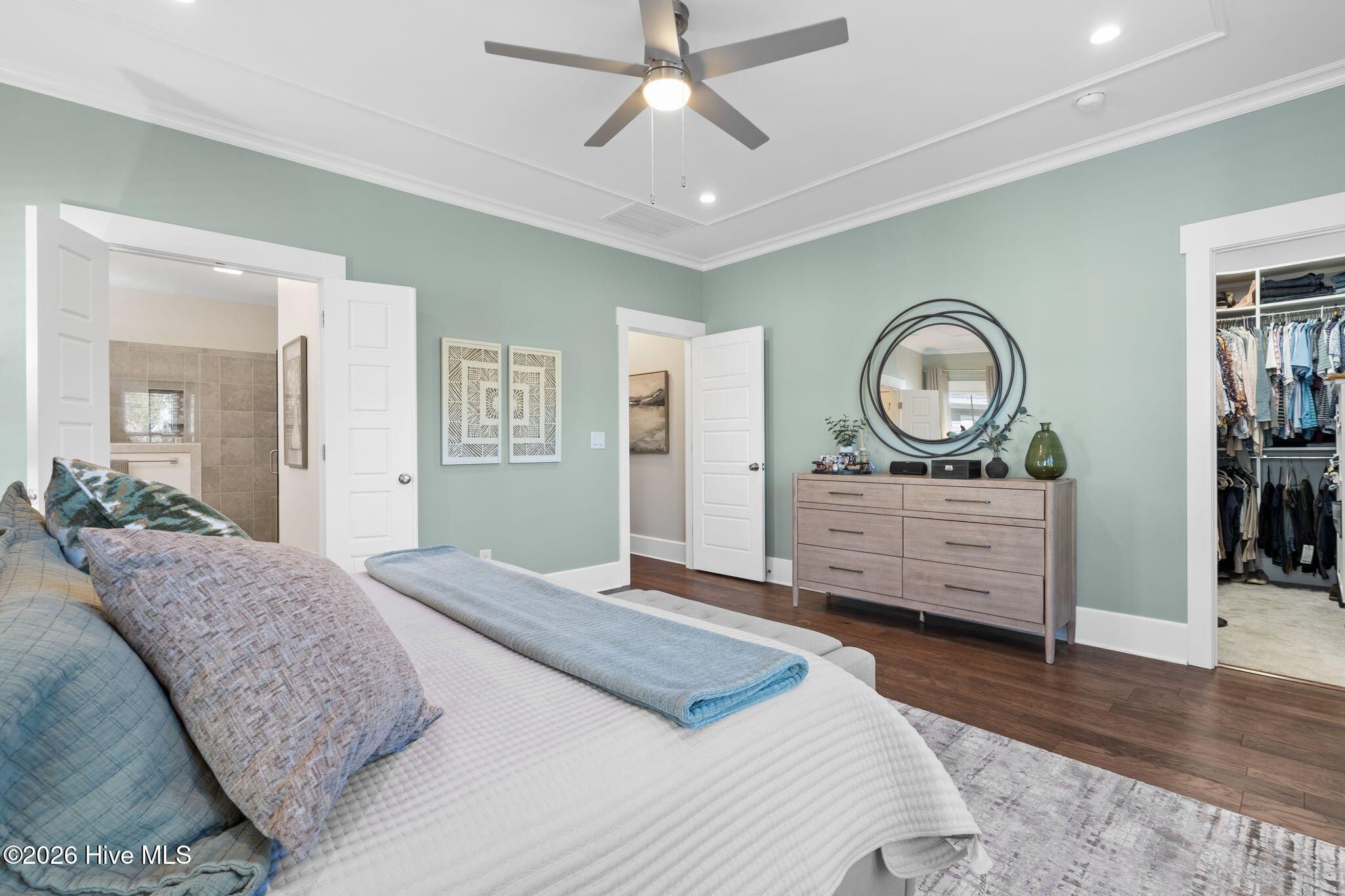 - Master Downstairs, Walk-In Closet(s), Tray Ceiling(s), High Ceilings, Entrance Foyer, Bookcases, Kitchen Island, Ceiling Fan(s), Pantry, Walk-In Shower, Blinds, Whole House Fan