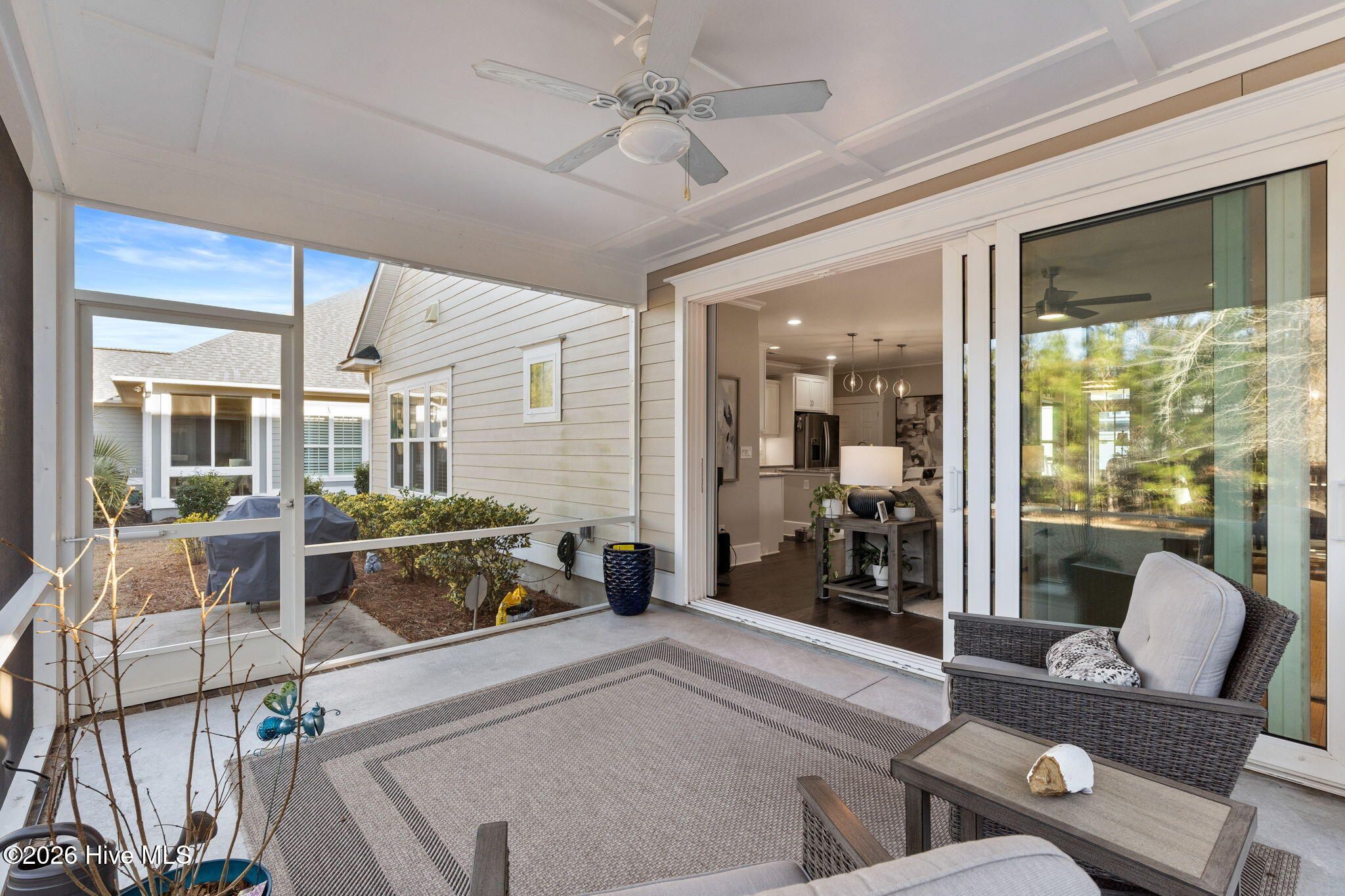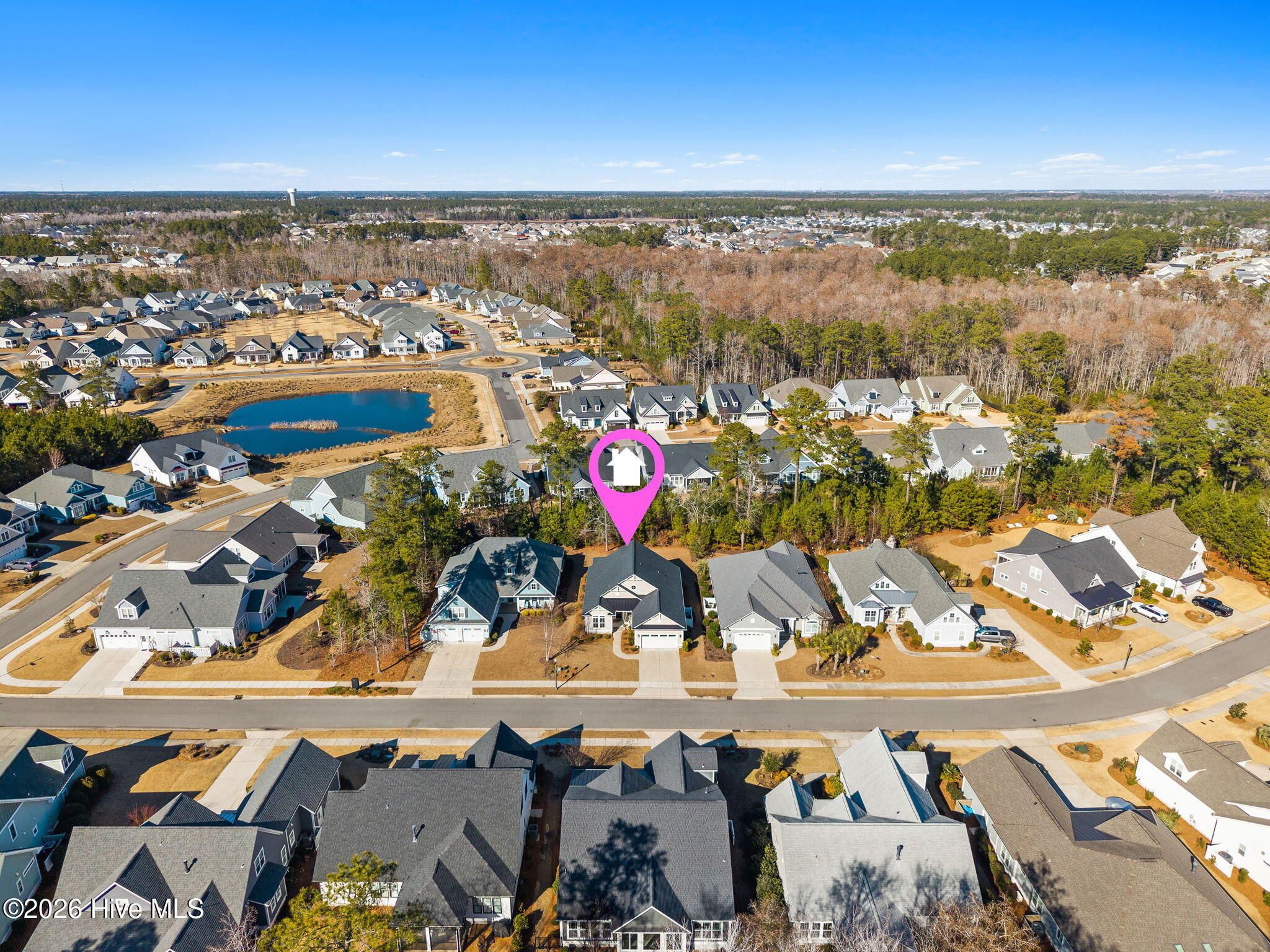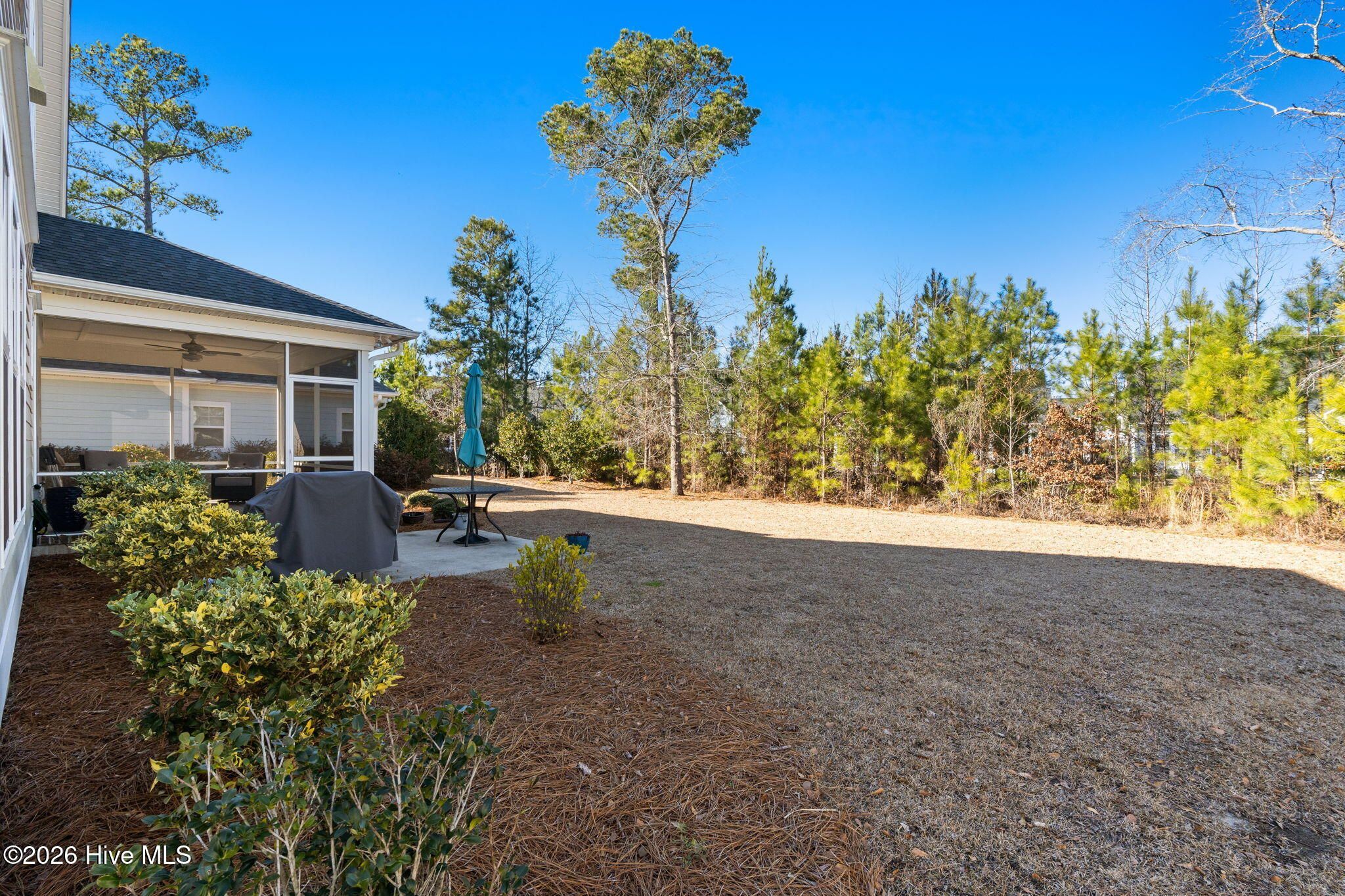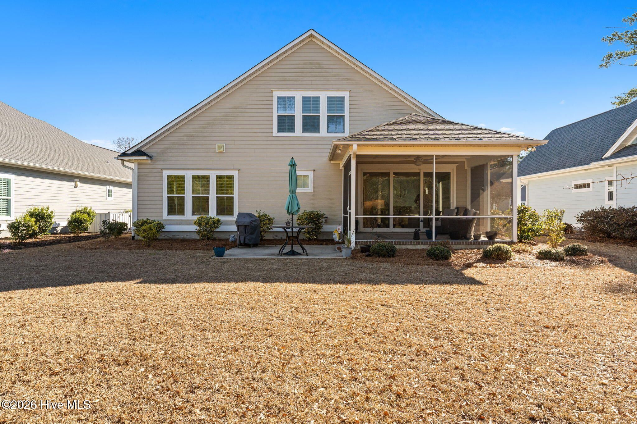 Welcome to The Bayshore by Logan Homes. Located in the highly desirable Shelmore neighborhood of the amenity-rich Brunswick Forest Community, this exceptional and beautifully maintained home sits on a 0.20-acre lot. Built in 2021 as a model home, it remains in like-new condition, offering impressive features and recent upgrades throughout. In 2024, the entire interior was freshly repainted, giving the home a modern and revitalized appearance. New ceiling fans have been installed in every room, and recessed lighting was added in the living room, dining area, master bedroom, and office, enhancing both ambiance and comfort. The main level's carpeting was replaced with beautiful hardwood flooring, bringing warmth and elegance to the living spaces. The home features three spacious bedrooms and three full bathrooms. The first-floor primary master suite includes a walk-in closet with extensive shelving for ample storage. A dedicated study or office, offering a private workspace ideal for working from home. An open floor plan seamlessly integrates the formal dining room, distinguished by a bright accent wall, with the living room, which is enhanced by a gas fireplace for warmth and a cozy ambiance. The kitchen is both stylish and functional, featuring an impressive 8-foot quartz-topped island, soft-closing drawers, and a gas stove—perfect for any home chef. Upstairs, a large bedroom with a private ensuite bathroom provides an ideal private space for guests. From the main living space, telescope sliding doors open to a covered, screened-in porch, creating a versatile area perfect for entertaining. This design allows for effortless indoor-outdoor living while offering protection from the elements. The home backs up to a wooded area, providing natural separation and privacy from nearby neighbors. The spacious two-car garage is equipped with epoxy floors, a storage closet, and a pull-down ladder leading to a large, floored attic—ideal for storage and organizing belongings.