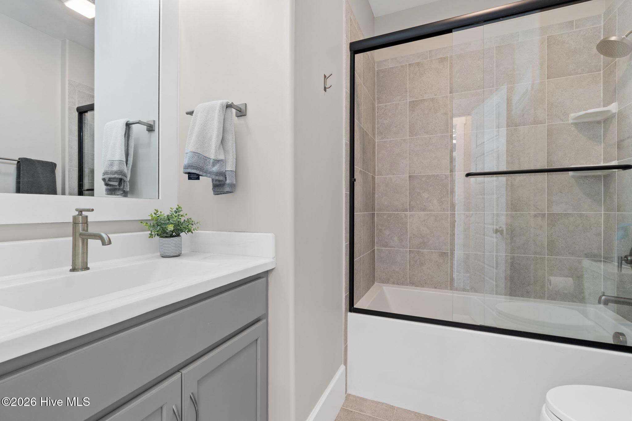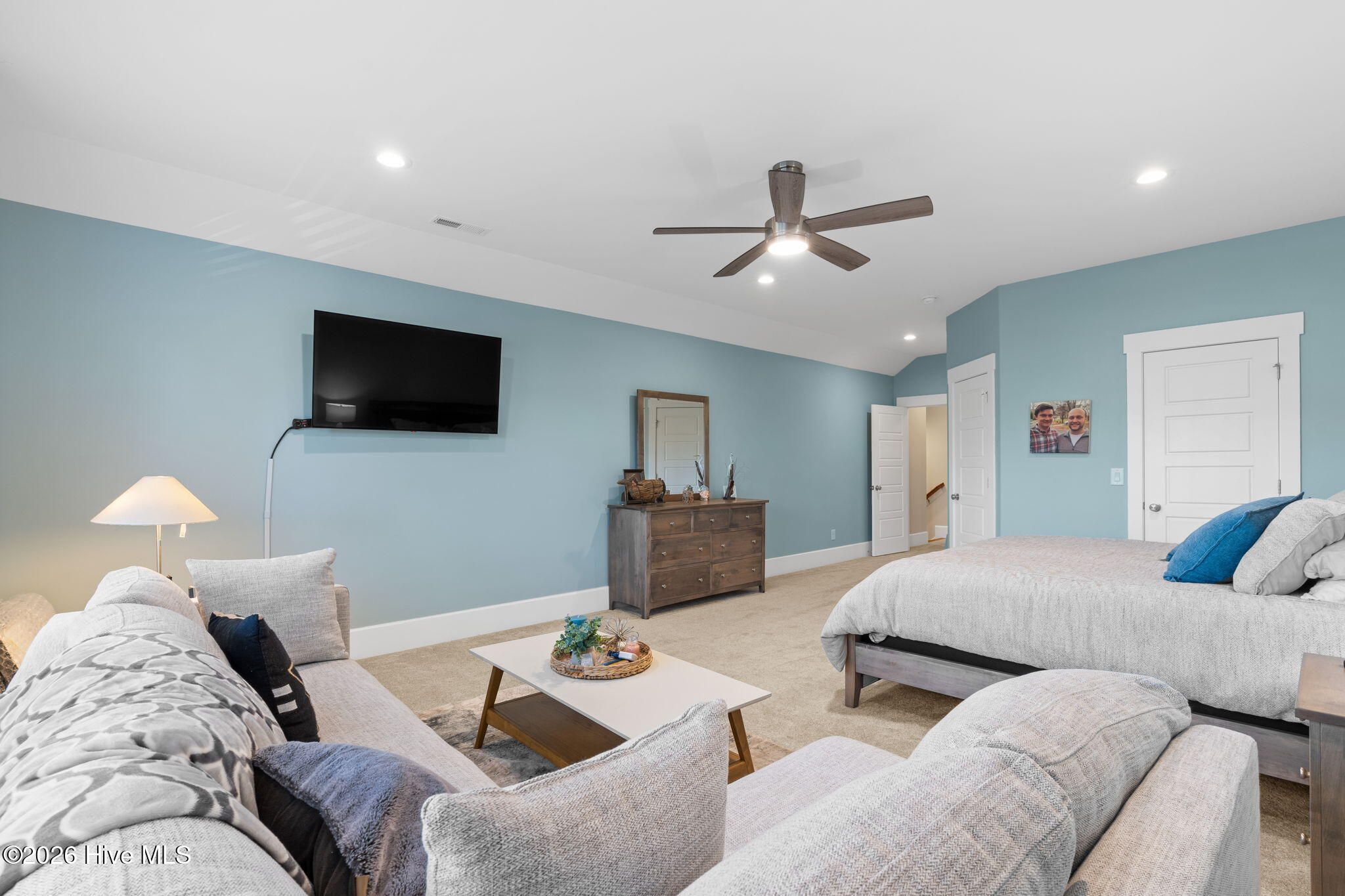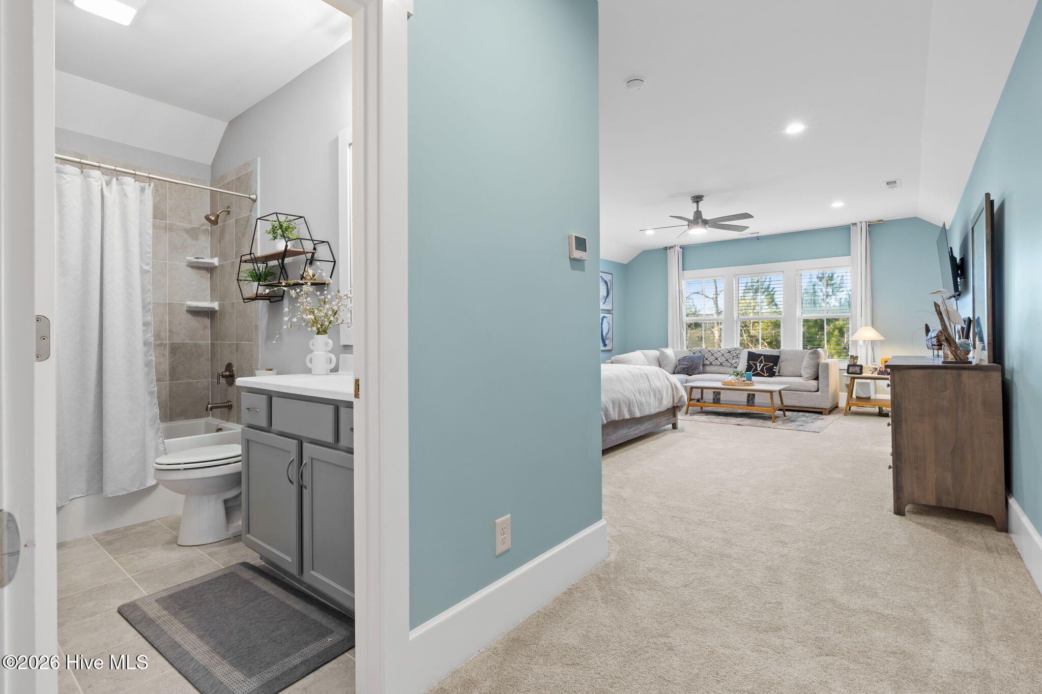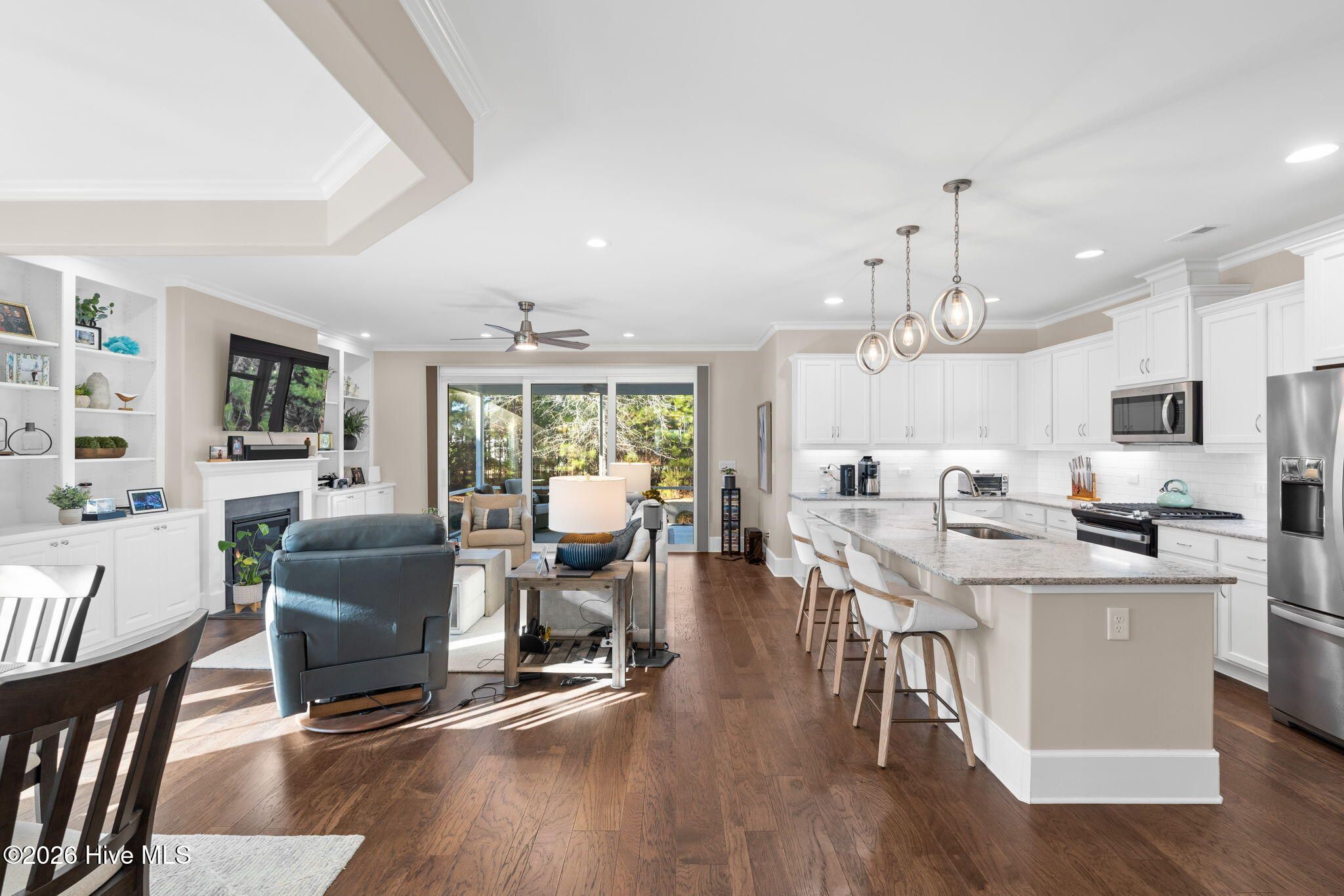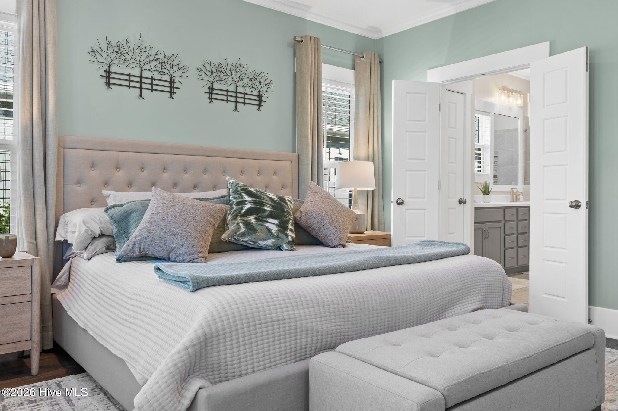 Welcome to The Bayshore by Logan Homes. Located in the highly desirable Shelmore neighborhood of the amenity-rich Brunswick Forest Community, this exceptional and beautifully maintained home sits on a 0.20-acre lot. Built in 2021 as a model home, it remains in like-new condition, offering impressive features and recent upgrades throughout. In 2024, the entire interior was freshly repainted, giving the home a modern and revitalized appearance. New ceiling fans have been installed in every room, and recessed lighting was added in the living room, dining area, master bedroom, and office, enhancing both ambiance and comfort. The main level's carpeting was replaced with beautiful hardwood flooring, bringing warmth and elegance to the living spaces. The home features three spacious bedrooms and three full bathrooms. The first-floor primary master suite includes a walk-in closet with extensive shelving for ample storage. A dedicated study or office, offering a private workspace ideal for working from home. An open floor plan seamlessly integrates the formal dining room, distinguished by a bright accent wall, with the living room, which is enhanced by a gas fireplace for warmth and a cozy ambiance. The kitchen is both stylish and functional, featuring an impressive 8-foot quartz-topped island, soft-closing drawers, and a gas stove—perfect for any home chef. Upstairs, a large bedroom with a private ensuite bathroom provides an ideal private space for guests. From the main living space, telescope sliding doors open to a covered, screened-in porch, creating a versatile area perfect for entertaining. This design allows for effortless indoor-outdoor living while offering protection from the elements. The home backs up to a wooded area, providing natural separation and privacy from nearby neighbors. The spacious two-car garage is equipped with epoxy floors, a storage closet, and a pull-down ladder leading to a large, floored attic—ideal for storage and organizing belongings.