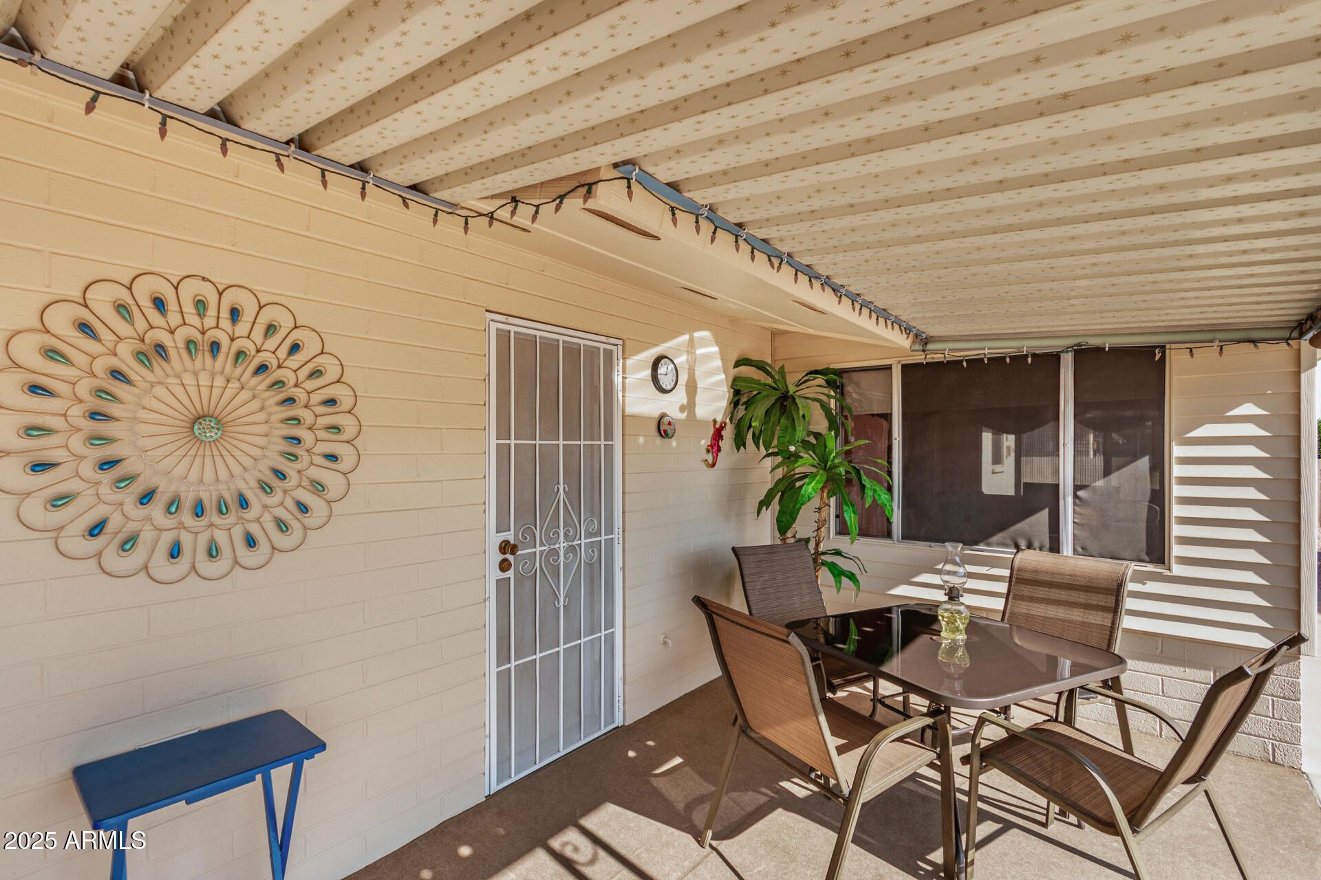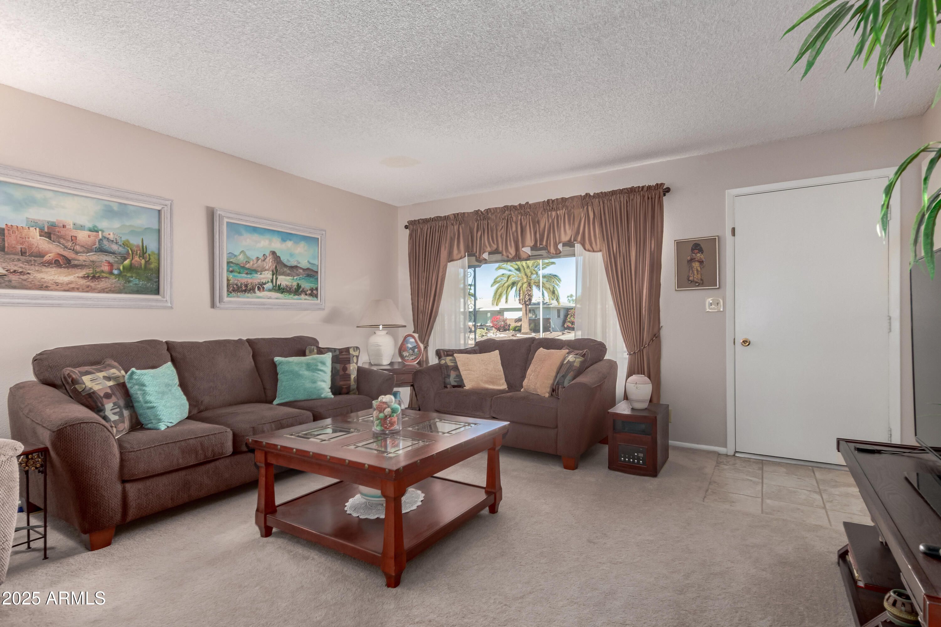 Lovely and well-maintained home in the popular Dreamland Villa 55+ community. This charming 2-bedroom home is on city sewer and features a welcoming front porch—perfect for enjoying the beautiful Arizona weather with your morning coffee. Energy-efficient dual pane windows and a newer A/C system keep you comfortable year-round. Inside, tile flooring flows through the dining room, kitchen, laundry, and baths, with laminate in the primary bedroom and plush carpet in the guestroom and living room. The light and bright Arizona room, with windows on all sides, offers an ideal space for relaxing or a home office. You'll appreciate the oversized laundry room, and the washer and dryer are included. The private backyard features a block fence and low-maintenance landscaping. All furniture is available, making it easy to move right in and start enjoying the Arizona lifestyle. Located near shopping, dining, restaurants, & hospitals, and easy access to freeways.