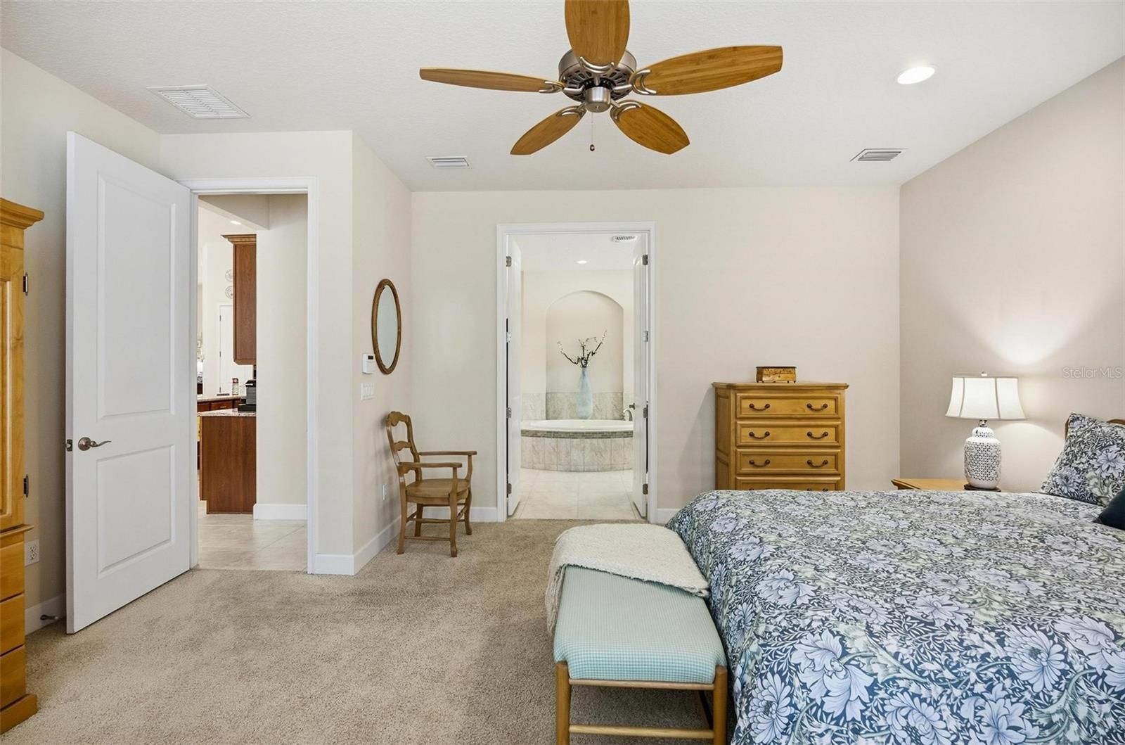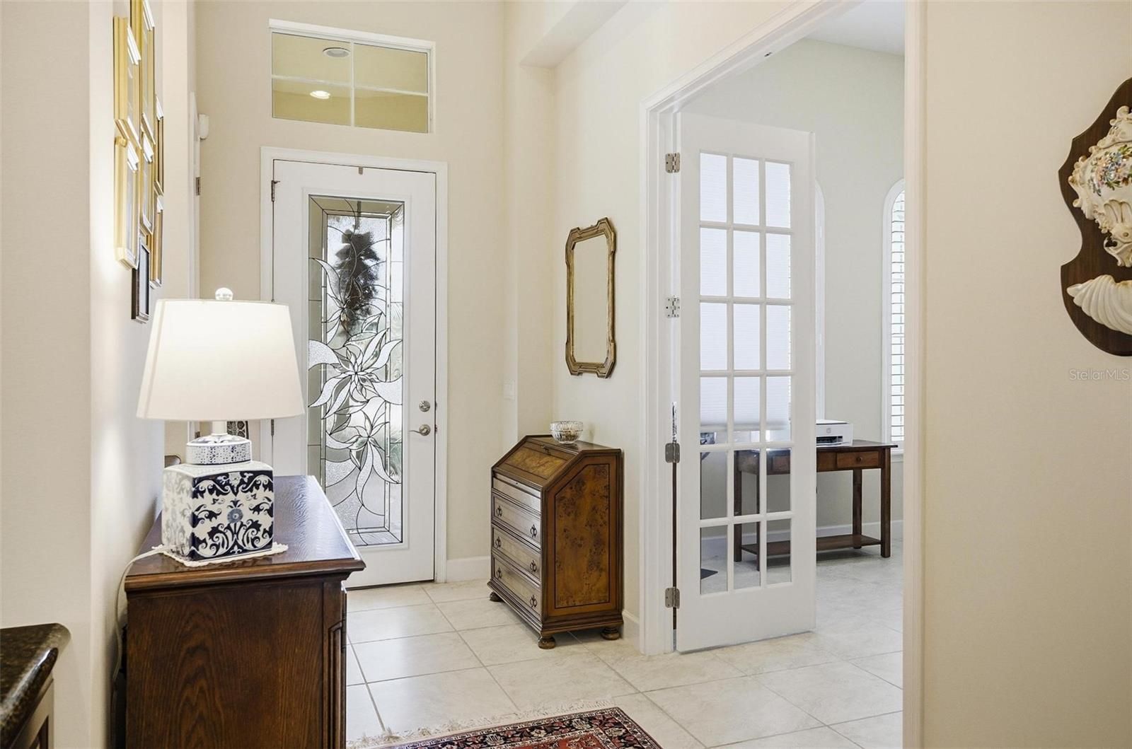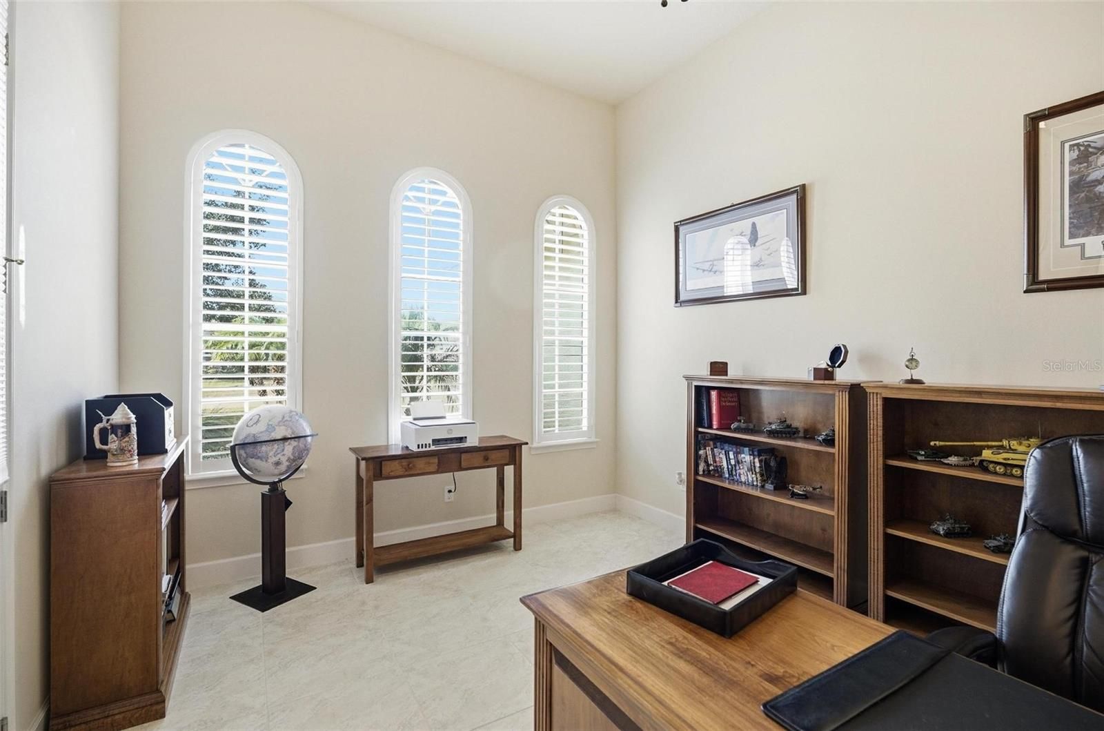 Discover this thoughtfully designed Cameron floor plan perfectly positioned on a preserved lot within the gated community of Plantation Bay. Here, elegance, privacy, and modern luxury blend seamlessly to create your own resort-style sanctuary. Featuring 3 bedrooms plus a private office, 2 baths, and a sparkling pool under a screened lanai, this home was designed for both relaxed living and effortless entertaining. Step inside to a welcoming foyer where floating cabinets add a designer touch. French doors open to a spacious office — ideal for working from home or a quiet retreat. Beyond, the open-concept living area impresses with a stunning double-sided stone electric fireplace connecting the vaulted sunroom and main living room. Triple sliders and transom windows flood the space with natural light and open fully to the lanai for true indoor-outdoor living. The gourmet kitchen is a chef’s dream, featuring 42-inch wood cabinetry, granite countertops, a 10-foot island with pendant lighting, tile backsplash, stainless steel appliances (including a new 2024 refrigerator), and a custom pantry. Next to the kitchen is the dining area with rolling shades with completes the perfect gathering space. Your primary suite is a private oasis with an ensuite bath offering dual granite vanities, a soaking tub, a separate shower as well as a large walk-in closet. The split floor plan provides two guest bedrooms and a recently remodeled bath — ideal for family or visitors. Step outside to your tranquil pool and lanai, surrounded by professional landscaping and perfect for outdoor living or al fresco dining. Additional features include tile flooring in main areas, carpeted bedrooms, new 2024 electric hybrid water heater, Culligan whole-house water softener, laundry room with 32-inch upper cabinets, front load washer and dryer with pedestals, plus three-car garage (two-car + one-car split) with epoxy floor in the main garage, seamless gutters, landscape lighting at front and back of the house and a long paver driveway. This open floorpan is perfect for entertaining in the living room, retreating in the sunroom, or relaxing in the master suite. The pool and lanai create a tranquil space crafting a haven to relax, entertain, and enjoy those special moments all day long where every day feels like vacation. Living in Plantation Bay offers optional membership access to world-class amenities — including 45 holes of private golf, 10 tennis courts, 10 pickleball courts, two resort pools, a fitness center, and two full-service clubhouses offering dining, social events, and entertainment. Membership is not mandatory and can be tailored to your lifestyle. Start living the Florida resort lifestyle today. - Schedule your private showing and experience this exquisite home for yourself. Some furnishings available for purchase — ask for details.