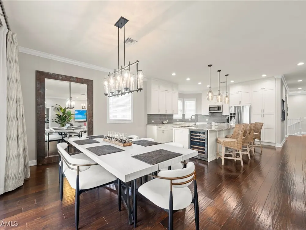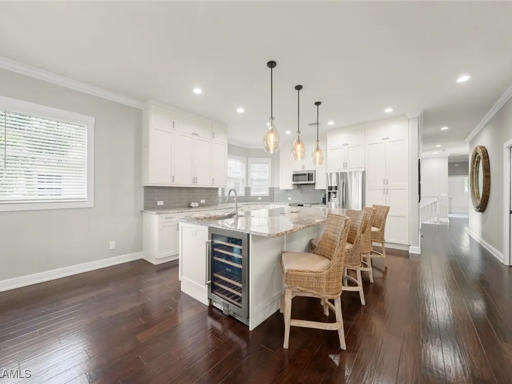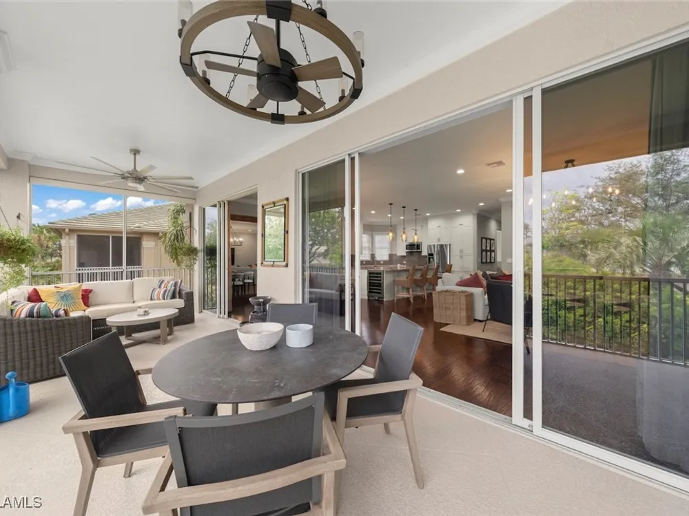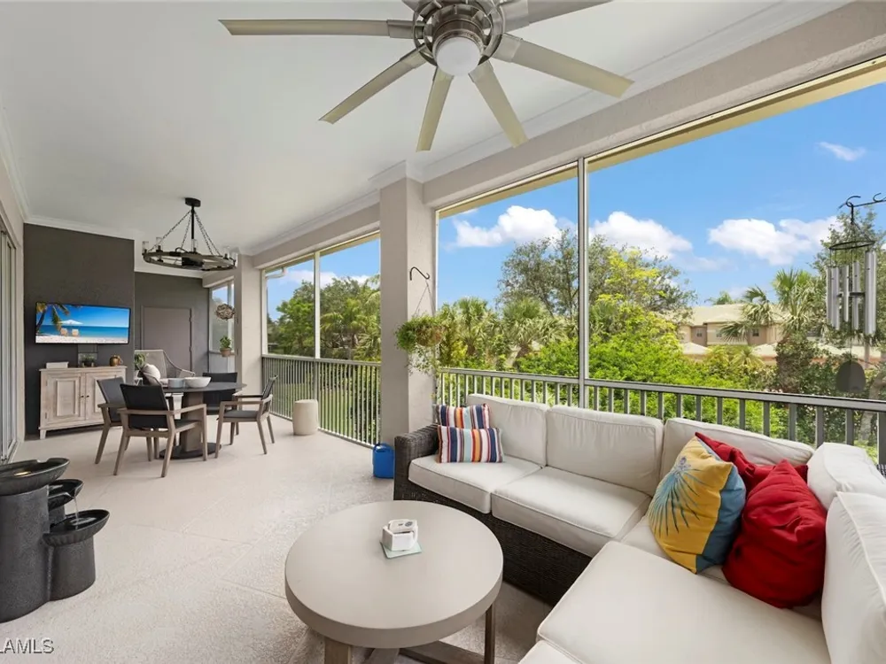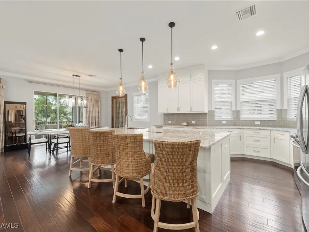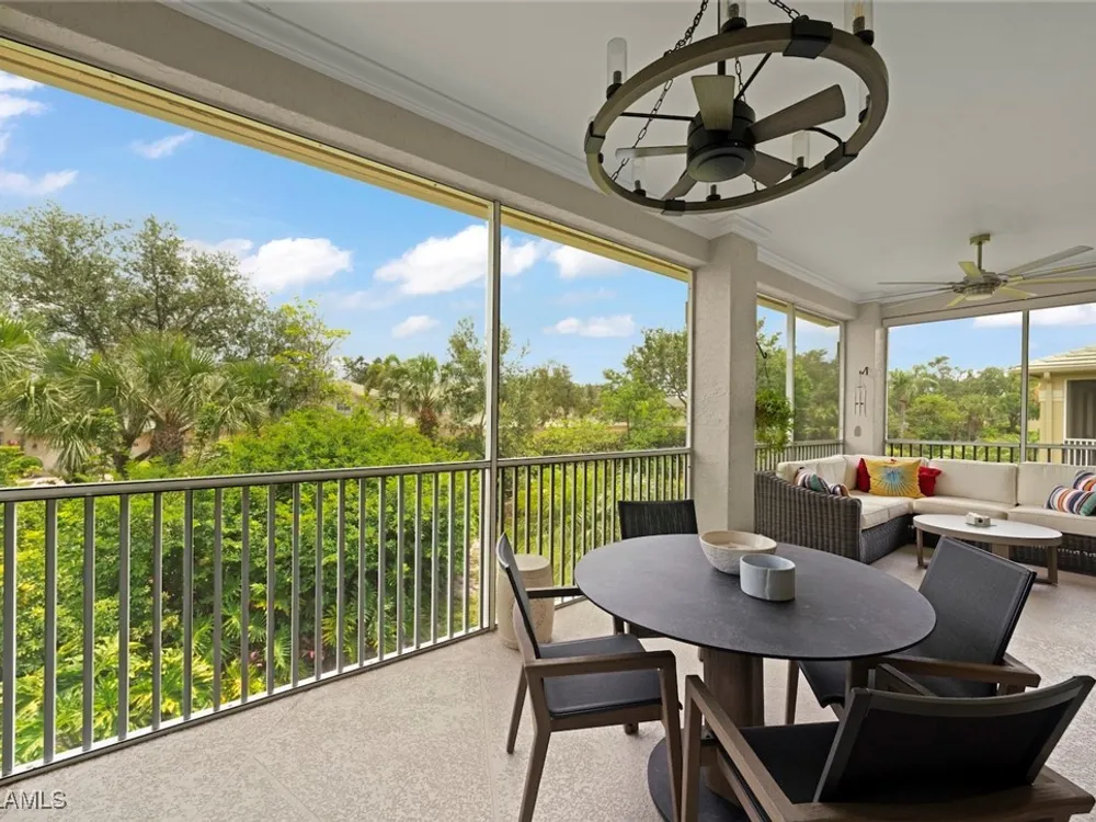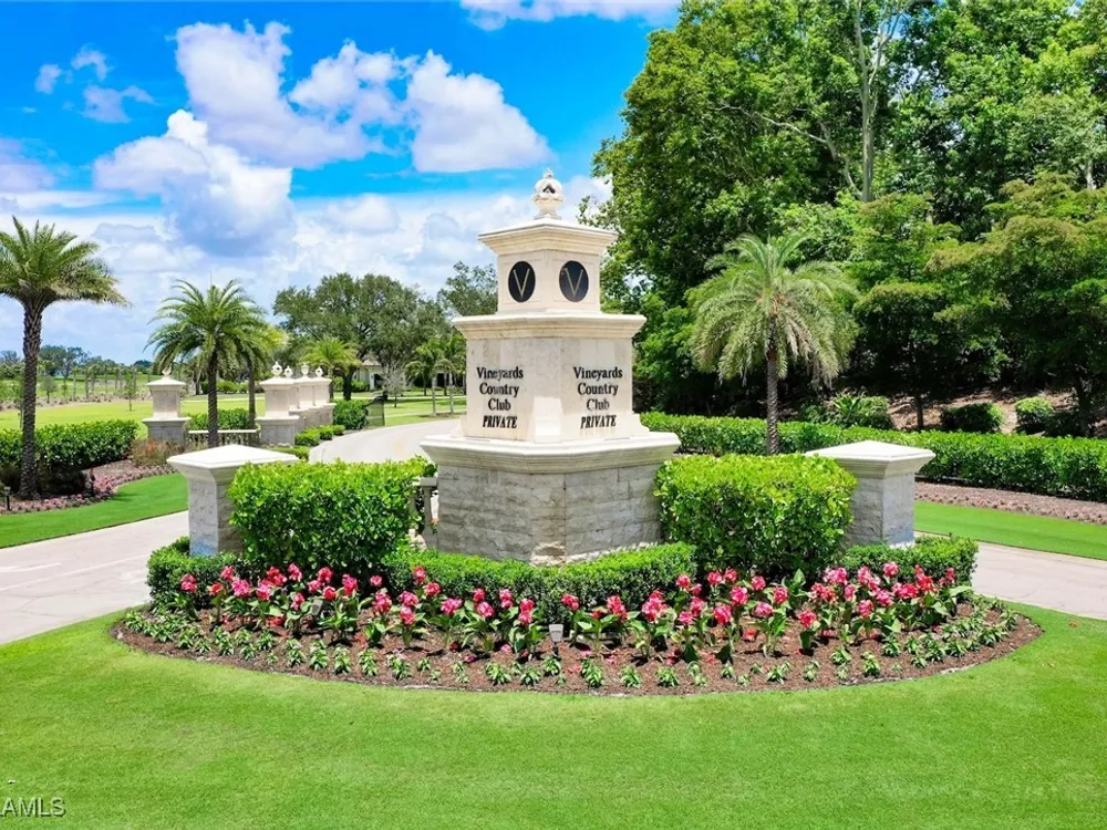 Welcome to Vintage Reserve at The Vineyards, where this beautifully renovated top-floor coach home offers over 2,300 square feet of light-filled living with 3 bedrooms, a private office, and 3 full bathrooms. Soaring ceilings, crown molding, and an open-concept design create an inviting atmosphere, complemented by a modern kitchen with white cabinetry, stainless steel appliances, sleek countertops, oversized island with seating, and a built-in beverage cooler. Rich wood flooring, updated lighting, and refined details carry throughout, while the expansive great room and primary suite open to a large screened lanai with serene preserve views. The primary suite boasts plush new carpeting, a custom walk-in closet, and a spa-inspired bath with dual vanities and walk-in shower, while the office features elegant board-and-batten accents for a sophisticated workspace. Additional highlights include a 2-car garage with brand-new epoxy flooring and abundant natural light. Vintage Reserve is a gated enclave within The Vineyards, where residents enjoy scenic walking paths, lakes, and the option to join Vineyards Country Club with two championship golf courses, tennis, pickleball, fitness center, spa, pools, and both casual and fine dining—all just minutes from Naples’ world-class shopping, dining, and white-sand beaches.