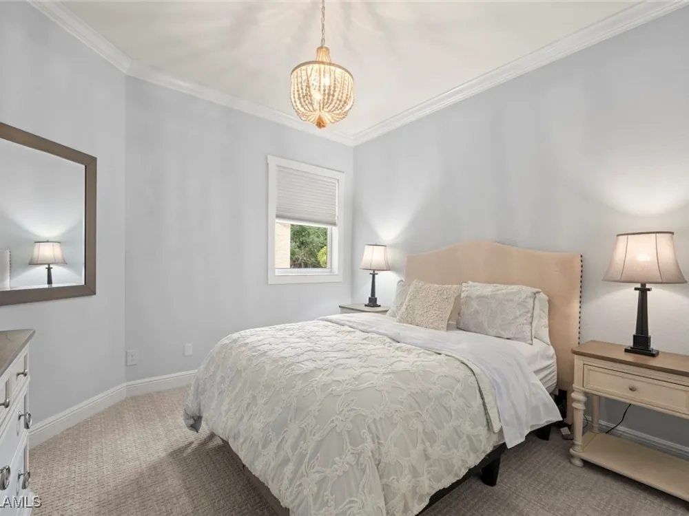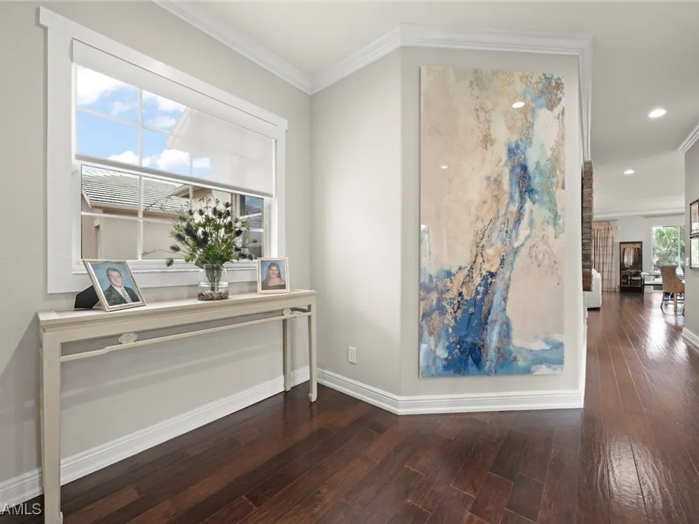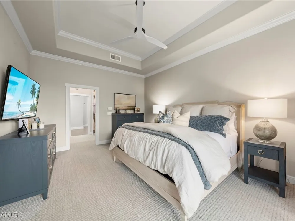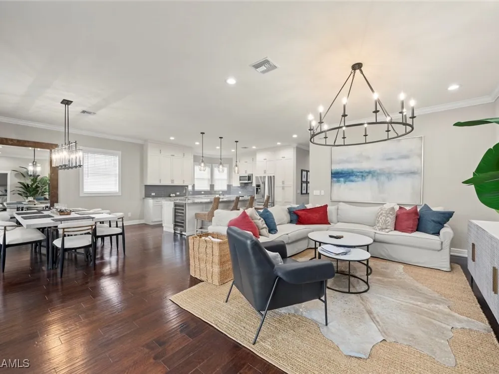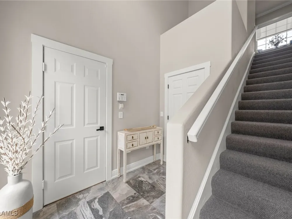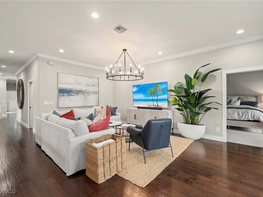 Welcome to Vintage Reserve at The Vineyards, where this beautifully renovated top-floor coach home offers over 2,300 square feet of light-filled living with 3 bedrooms, a private office, and 3 full bathrooms. Soaring ceilings, crown molding, and an open-concept design create an inviting atmosphere, complemented by a modern kitchen with white cabinetry, stainless steel appliances, sleek countertops, oversized island with seating, and a built-in beverage cooler. Rich wood flooring, updated lighting, and refined details carry throughout, while the expansive great room and primary suite open to a large screened lanai with serene preserve views. The primary suite boasts plush new carpeting, a custom walk-in closet, and a spa-inspired bath with dual vanities and walk-in shower, while the office features elegant board-and-batten accents for a sophisticated workspace. Additional highlights include a 2-car garage with brand-new epoxy flooring and abundant natural light. Vintage Reserve is a gated enclave within The Vineyards, where residents enjoy scenic walking paths, lakes, and the option to join Vineyards Country Club with two championship golf courses, tennis, pickleball, fitness center, spa, pools, and both casual and fine dining—all just minutes from Naples’ world-class shopping, dining, and white-sand beaches.