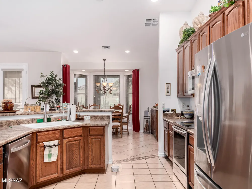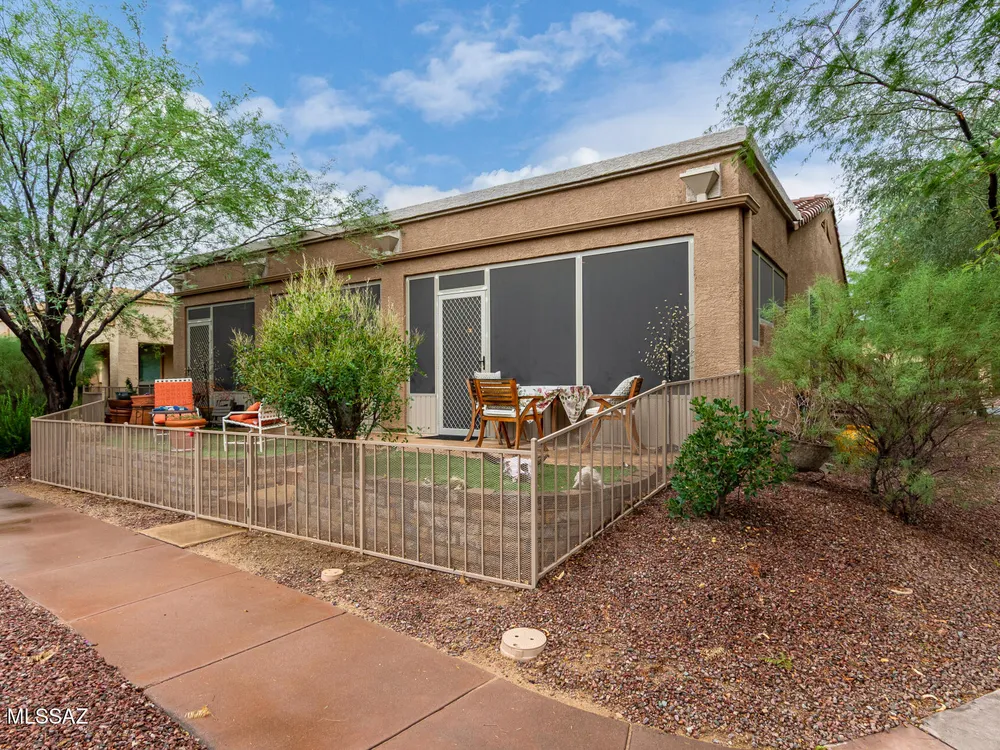 3D Matterport & Floor Plan available on Homes.com. 55+ gated Las Campanas Village! Nestled on a corner lot, this beautiful home offers 2 beds, 2 baths, 2-car garage, & desert landscape. The fabulous interior showcases a desirable open layout paired with vaulted ceilings, neutral palette, recessed lighting, and abundant natural light. The kitchen boasts SS appliances, ample wood cabinetry, and a peninsula w/breakfast bar. The flexible den, with a French double-door entry, can be an office or reading nook. Each bedroom is equipped with carpet & a bay window! The main bedroom includes a private bathroom with dual sinks. You'll love the screened-in patio, where you can relax w/out worrying about the weather! An open seating area, artificial turf, & wrought iron fence complete the backyard.