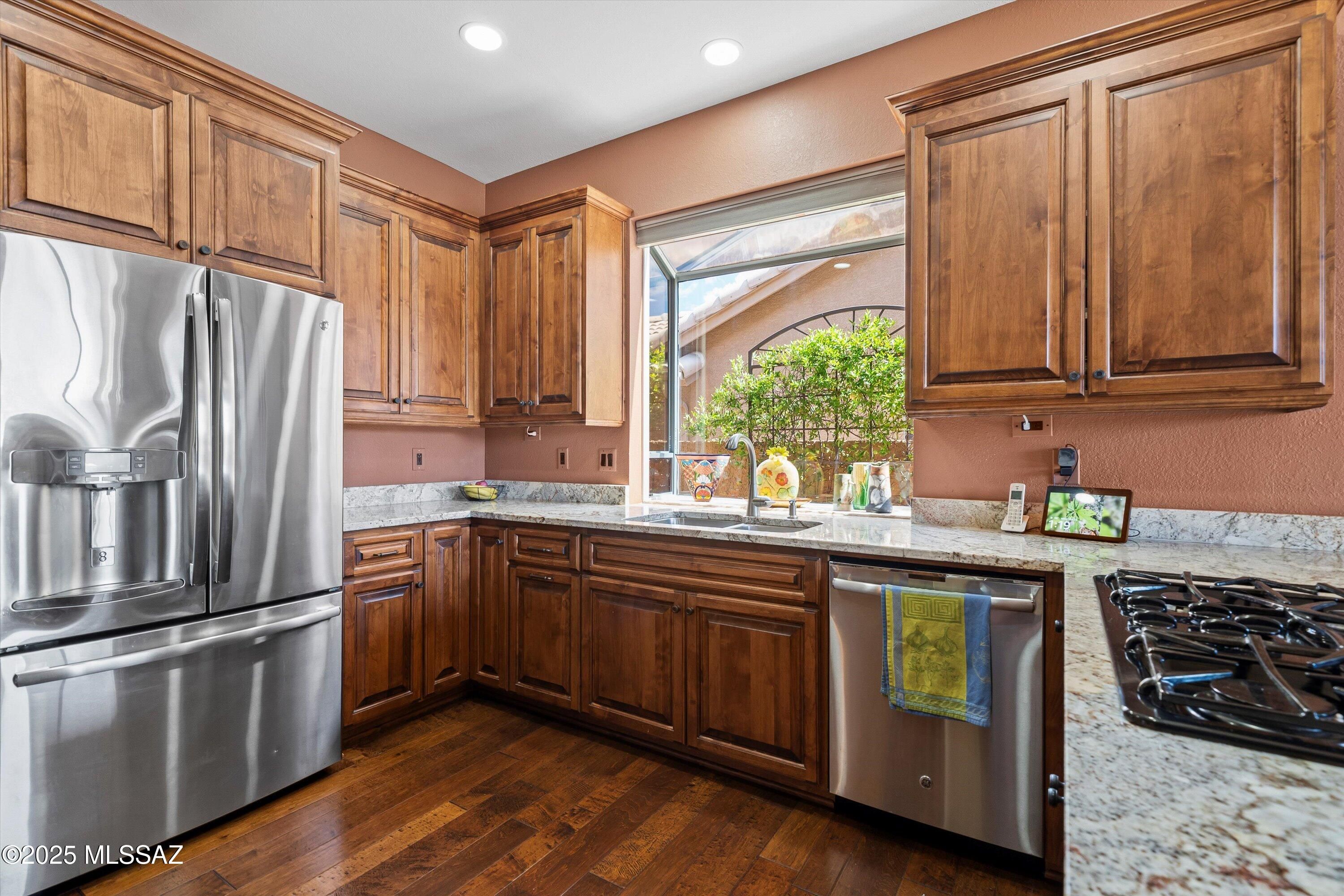 MOVE-IN-READY Remodeled Madera model w/ STUNNING MOUNTAIN & GOLF COURSE VIEWS! Beautiful wood engineered flooring, designer paint tones, remodeled kitchen w/ custom cabinetry, granite countertops, SS appliances with a gas range. Bathrooms updated with granite countertops, striking primary shower & cabinetry, and a stylish powder room for guests. Relax by the sleek stone gas fireplace in the family room that opens to the backyard oasis. Enjoy the best of indoor/outdoor living on a spacious patio with built-in grill, water feature, retractable awning and amazing views, an ideal setting for entertaining. Major upgrades include: replumbing with overhead lines, new WH, smart plugs & switches, remodeled kitchen & baths, & replaced roof underlayment. Truly a must-see!