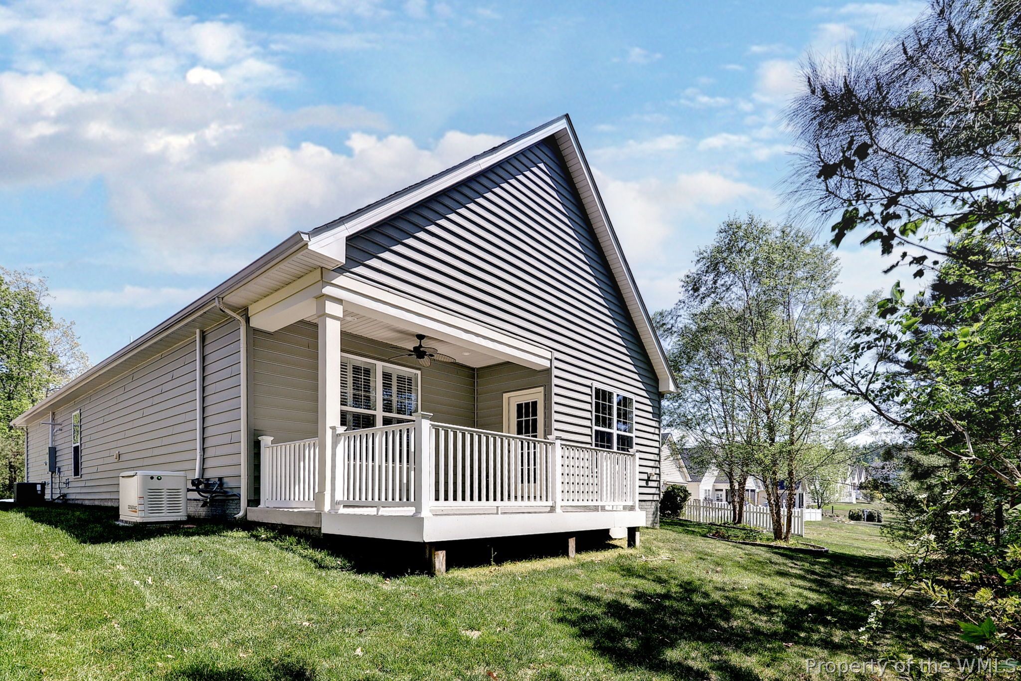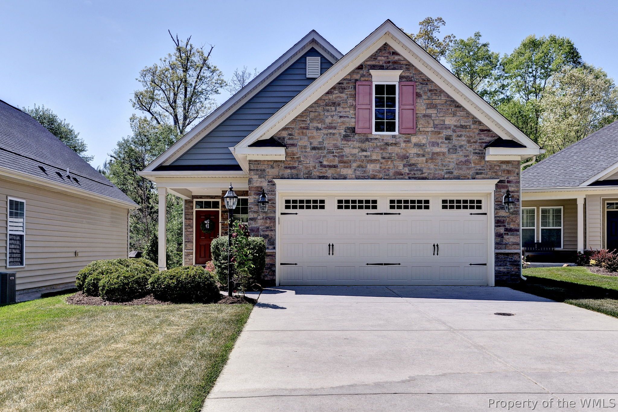 Welcome to this charming cottage home nestled on a quiet cut de sac, surrounded by a tranquil wooded setting and pond views. Captivating curb appeal and a very inviting entrance brings you into this lovely home. A convenient one level design with intended low maintenance living inside and out! The office/flex room overlooks a peaceful wooded and common area. The family room and dining room offers a bright and attractive feel perfect for your everyday living. An upscale classy kitchen also showcases those gorgeous wooded views and leads you to an amazing covered porch and extended deck. Fresh neutral paint, plantation shutters, Whole Home Generator and large driveway are some of the features for you to see. It's not often a homesite like this is available and one you won't want to miss. Time to enjoy the good life in Williamsburg's premier 55+ resort style community.