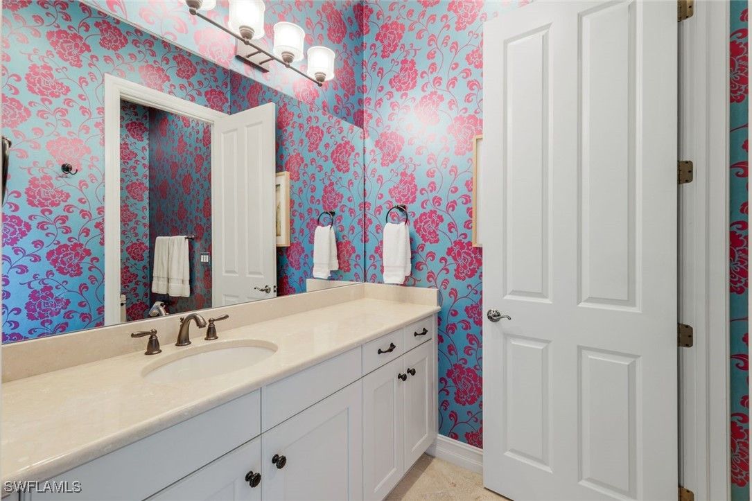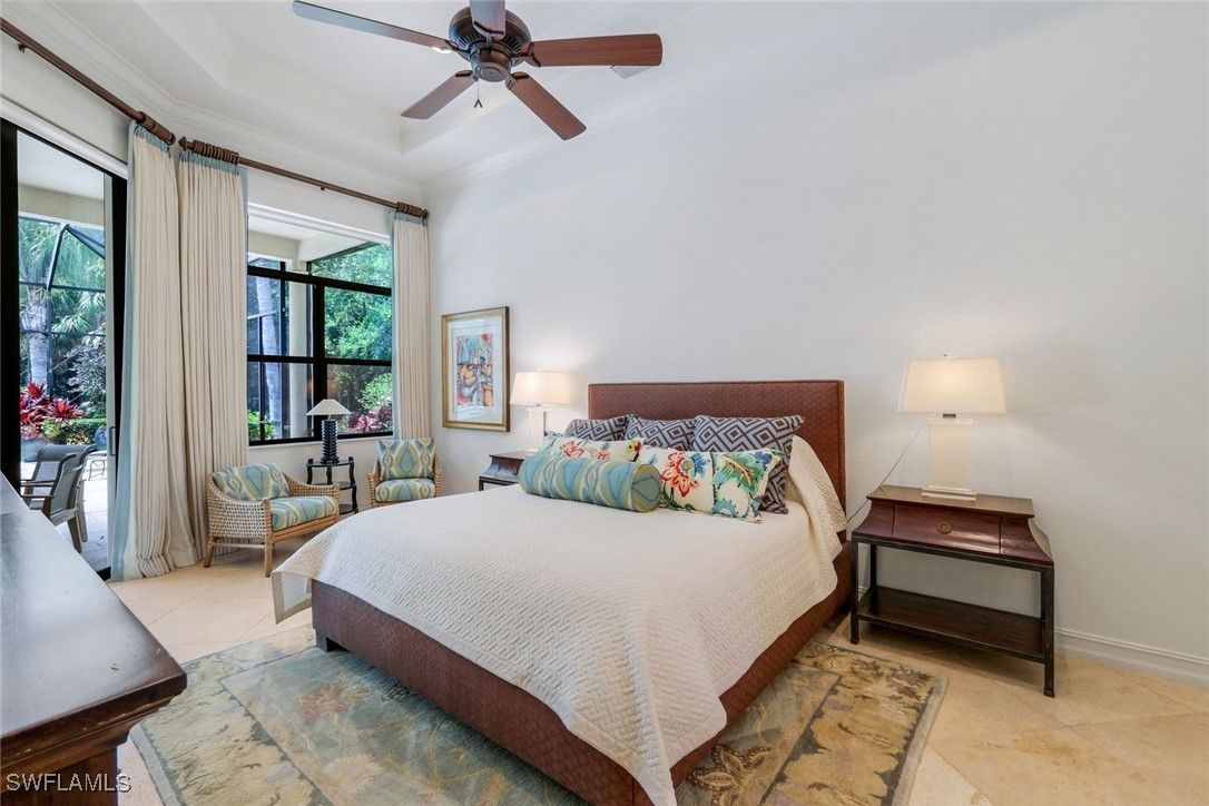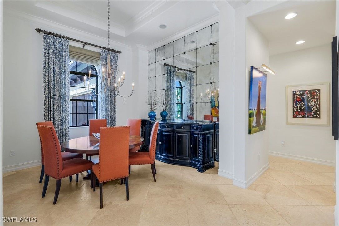 6477 Costa Circle embodies a level of refinement rarely found in Lely Resort. Set within the exclusive enclave of Lakoya, this custom Greenbriar II by Stock Signature Homes pairs architectural integrity with a curated aesthetic that elevates every room. A hand-forged Cantera iron door opens to interiors defined by thoughtful craftsmanship—24-inch diagonal stone flooring, tailored millwork, and a luminous flow of natural light. The kitchen serves as both a functional workspace and a work of art, showcasing stacked illuminated cabinetry, a walnut butcher-block island, hand-painted Tabarka tile, a Viking gas cooktop, Monogram appliances, and a California Closets pantry designed for effortless organization. Sophisticated detailing continues throughout: an antique-mirror feature wall in the dining room, living-room beams with integrated LED lighting, and a bespoke pool bath finished with artisanal tilework. The primary suite stands apart as a serene retreat, enriched with Venetian plaster walls in the bath and dual closets by California Closets. Beyond the glass, more than 2,400 square feet of lanai space creates an exceptionally private sanctuary. A rectilinear saltwater pool and spa anchor the outdoor living experience, surrounded by mature tropical landscaping and the luxury of true western exposure for nightly sunsets. The 710-square-foot covered area is finished with a cypress ceiling, custom cabinetry, wet bar, sink, refrigerator, and a built-in TV—an outdoor living room designed for year-round enjoyment. Additional features include solid-core doors, impact-resistant windows and doors, hot-water recirculation, custom lighting, upgraded window treatments, and a finished garage with workbench. The result is a residence that feels bespoke at every turn. Within minutes of downtown Naples and the Gulf, and complemented by world-class golf, tennis, spa, and dining amenities, this home speaks to the buyer who values craftsmanship, privacy, and a sophisticated resort lifestyle.