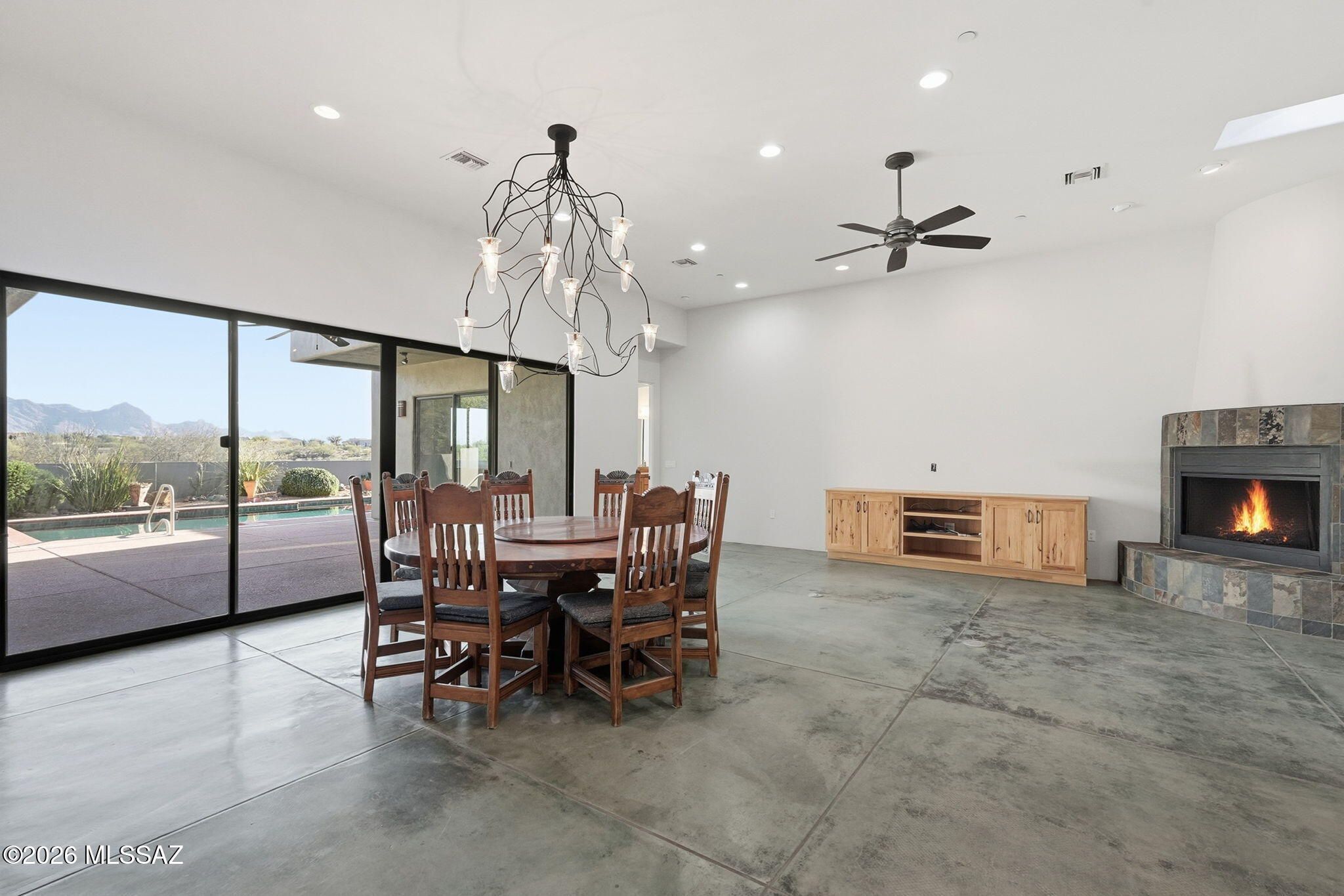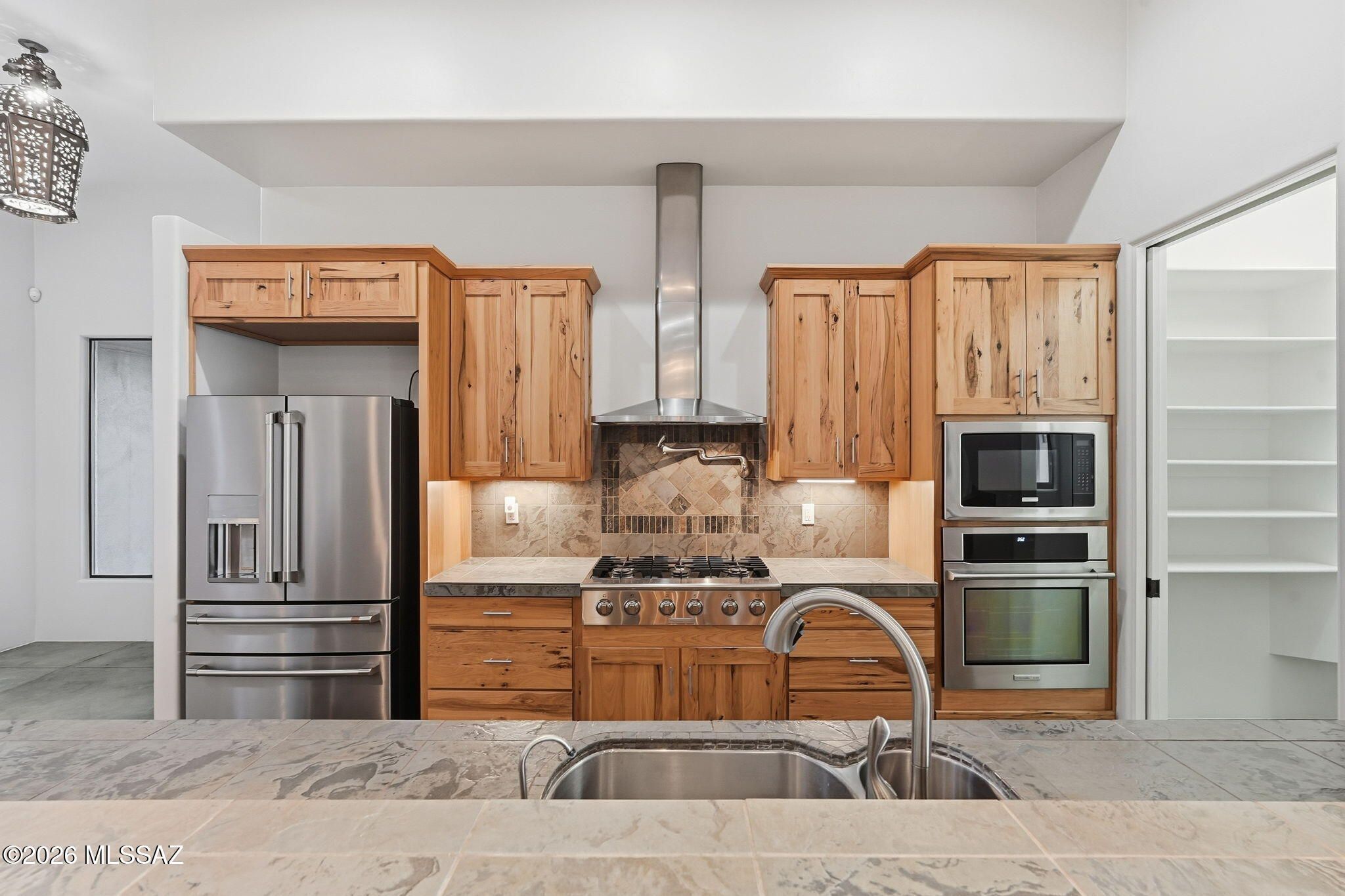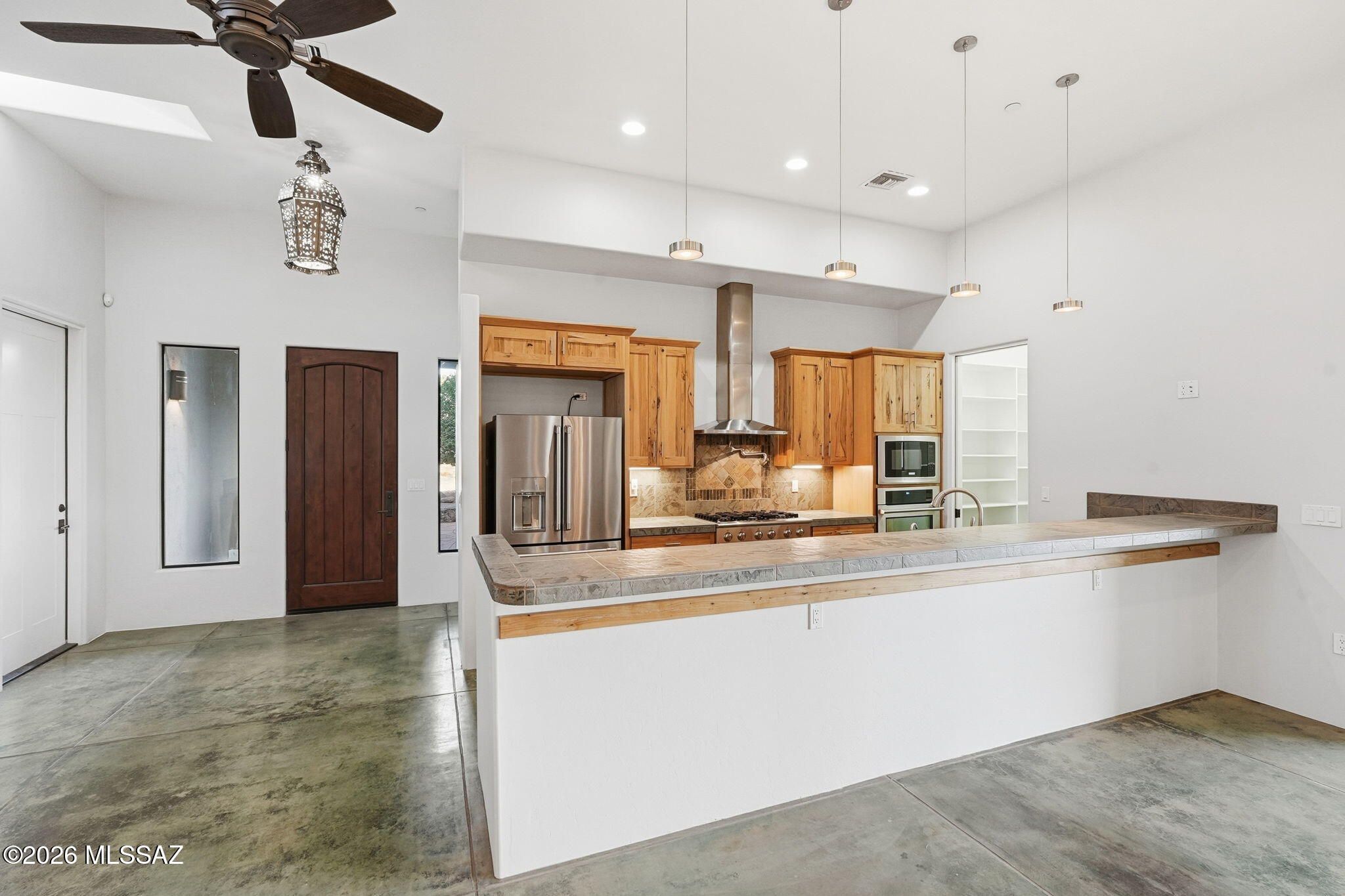 This is where luxury meets creativity, where every space was designed to be experienced--not just seen--and where the desert itself becomes part of the home's story. Before the mountains take your breath away, this home steals your attention. Hidden at the very end of a cul-de-sac in the gated sanctuary of Madera Shadows. As you approach, fresh exterior paint glows against the natural landscape while a softly trickling water feature sets a calming rhythm. Step inside to discover colored concrete floors that flow seamlessly throughout, perfectly complemented by fresh interior paint & abundant natural light. At the heart of the home, the chef's kitchen is both functional and artful, featuring a gas cooktop, tile countertops, custom hickory cabinetry, pot filler, and a generous walk-in pantry.