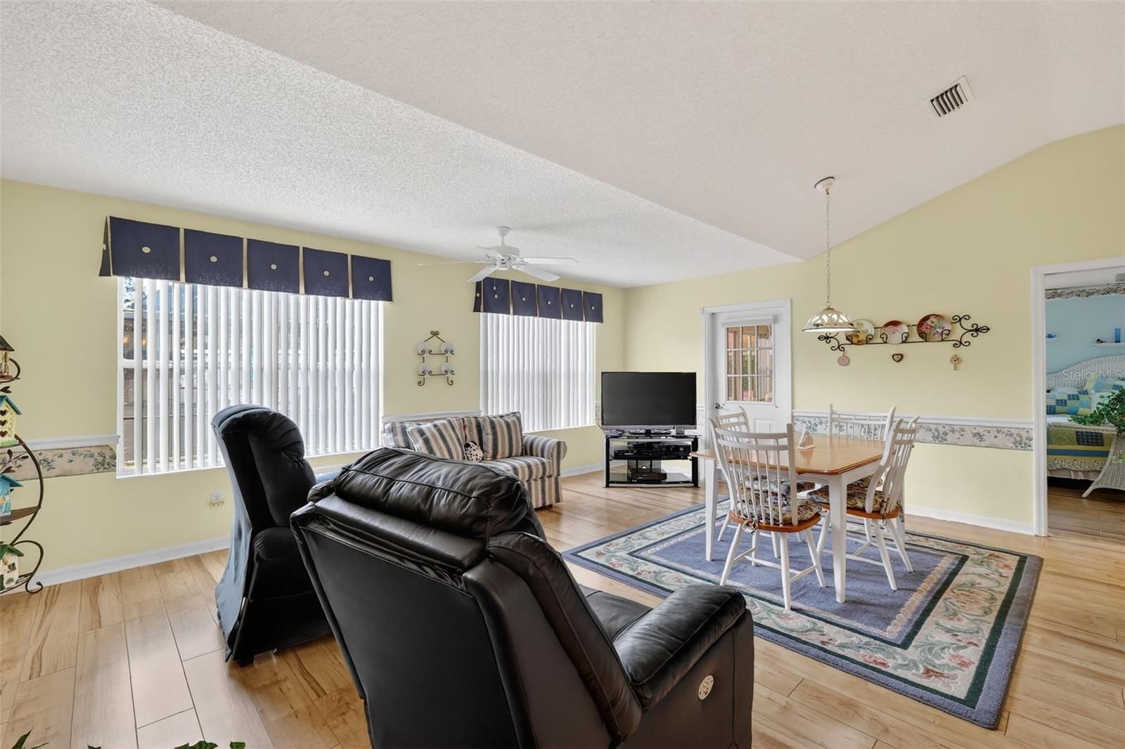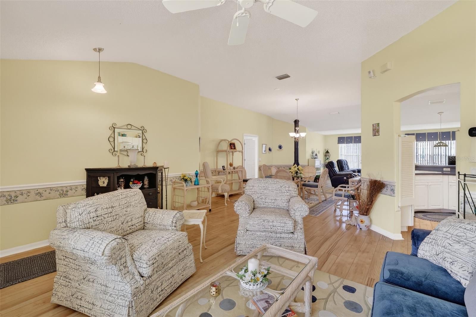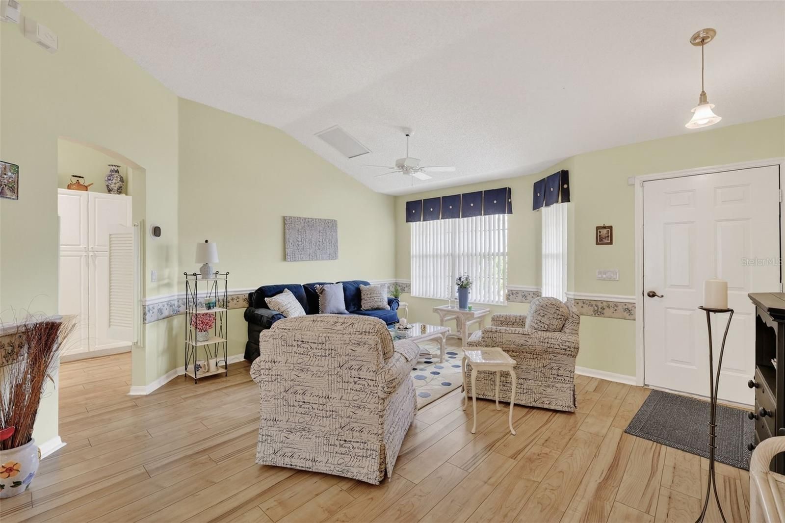 Welcome to this inviting and FULLY FURNISHED 3-bedroom, 2-bath home with 1,774 SqFt of living space, located in the Village of De La Vista in The Villages 55+ community. From the moment you step inside, you’ll feel the home’s charming and welcoming atmosphere, highlighted by light-colored laminate flooring, soothing paint tones, and elegant chair rail accents. The living room blends seamlessly into a dedicated dining room and nicely sized family room with a freestanding electric fireplace in between. The primary suite includes an ensuite bath featuring a walk-in shower and a large walk-in closet. The additional bedrooms and guest bath are thoughtfully located away from the primary suite, providing privacy for both owners and guests. This home is designed with comfort and convenience in mind, featuring an ADA-accessible entryway, wide doorways throughout plus recent updates including a new roof and new HVAC unit. Ideally situated between Spanish Springs and Sumter Landing town squares, you’ll have easy access to dining, shopping, and entertainment. Best of all, this property comes with no bond, offering exceptional value in one of Florida’s most sought-after active adult communities.
