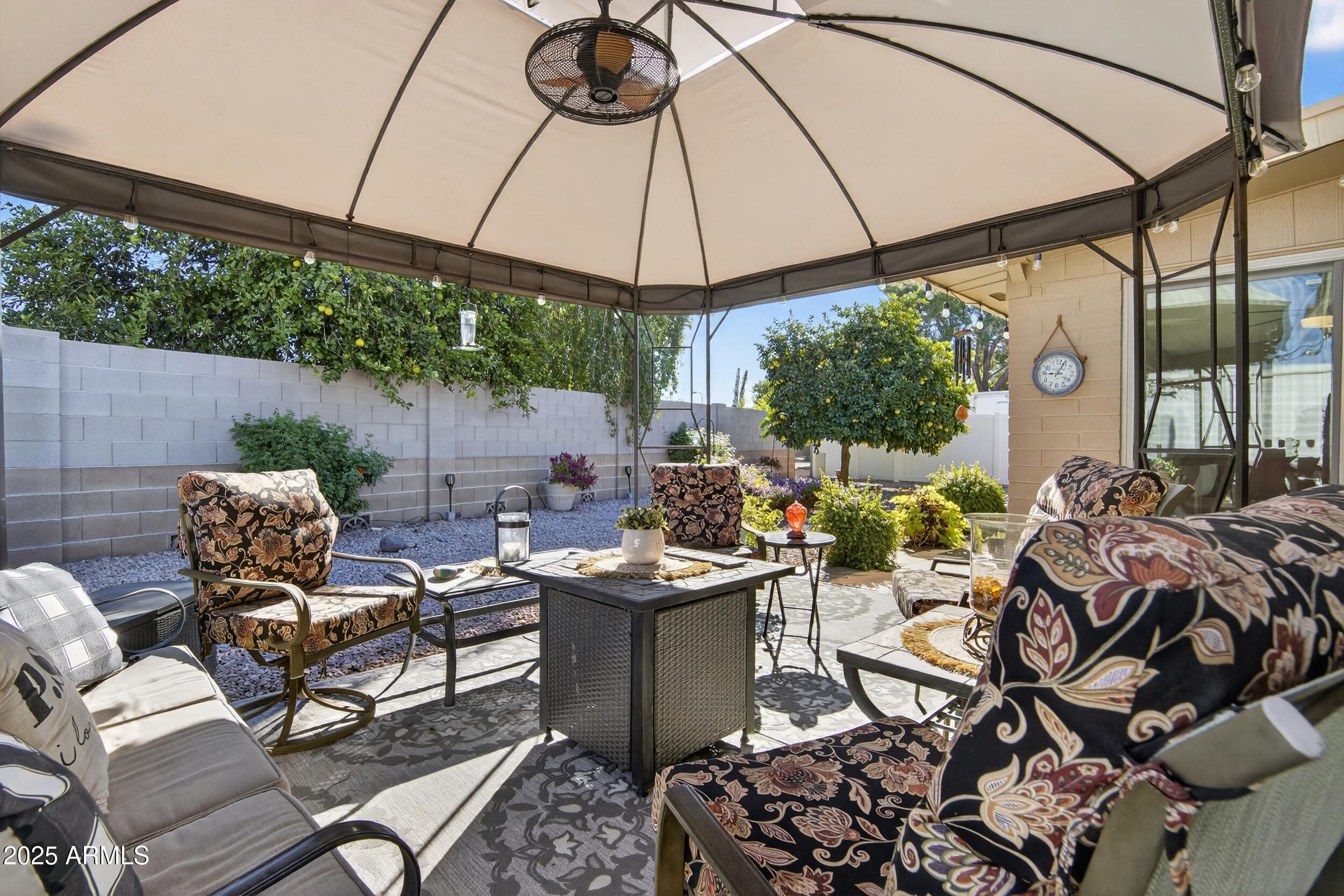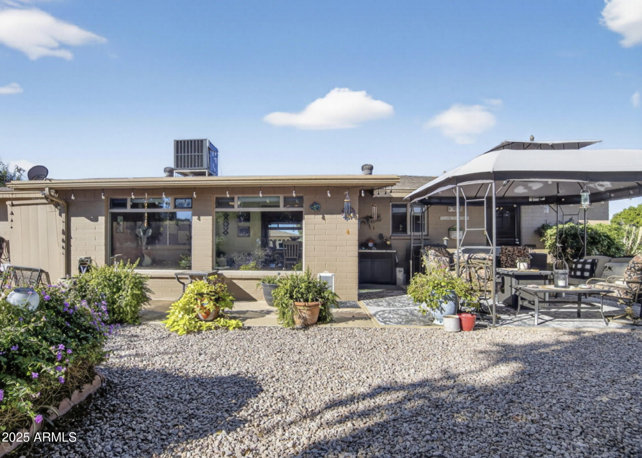 This remarkable property on a prominent corner lot has been meticulously maintained. The 3-bedroom home w/modernized features & upgrades i.e. windows/window treatments, custom paint, new AC, & water heater, premium utility cabinets & much much more. A well-designed kitchen, outfitted w/high-end appliances & granite countertops, a mix of elegance & practicality, w/an open layout that effortlessly flows into a formal dining & living room. Another standout feature is the versatile flex/bonus room. You can customize it to suit your lifestyle as an Arizona room, a hobby area, or cozy spot to enjoy a good visit or morning cup of coffee. The laundry room is also versatile, providing ample space for a home office. One of the owners favorite spots is the enchanting backyard, complete with a garden of plants & large gazebo, the perfect place for relaxing or offering warm hospitality. The property is set up for an RV or utility trailer and includes electric & water hookups. This home has been meticulously maintained, is priced to sell, and move-in ready. Sellers have loved this home, and now it's your turn. Dreamland Villa has loads of community amenities, including 2 Heated Pools, 2 Spas, Pickleball, Tennis, Fitness Center, Crafts, Clubs & More.