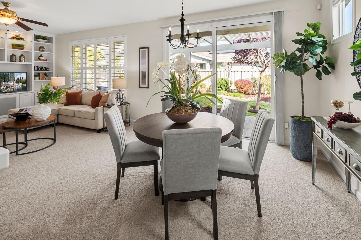 This lovely Alpine model is a true Buyer's dream, move-in ready and richly appointed! Enjoy the fresh, updated feel with new interior paint and new carpeting throughout. The many windows ensure the home is wonderfully light and bright. The desirable open great room concept is perfect for entertaining and features a custom-built entertainment unit surrounding a cozy gas fireplaceideal for chilly evenings. Inside, thoughtful features include stylish plantation shutters for privacy and light control, convenient ceiling fans, large master suite with bump out window and large walk-in closet and a dedicated laundry room with storage cabinets. Outside, the mature landscaping provides a serene backdrop for the backyard, which boasts a delightful pergola patio coverthe perfect spot for outdoor dining, relaxation, and enjoying the California sunshine. This home offers comfort, style, and functional living. Don't miss this opportunity!