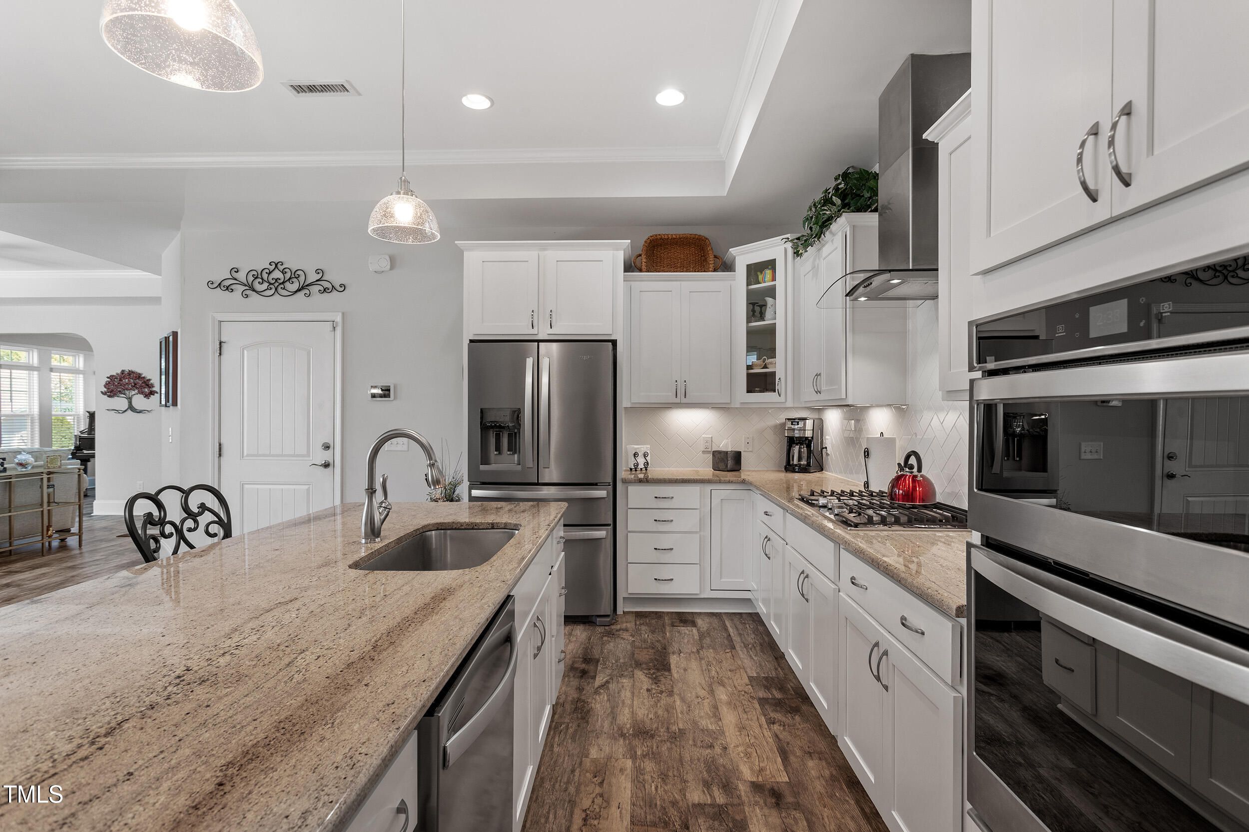 Step inside this beautifully designed ranch-style home where modern comfort meets timeless style. From the moment you enter, soaring ceilings and walls of windows create a light-filled, airy atmosphere that flows seamlessly throughout the open layout. Luxury vinyl plank flooring carries across the main living spaces, offering both warmth and durability, wide, inviting common areas make entertaining effortless. At the heart of the home, the gourmet kitchen is both stylish and functional, featuring classic white cabinetry, gleaming stainless steel appliances, a striking stainless vent hood, and a professional-style gas range that will delight any home chef. The primary suite is a grand retreat, complete with a spa-inspired tiled shower and private access to the screened sitting porch—the perfect spot for quiet mornings or relaxing evenings. A spacious secondary bedroom and a flexible bonus room that provides options for guests, a home office, or a creative studio. Designed with comfort, light, and thoughtful details throughout, this home offers a lifestyle that feels both elevated and welcoming.