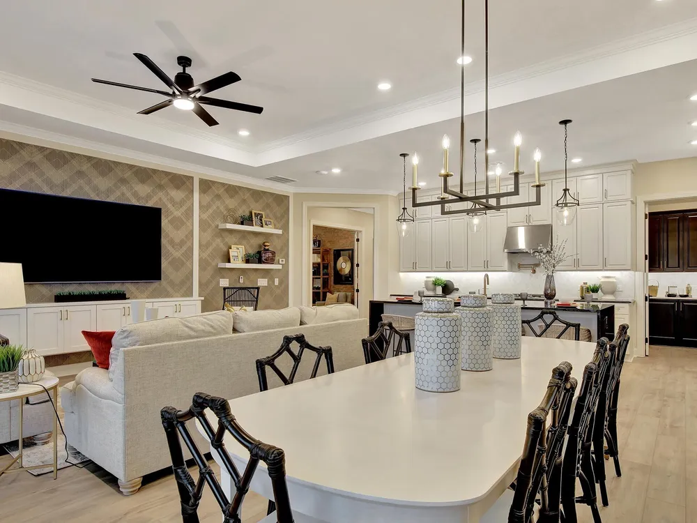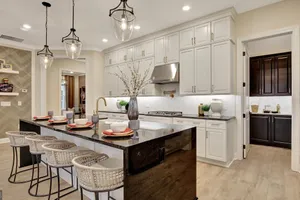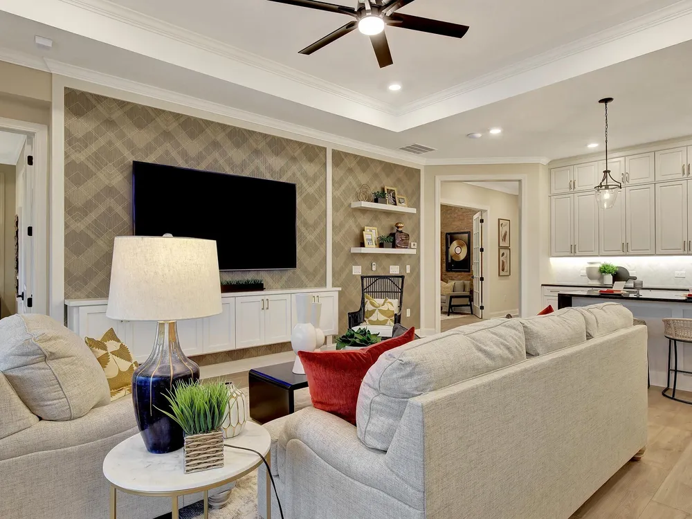 **NEW CONSTRUCTION** Model photos used for reference. Home will be available September 2025. This Julia floorplan offers 2-Bedroom, 2-Bath, Flex Room, and a 2-Car Garage. Upon entry, you'll be welcomed by tray ceilings and luxury vinyl plank flooring that flows seamlessly throughout the main living areas, including the study, gallery, great room, and owner's suite. The private den, framed by double French glass doors, offers a perfect haven for productivity or quiet reflection. A cozy gas fireplace anchors the great room, providing a touch of comfort and sophistication. The heart of the home is a chef-inspired kitchen, beautifully appointed with Lormand Maple white cabinetry, soft-close drawers, and Victorian Silver Quartz surfaces. A generous island invites gatherings, while GE Profile appliances-featuring a 30-inch cooktop and professional-style canopy hood-enhance both functionality and style. Under-cabinet lighting and pendant fixtures provide a warm, ambient glow. The owner's suite bath has a spa-like sanctuary with a full-height, frameless glass shower tiled to the ceiling, complemented by warm Lormand Maple Colt cabinetry and gleaming Miami White Quartz countertops. Additional features include a 4-foot garage extension, perfect for added storage or a workshop, a utility tub rough-in in the laundry room for convenience, and a spacious extended lanai ideal for outdoor lounging or entertaining.