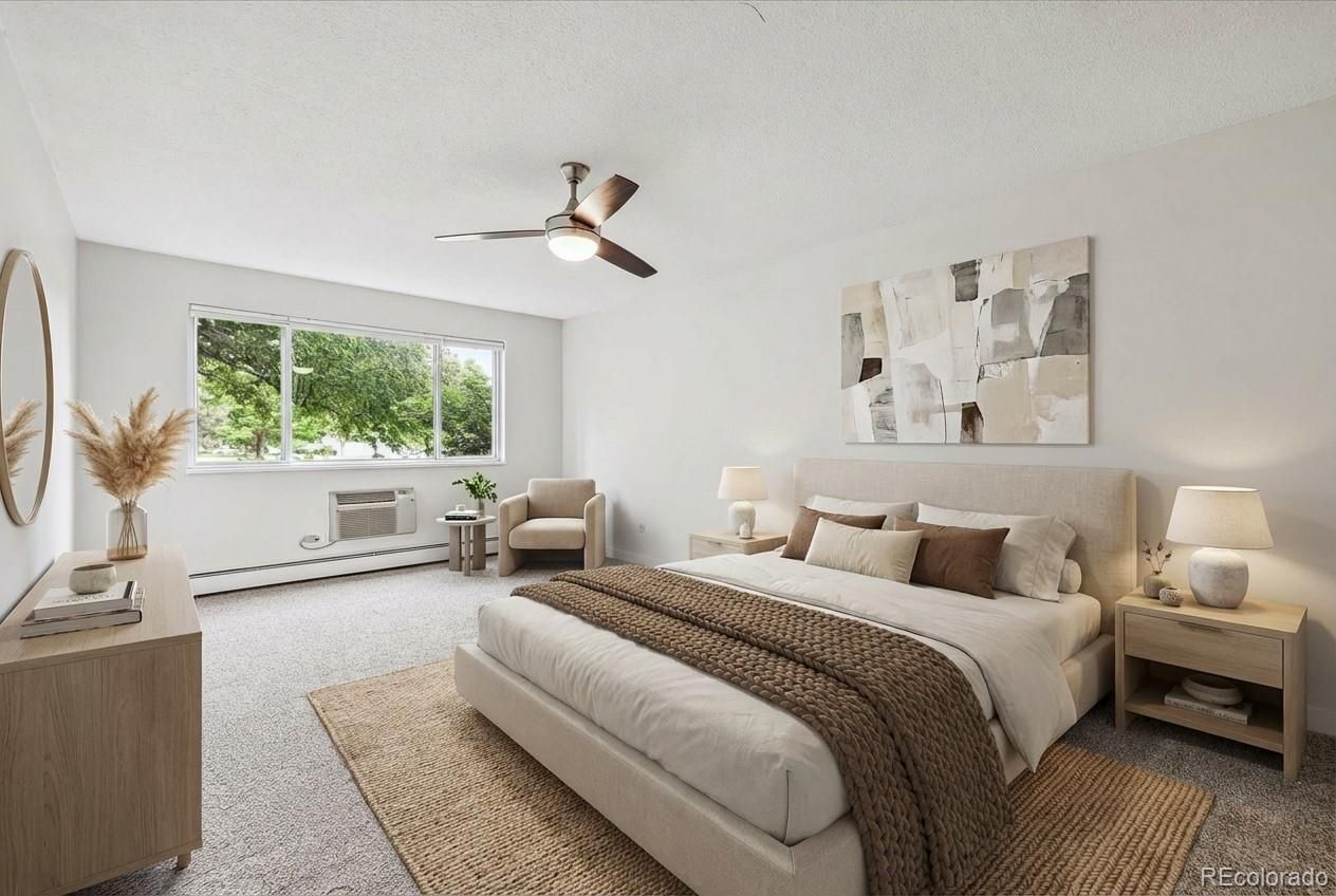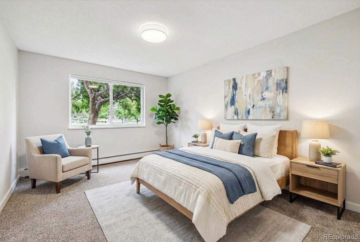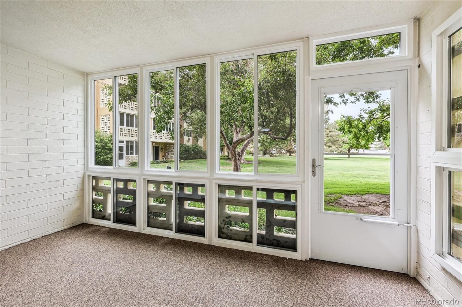 Golf Course Views from 1st Floor Condo! Remodeled and beautiful, this property is 1200 sf, with 2 bedrooms, 2 bathrooms, multi-purpose room, and 1 detached garage included! Kitchen features open floorplan- newer cabinetry freshly painted white, stone slab counters, tile backsplash, stainless appliances, tile floor, and spacious pantry. Bathrooms remodeled with tall white vanities, updated fixtures, lighting, and tile surrounds in both tub and shower. Primary bedroom is oversized with en-suite 3/4 bathroom and oversized walk-in closet. All new carpet and interior nuetral 2 tone paint color scheme. Enjoy the vast golf course scenery from this double pane vinyl enclosed lanai with tile floor. Bonus storage room in building. Additionally there are 2 updated wall ac units- one in living room, the other in primary bedroom. This condo is a must see!**Windsor Gardens is Colorado's Largest Age 55+ Active Adult Living Condo Community. Did you know? Monthly HOA Dues include annual property taxes! And heat, water, sewer, trash, round-the-clock patrolling community responders, full time onsite association management, grounds/building maintenance, and activities department. Enjoy clubhouse amenities such as fitness center, indoor/outdoor pools, hot tub, sauna, billiards, library, craft rooms for ceramics, sewing, woodworking, and 9 hole par 3 golf course and onsite restaurant both open to the public. Stay engaged with a wide array of activities, clubs, and events scheduled every month. Additional features include garden plot program, private walking trail and nature preserve, and RV/Boat storage. The Highline Canal runs full length along south side of the complex. RTD Bus Stops located thru-out the community. FHA/VA approved. Close to restaurants, stores, shopping…Minutes to Lowry, Hwy 225, Cherry Creek…Easy access to DIA and downtown. Come see for yourself what Windsor Gardens has to offer. ©2021**
