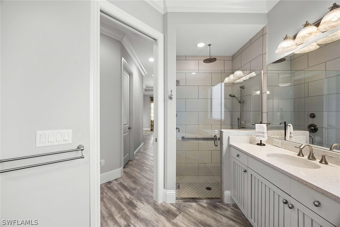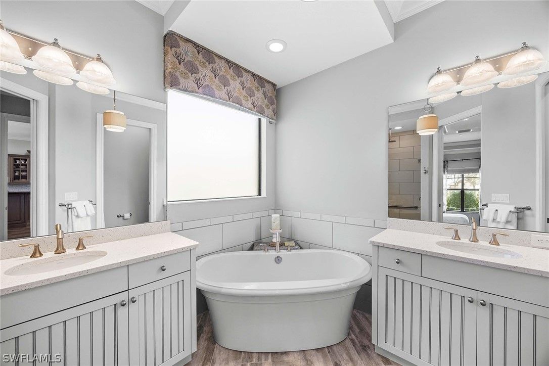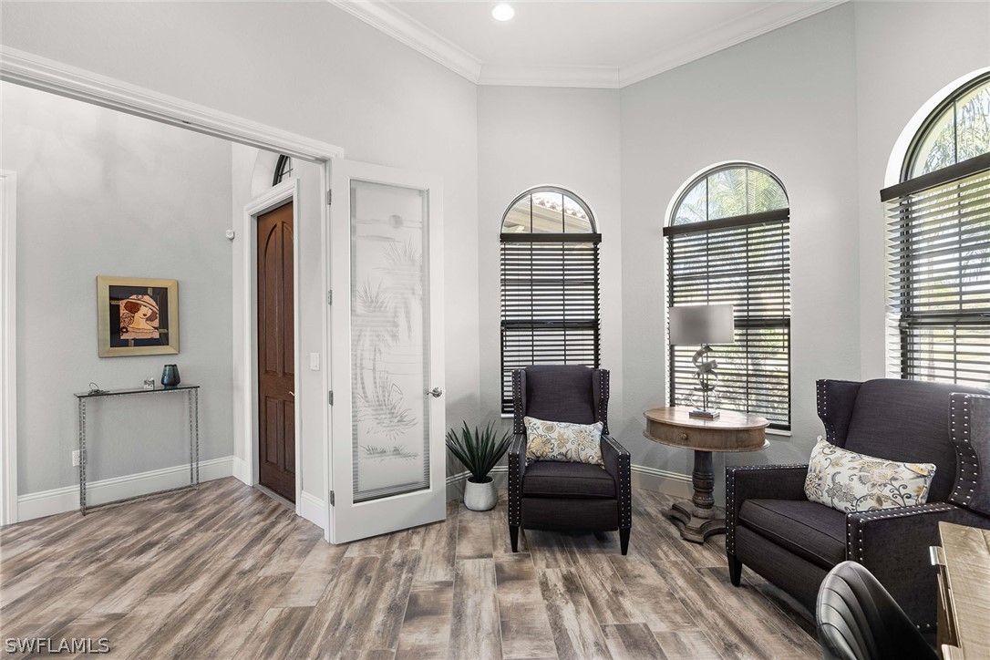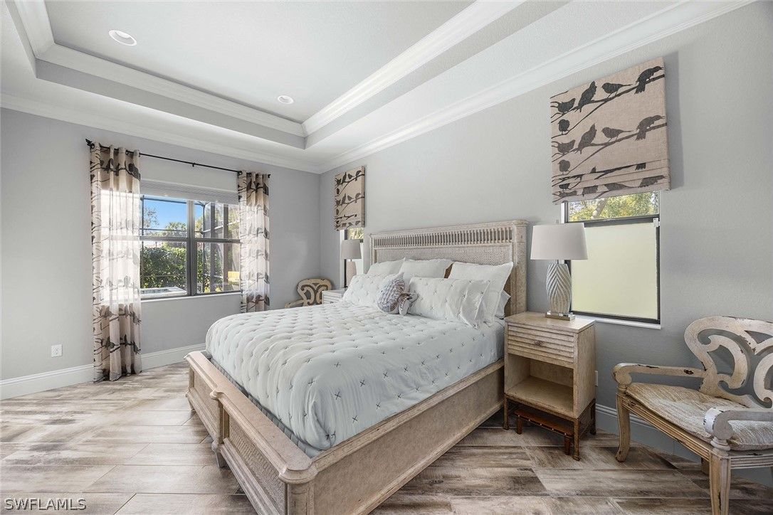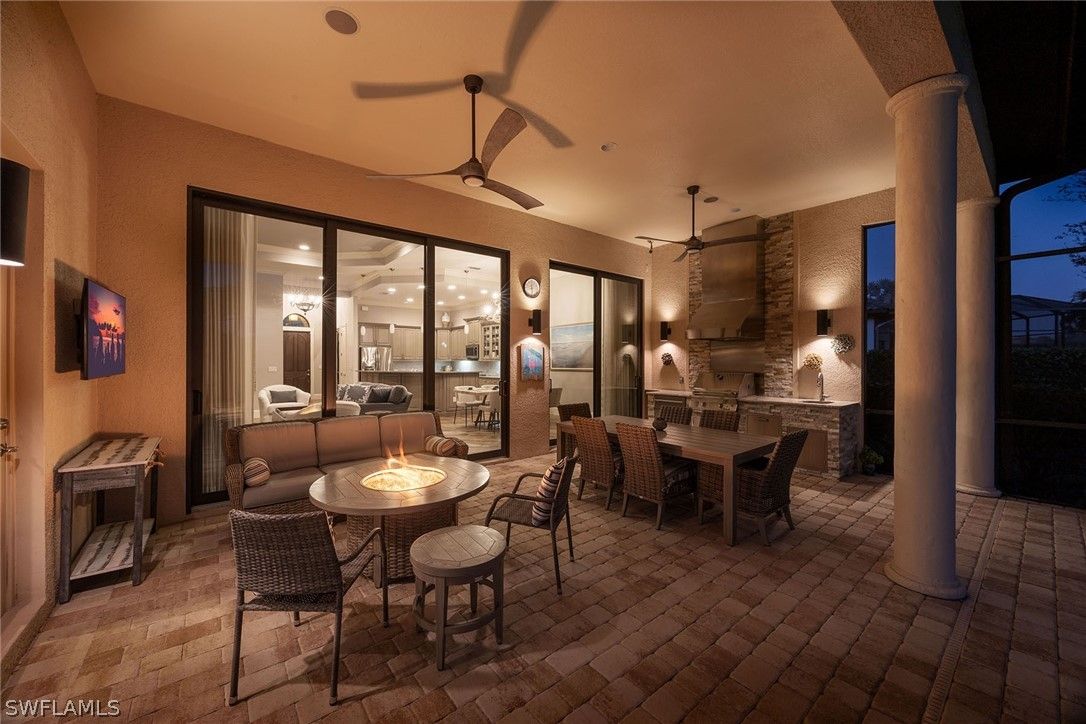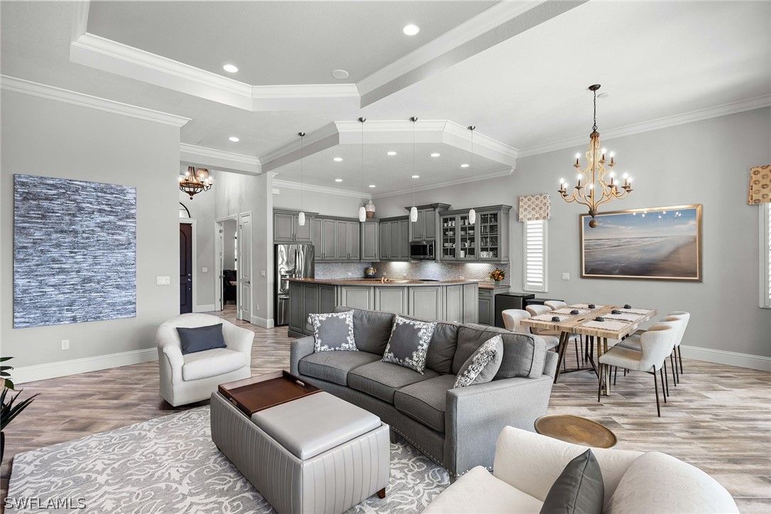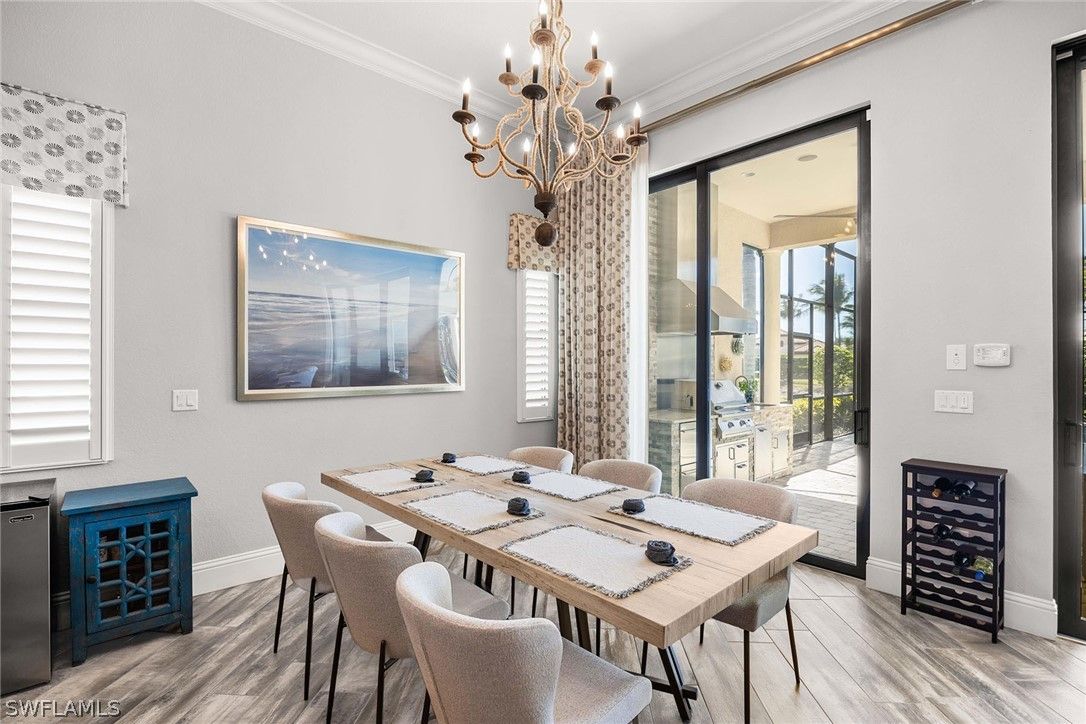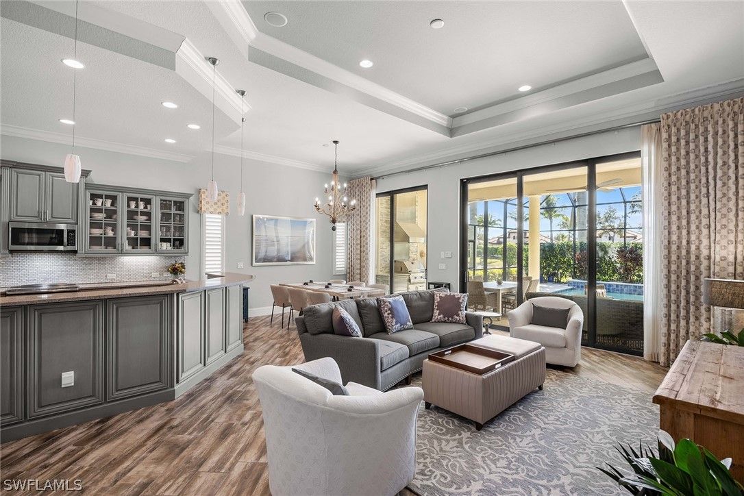 A unique property! Immaculate home on a large pie-shaped lot at end of a quiet cul-de-sac. An oversized lanai, heated saltwater pool and spa, extensive covered outdoor space with a custom outdoor kitchen offer a fabulous entertaining space and an oasis of privacy and calm. Furnished and move-in ready. In the prestigious gated and guarded Lakoya community at Lely Resort with picturesque lake views and a southern exposure. A home that is distinctive and inviting, a blend of comfort and luxury. Upgrades throughout the home include soaring and coffered ceilings, crown moldings, durable wood plank tile flooring, impact-resistant windows and glass doors. The open floor plan and 10-foot sliding glass doors provide a seamless connection between interior and exterior living spaces. The kitchen is thoughtfully designed with upgraded cabinetry and quartz countertops to accommodate culinary preparation and hosting. The primary suite includes two spacious walk-in closets, dual vanities, a free-standing tub and a rain shower head. The two-car garage is oversized. The Players Club at Lely Resort offers two restaurants, amazing pools, spa and fitness center with classes, tennis, pickleball and bocce. Lely Resort is also home to a private golf club and two public golf courses.