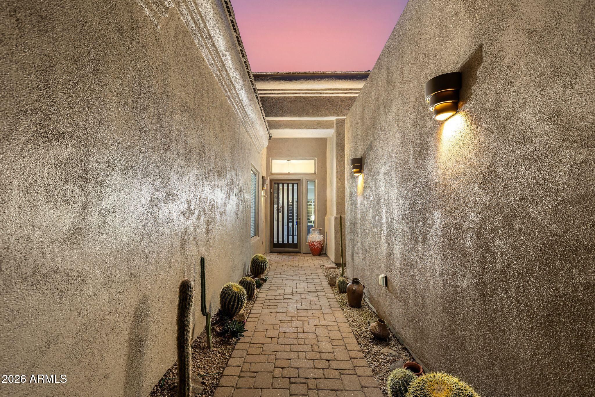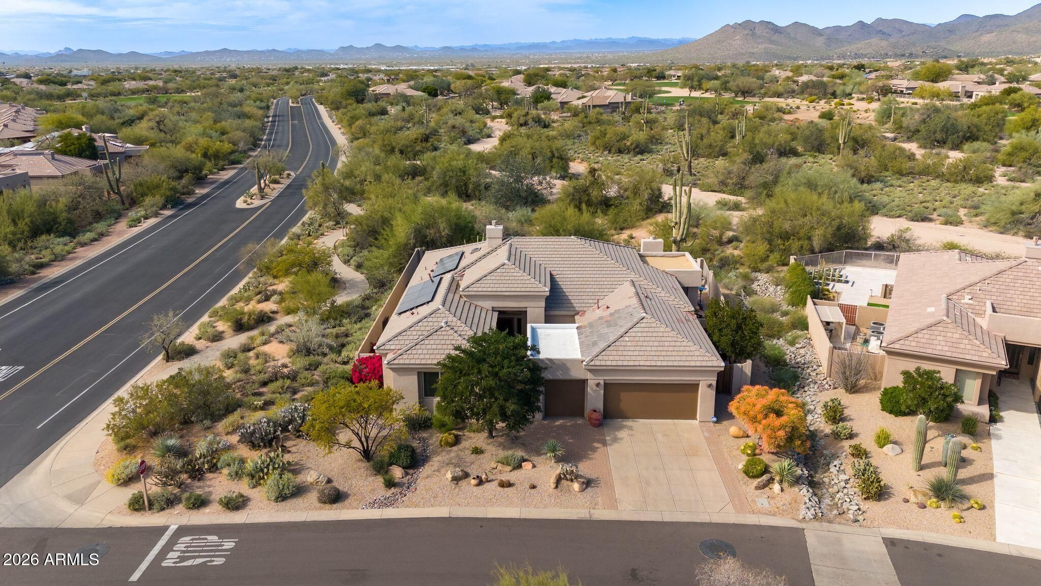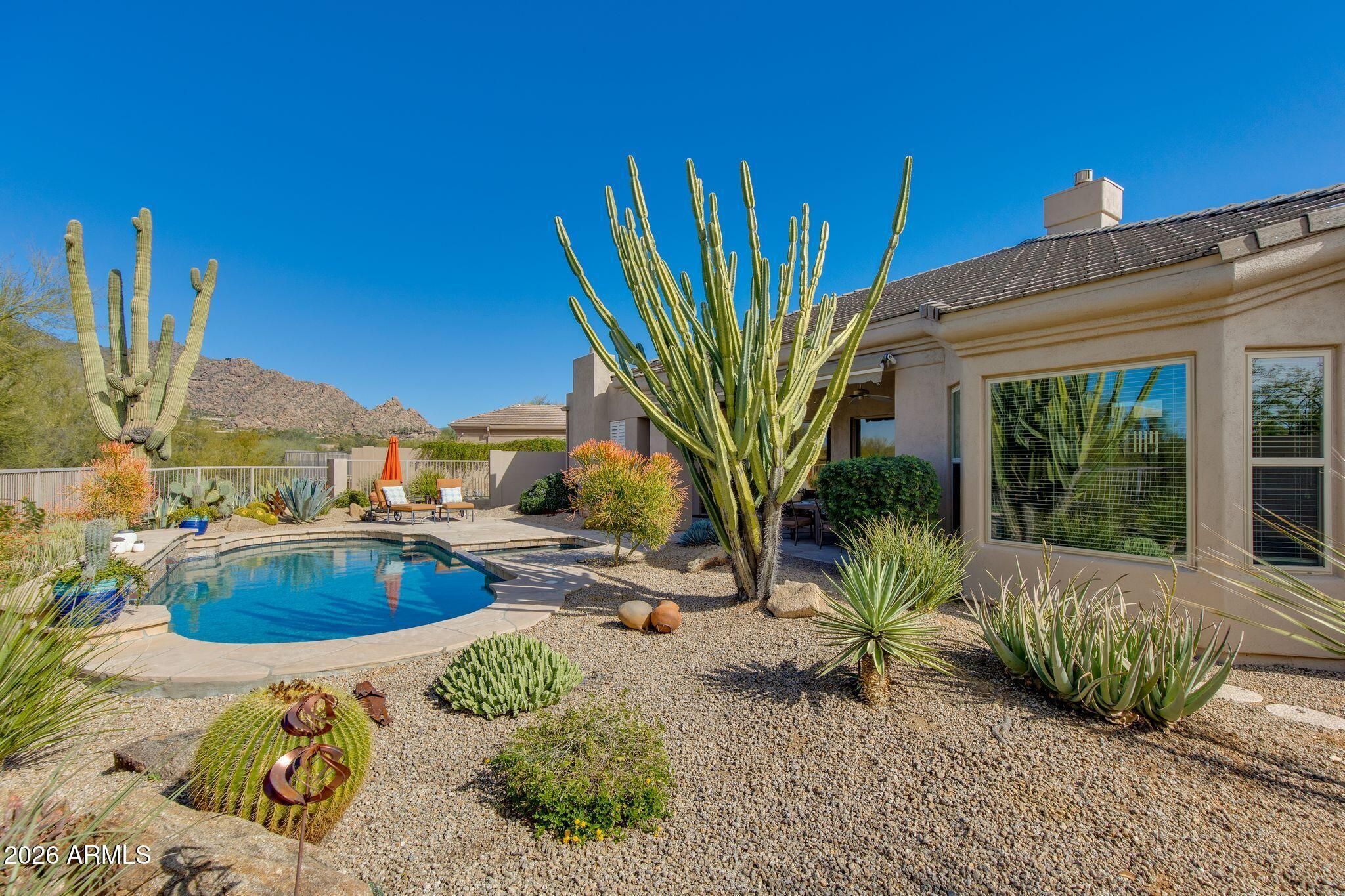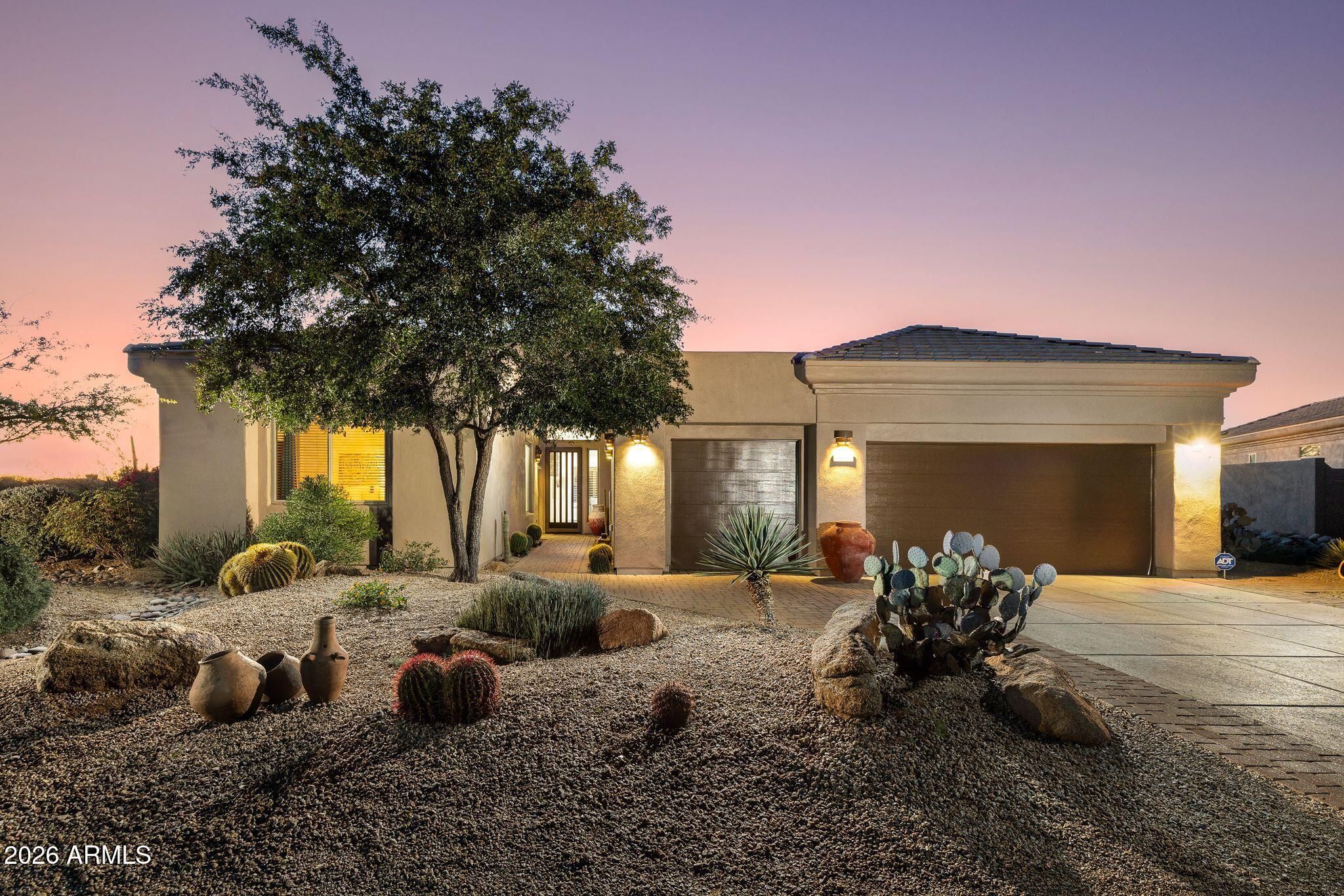 This highly sought-after Caelum Model has been beautifully upgraded and meticulously maintained, offering the perfect blend of elegance, comfort, and smart investment. From the moment you step through the stunning White Oak and glass entry door, you'll notice the fresh, high quality designer paint and light-filled spaces that create a warm, sophisticated feel throughout. Major improvements provide peace of mind and long-term value, including a brand-new roof (January 2026) and owned solar panels, also upgaded in January 2026 - delivering energy efficiency with no lease to assume. Step outside to your private backyard retreat, offering unspoiled mountain views and featuring a PebbleTec pool and spa resurfaced in 2022, perfect for relaxing evenings or entertaining under the Arizona sky. Additional highlights include a golf cart garage (third bay)- ideal for Terravita's golf lifestyle - and a beautiful Arizona Room just off the kitchen, creating extra space to unwind or host guests. This is more than a home - it's a lifestyle upgrade in one of North Scottsdale's most desirable communities.