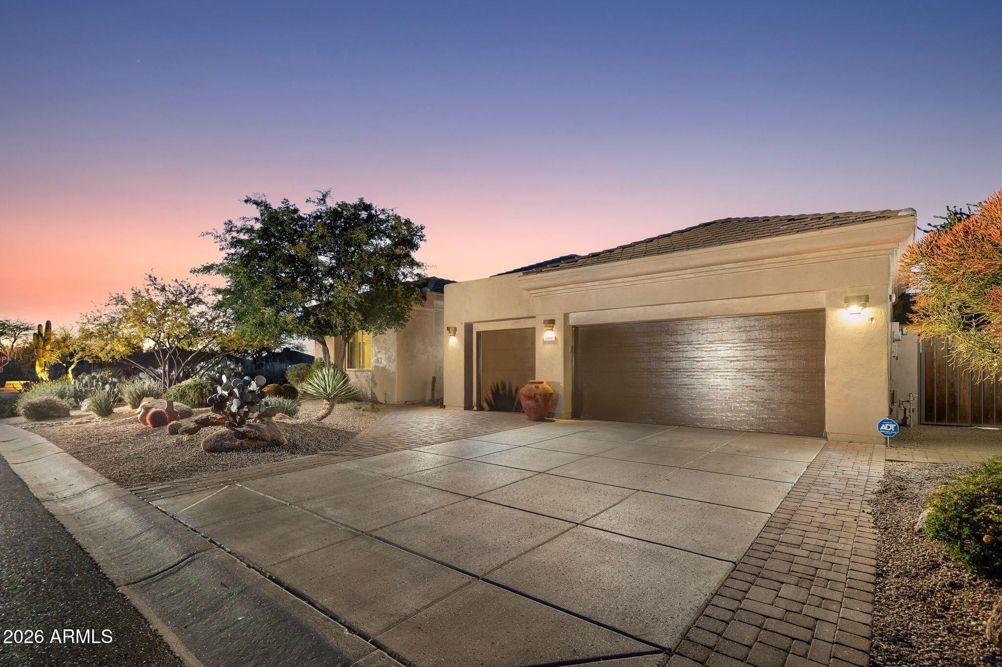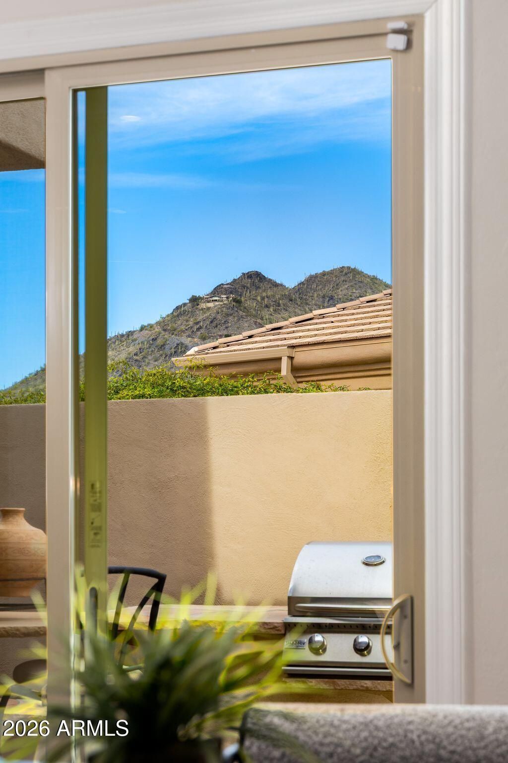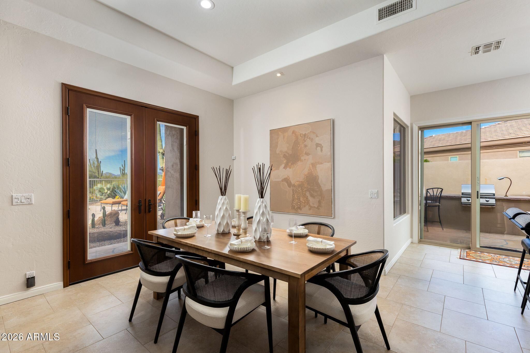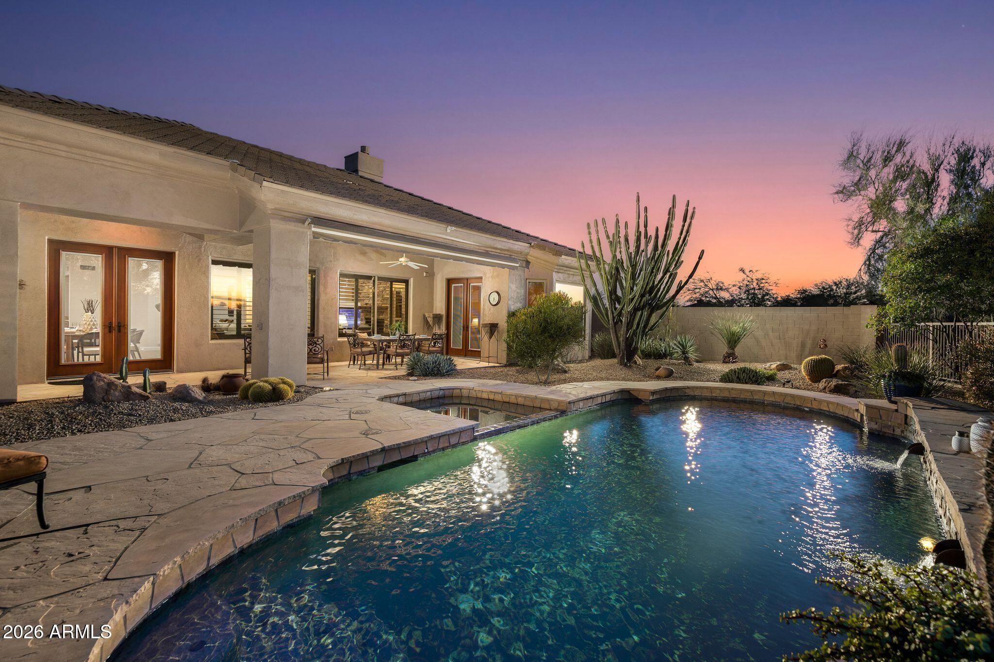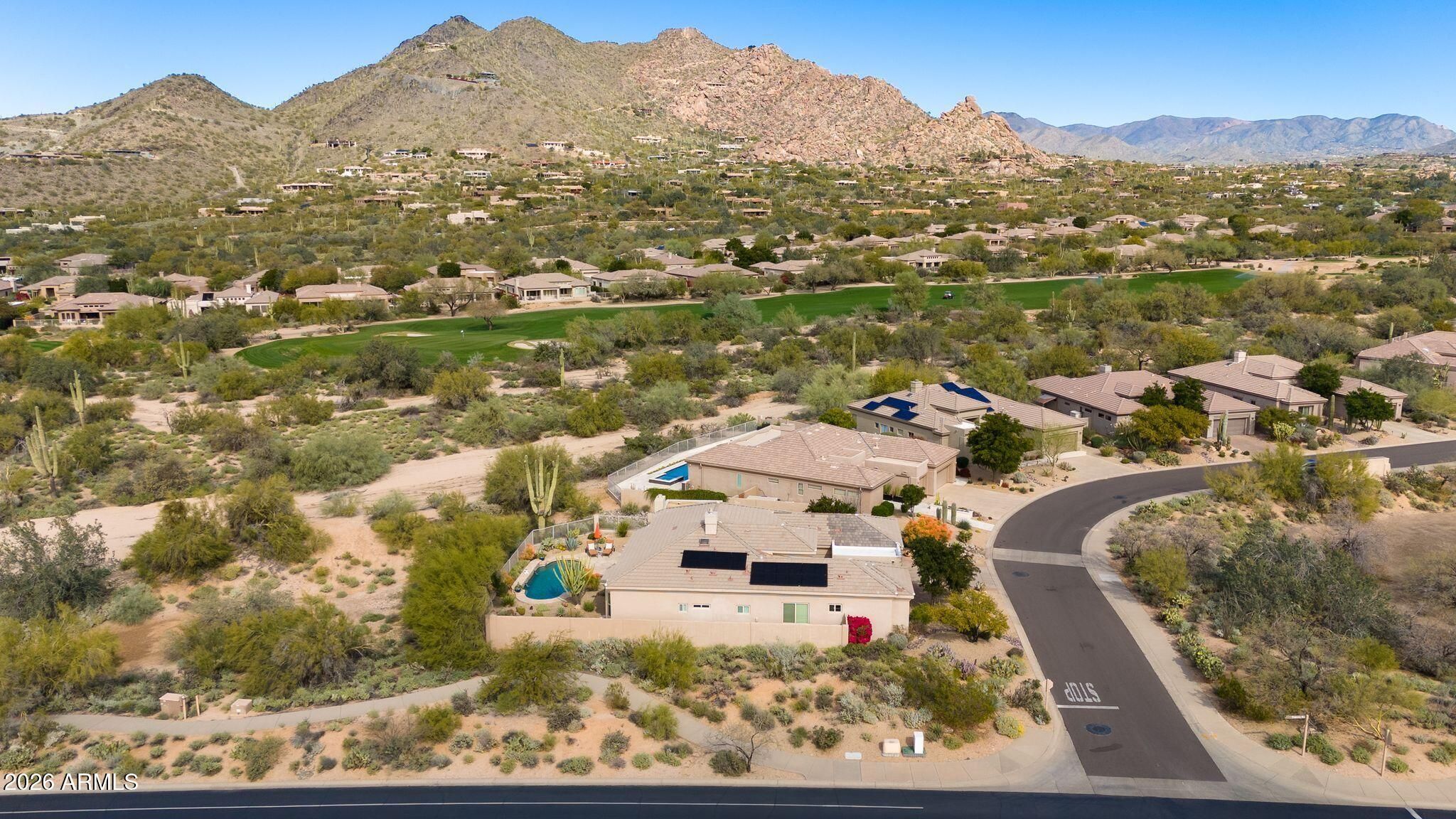 This highly sought-after Caelum Model has been beautifully upgraded and meticulously maintained, offering the perfect blend of elegance, comfort, and smart investment. From the moment you step through the stunning White Oak and glass entry door, you'll notice the fresh, high quality designer paint and light-filled spaces that create a warm, sophisticated feel throughout. Major improvements provide peace of mind and long-term value, including a brand-new roof (January 2026) and owned solar panels, also upgaded in January 2026 - delivering energy efficiency with no lease to assume. Step outside to your private backyard retreat, offering unspoiled mountain views and featuring a PebbleTec pool and spa resurfaced in 2022, perfect for relaxing evenings or entertaining under the Arizona sky. Additional highlights include a golf cart garage (third bay)- ideal for Terravita's golf lifestyle - and a beautiful Arizona Room just off the kitchen, creating extra space to unwind or host guests. This is more than a home - it's a lifestyle upgrade in one of North Scottsdale's most desirable communities.