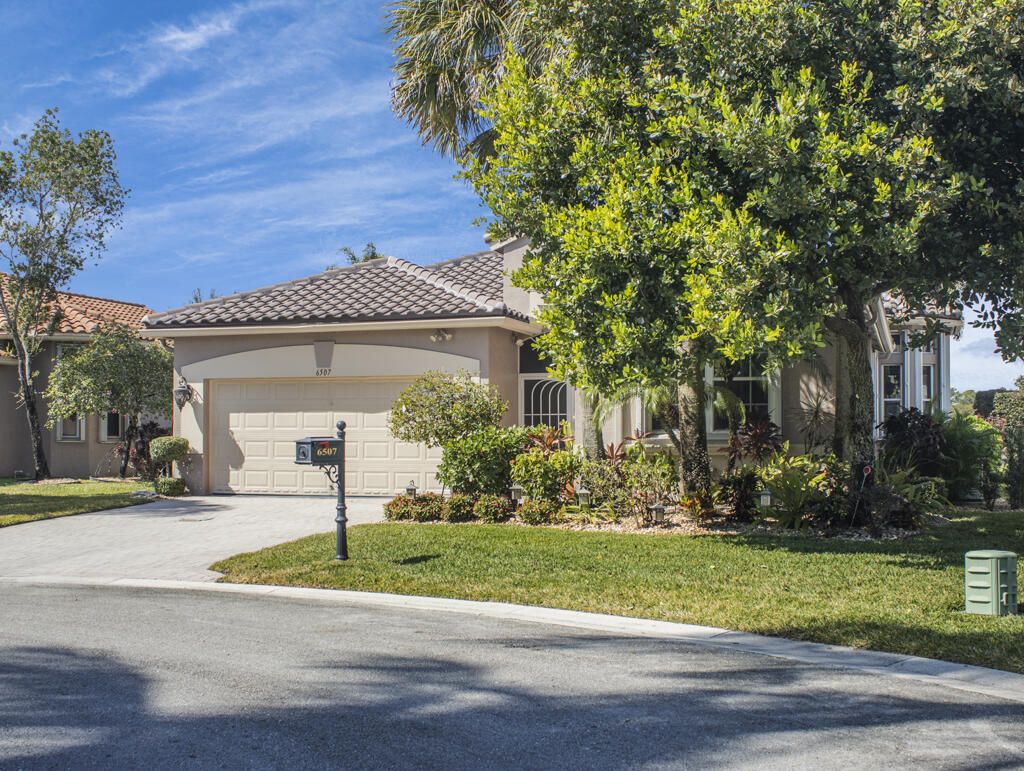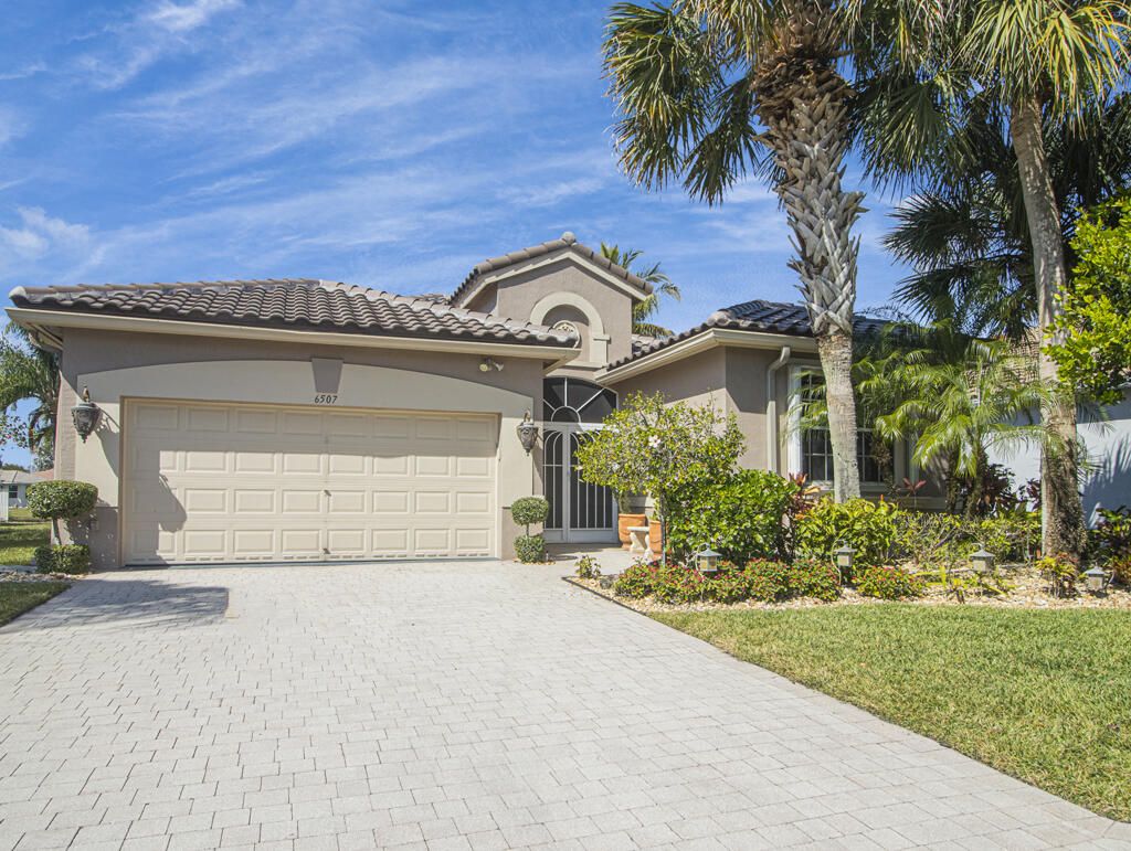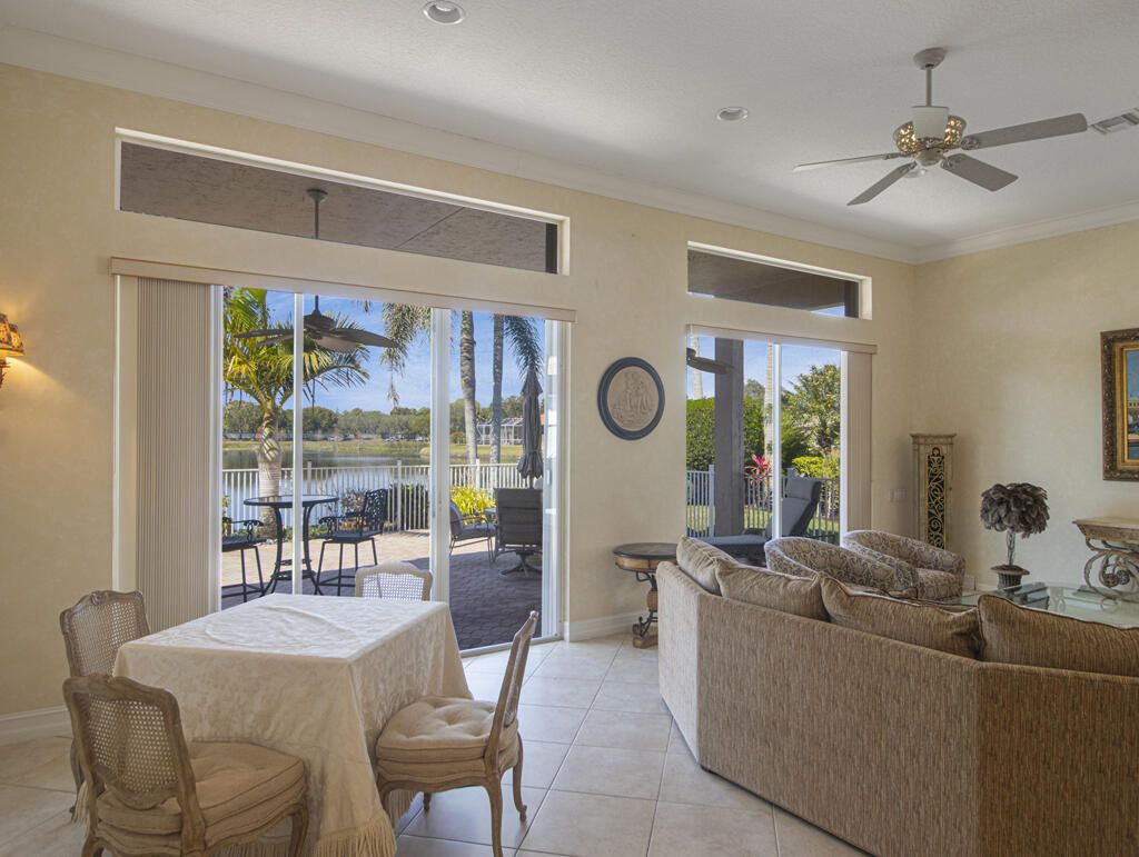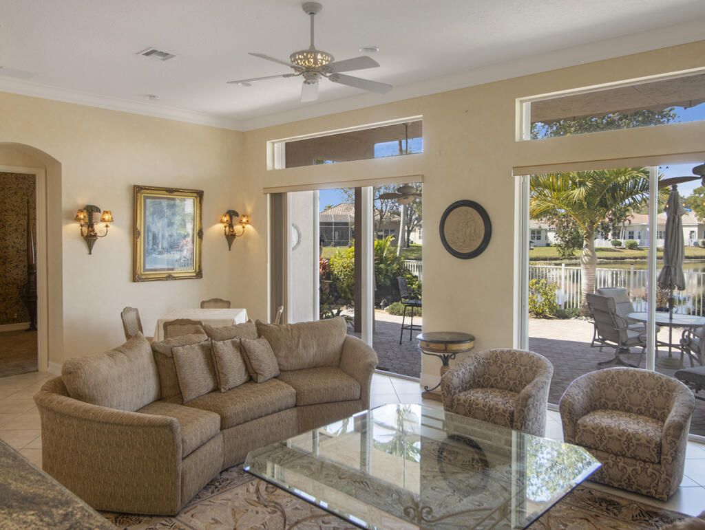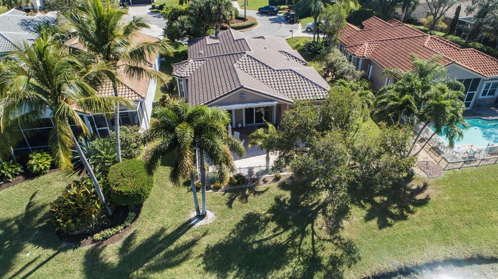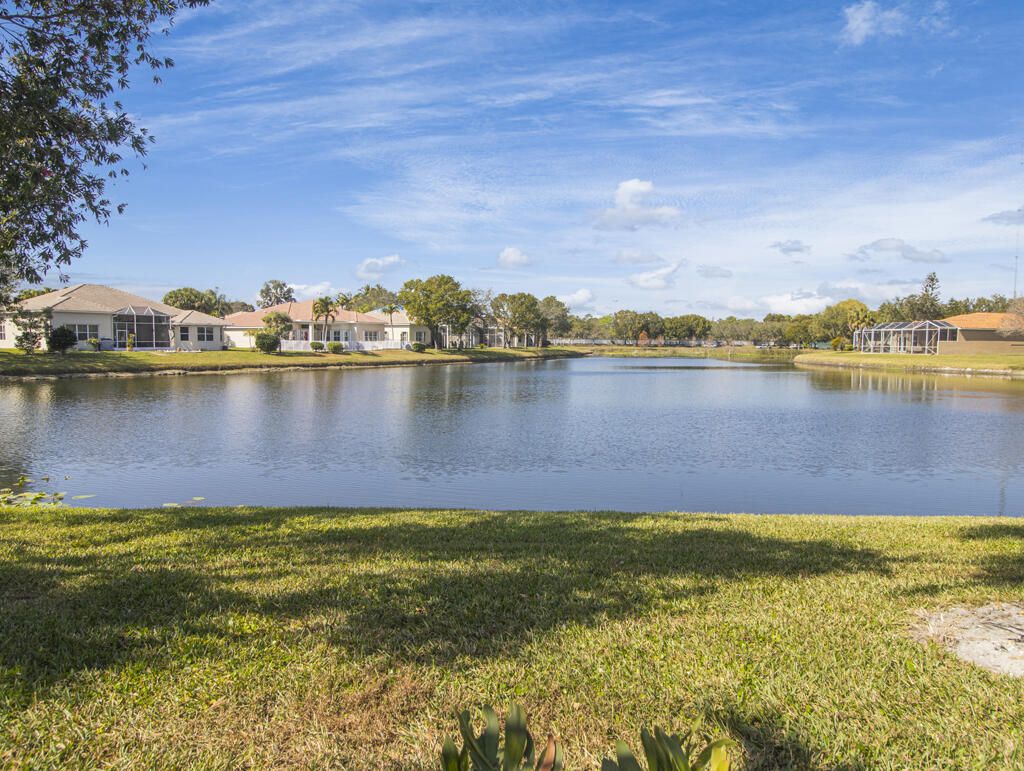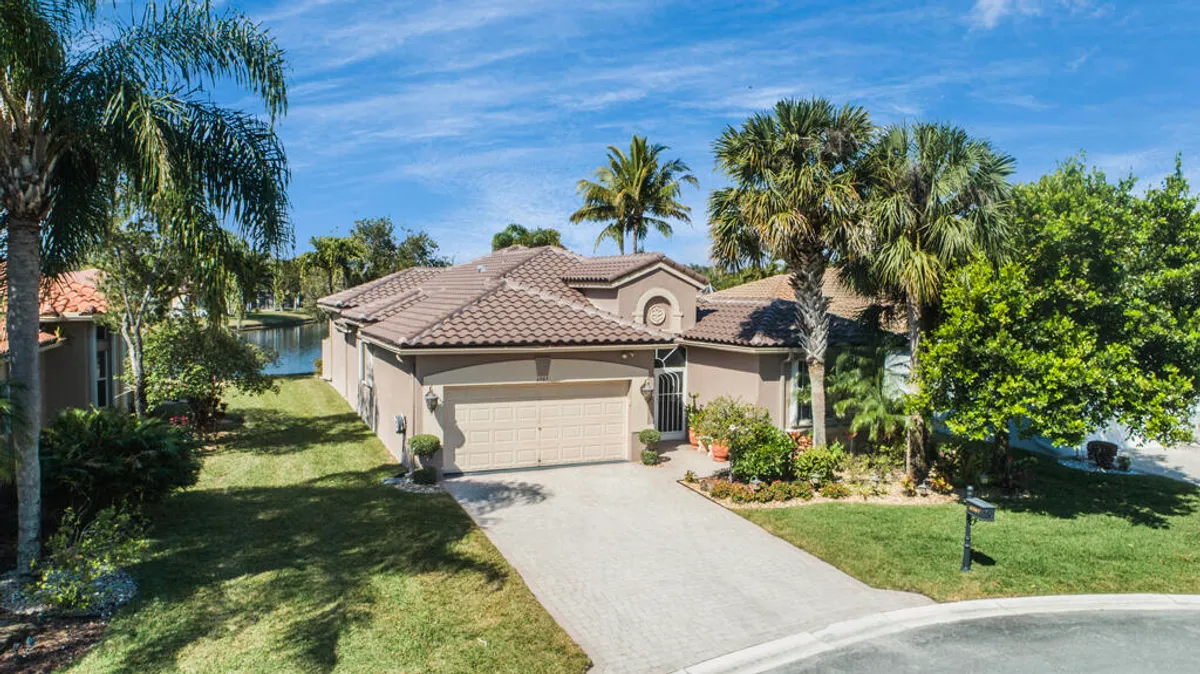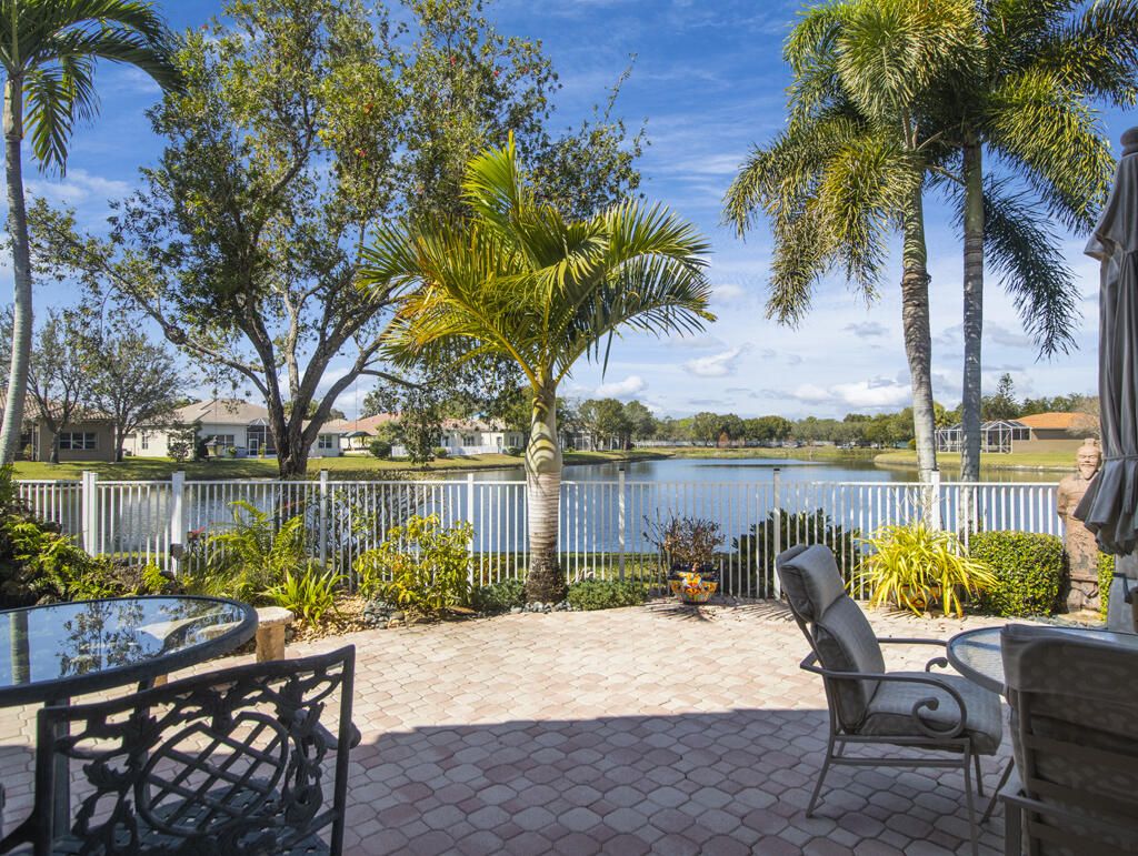 Step into S. Florida's best, a sophisticated LAKEFRONT on a CUL DE SAC in luxurious Bellaggio, an active adult community. Enjoy uncommon peace of mind with features such as: new 2024 ROOF, 2025 Whole-house GENERATOR, 2021 AC w/UV PURIFICATION, 2022 water heater, 2023 refrigerator, 2024 washer/dryer and Accordion shutters throughout. The traditional interior is a perfect canvas for your personal touches. Note, Murphy's bed, bay window bench, high ceilings & large windows flood the space with natural light & dreamy lake views. The oversized & fenced patio is a tropical showstopper with coy-pond, exotic palms & sculptures. Centrally located with quick access to the FL Turnpike, 441, the beach, equestrian sports, hospitals, PBI airport & miles of shopping & dining - this home has it all. Measurements and information offered is deemed reliable but is not guaranteed. Storage cabinets in the garage convey. Offered As-Is with right to inspect.