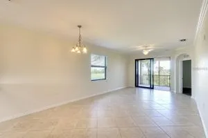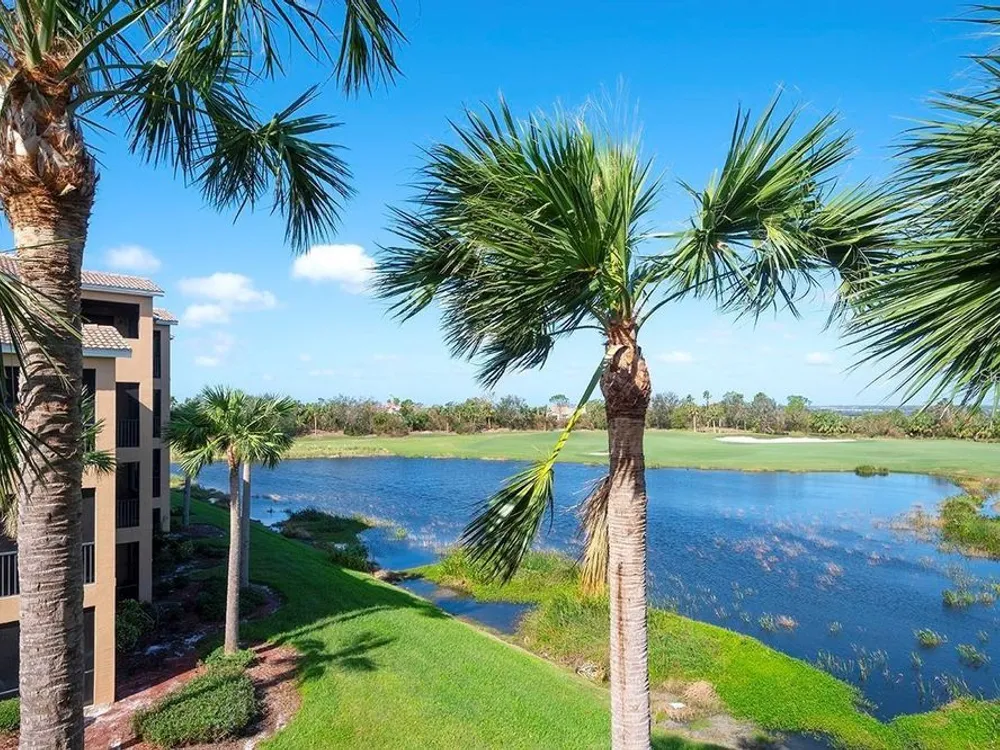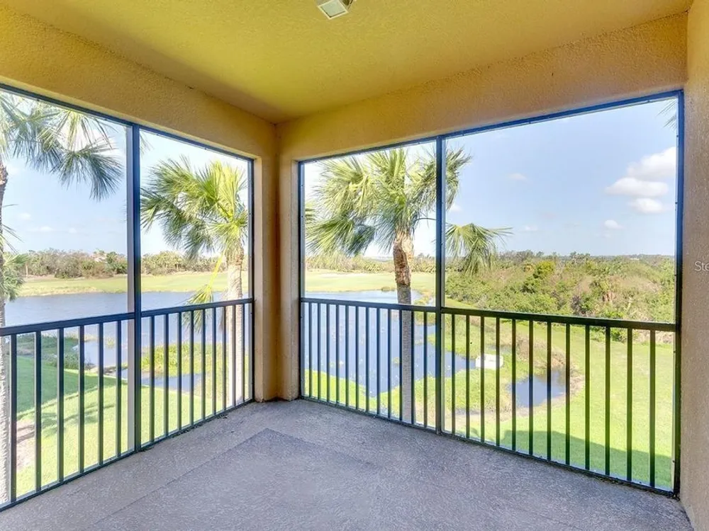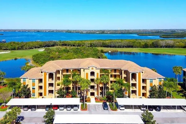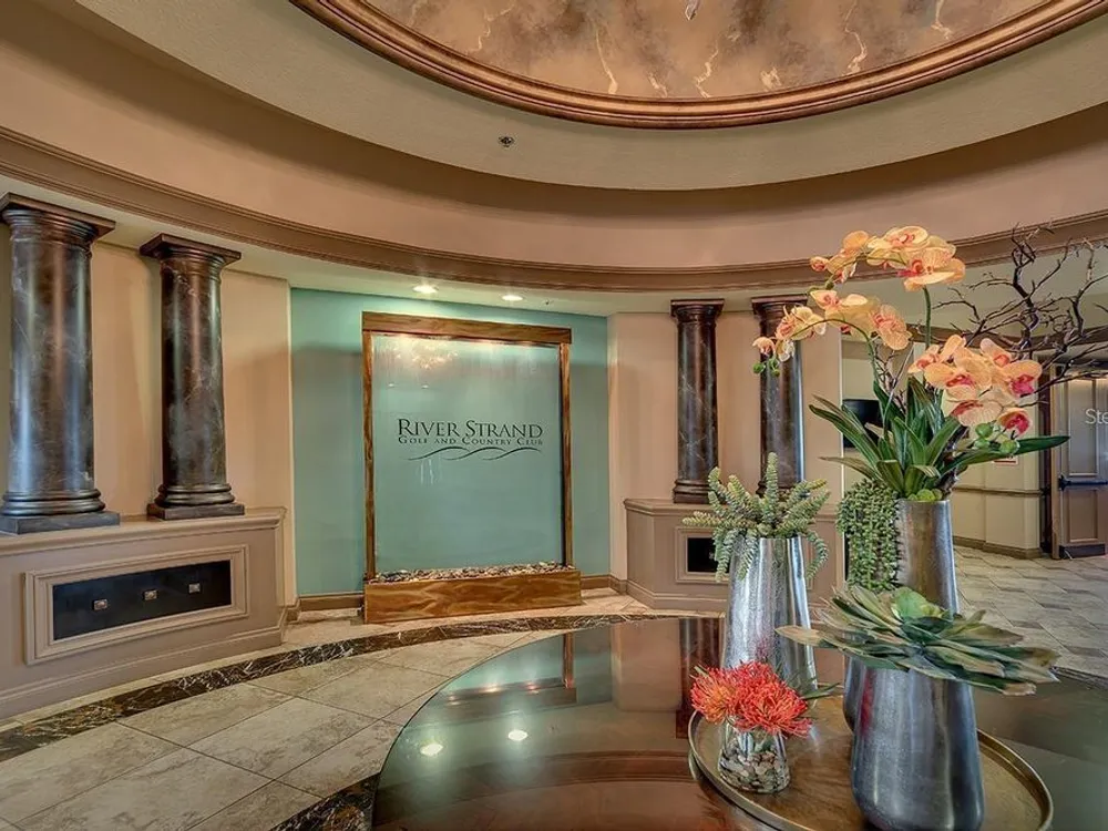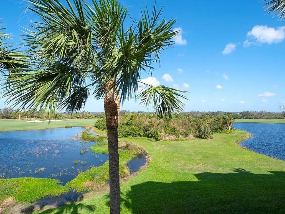 Nestled securely within the gates of River Strand Country Club you’ll enjoy outstanding WATER AND GOLF COURSE VIEWS from this popular COLONADE END-UNIT, the largest of The Terrace’s floor plans featuring 2 bedrooms, 2 full baths and versatile DEN. VACANT and ready for immediate occupancy, the home is a blank canvas awaiting your personal touches. Notable features include: an open floor plan, porcelain floor tiles installed on the diagonal, crown moldings, screened lanai and outside storage room for bicycles & beach chairs. HURRICANE RESISTANT WINDOWS & PATIO DOORS provide safety and peace of mind, in fact, the building was virtually unscathed in two of the worst storms in recent history, a testament to the construction and protected location. The spacious eat-in kitchen, central to all activities, features granite countertops with breakfast bar, solid wood cabinets, stainless-steel appliances, pantry, and the convenience of a separate adjoining laundry room. The owner's suite features ensuite bath with his & hers walk-in closets. The versatile den with pocketing double doors is valuable bonus space adaptable to a variety of uses including home office, media room or extra guest space if needed. Ownership includes DEEDED SOCIAL MEMBERSHIP in the 39,000 sq ft Tuscan inspired club house with on-site restaurant and grill room, 2 state of the art fitness centers with 24/7 access, Tiki Bar, 2 resort style pools with hot tub and resistance pool, plus 8 heated satellite pools, Pickle Ball courts plus separate tennis club with 8 Har-Tru lighted courts. The convenience of this LOCATION cannot be overstated as it’s ideally situated just minutes from all essential amenities and top attractions. 1.4 miles to the new Marketplace at Heritage Harbour home to Costco, Target, Miller’s Ale House, Academy Sports & Hobby Lobby with several more stores proposed. 3.4 miles to the Walmart Super Center, 3.5 miles to Home Depot, 6 miles to the Ellenton Premium Outlet Mall and 16 miles to the Bradenton/Sarasota Int’l Airport. With easy access to I-75 the University Town Center with upscale shopping and dining is 10 miles as well as the many attractions of downtown Sarasota and Bradenton, multiple performing arts venues, galleries, world class dining, award winning beaches, golf courses and so much more…just minutes away. LIVING IS EASY & SECURE in this ACTIVE LIFESTYLE COMMUNITY, and you’ll love the LOCK & LEAVE CONVENIENCE of maintenance free living!