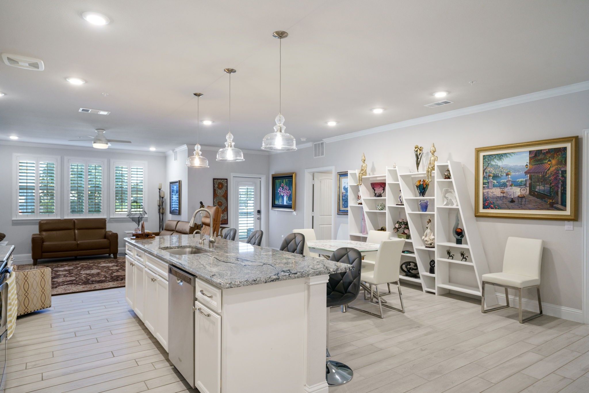 Beautifully Upgraded First-Floor Condo with the most desirable Sherwood floor plan in Gatherings at Twin Creeks (55+ Active Adult Community) This lightly lived-in home blends comfort and style with an open-concept living, kitchen, and dining area ideal for entertaining or everyday living. The chef-inspired kitchen features gorgeous granite countertops, island, upgraded electric range and oven, microwave, dishwasher, and a custom pantry with slide-outs and tool rack. All closets throughout the home are custom, including a primary suite ELFA closet. The office includes a custom built desk, and the garage features a custom cabinetry and epoxy floors. Throughout the home, enjoy ceramic wood-look tile. Additional highlights include plantation shutters, a laundry room with sink and cabinetry, and a gated private patio with a concrete walkway. This condo also includes an oversized garage conveniently located next to the unit. Residents enjoy exceptional amenities including a pool, pickleball courts, putting green, fitness center, clubhouse, raised garden beds, valet trash, dog park, and water service through the HOA. With its premium upgrades, thoughtful design, and ideal location, this home is a rare find offering tremendous value.