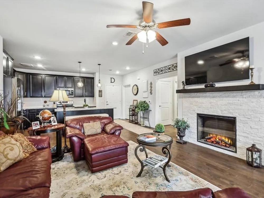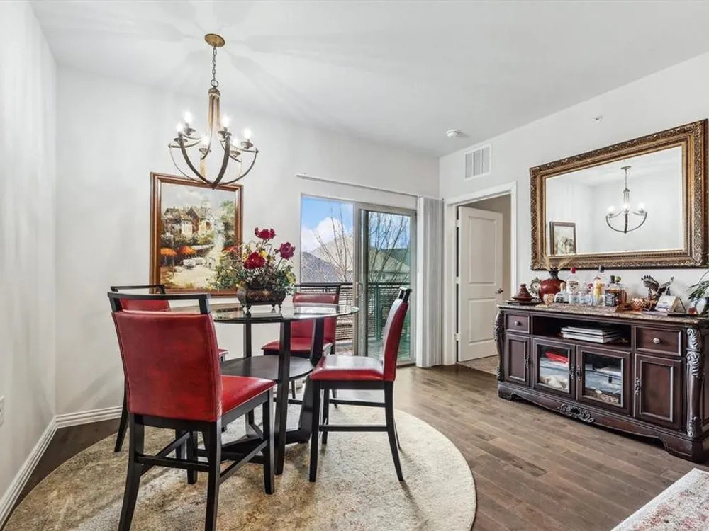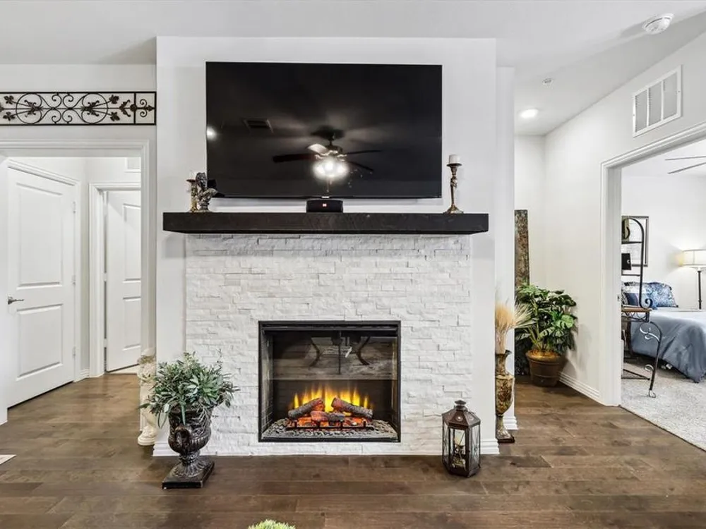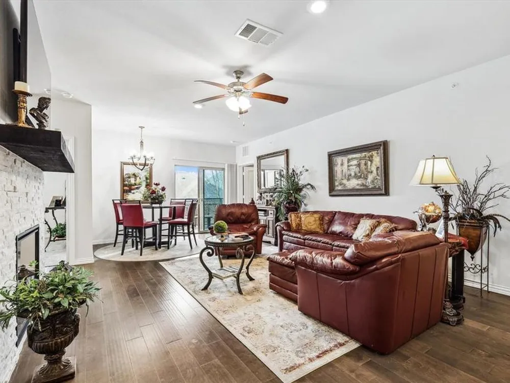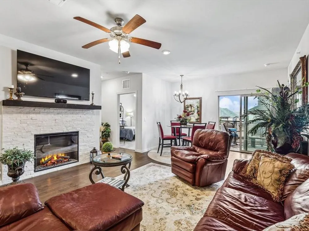 Step inside this 2-bedroom, 2-bathroom condo that includes a 11' x 25' over-sized garage that is attached to the building. The stunning designer kitchen boasts a large island, elegant back splash, and upgraded ebony cabinets, perfect for both casual dining and entertaining. Enjoy the warmth of the upgraded fireplace on cozy evenings, and unwind in the over-sized soaking tub for a true spa-like retreat. The spacious Primary Suite features double closets and a versatile bonus space—ideal for a home office, reading nook, or extra storage. Step outside to your private shaded balcony overlooking green space and trees (no busy streets in sight!), perfect for relaxing in peace. This unit also includes a rare over-sized garage, providing extra storage and convenience. Take full advantage of resort-style amenities, including Pickle Ball, a lap pool, clubhouse, fitness center, and endless social activities. This home unit offers the perfect lock-and-leave, low-maintenance lifestyle.
