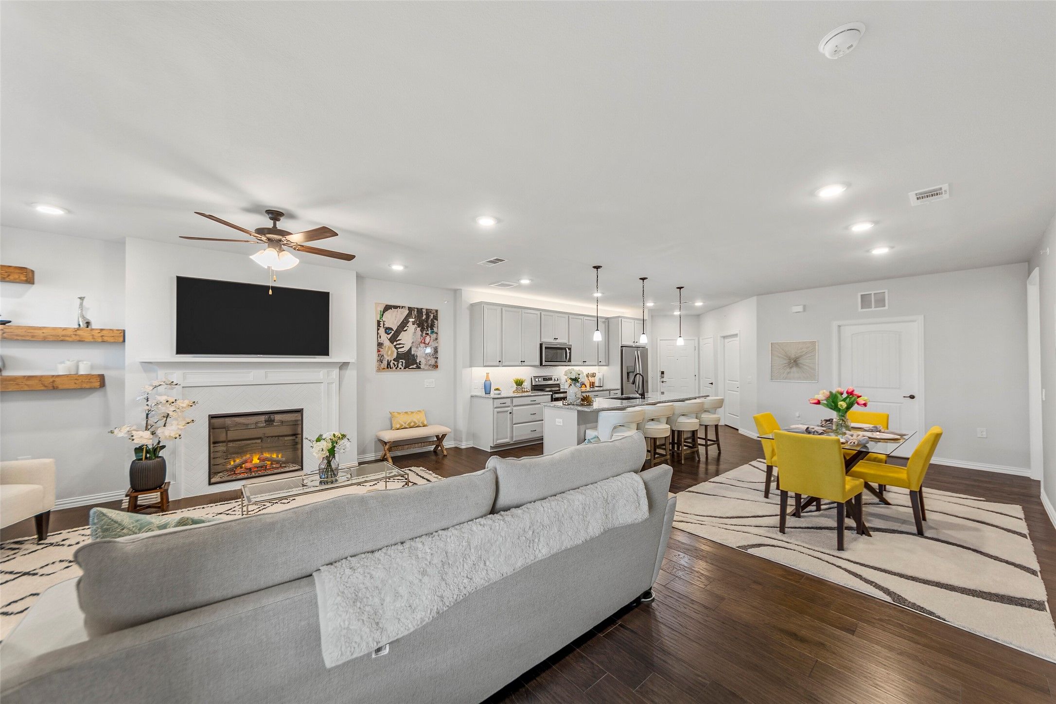 Experience sophisticated, lock-and-leave living in this luxurious 55+ community in Allen. Upon entering this gorgeous unit 5407 with open floor plan with two bedrooms with walk-in closets, and another room that can be used a guest room or office. The features of this home is plenty of natural light, custom plantation shutters throughout, fireplace in living room, engineered harwood floors throughout main area, designer doors, decorative lights and plenty of storage. The kitchen is a dream with beautiful granite countertops, stylish herringbone backsplash, walk-in pantry and large island to entertain guests. Primary bedroom suite offers additional space for sitting or study and includes a spacious walk-in closet. Primary bathroom includes walk-in shower, dual sinks, one large linen closet and one small closet. Utility room is spacious with sink area with granite countertop and plently of cabinets. Step into your balcony to view sunsets, has retractable screen door and small closet for storage. With this unit includes an extra-wide attached garage (a rare upgrade 25 x14) with a Epoxy flooring and directly across is an air-conditioned storage unit. Storage units are limited per building, making them exceptionally desirable. Unit is low-maintenance lifestyle in a peaceful setting, this secured-access community offers exceptional convenience to shopping, dining and easy access to highways. Resort-style amenities create a carefree environment, including a pool, fitness center, clubhouse with covered outdoor lounge, pickleball court, grilling stations, fire pit, putting green, lawn games, dog park, social community events, AT&T fiber-based services, EV charging, and valet trash service. Every building has a safety code entrance to main area, elevator and each building has it's unique elegant decor for the lobby area and game room ideal for gathering with nieghbors, family and friends. This top floor unit is one of KIND HOME with all the UPGRADES & ready to move-in.