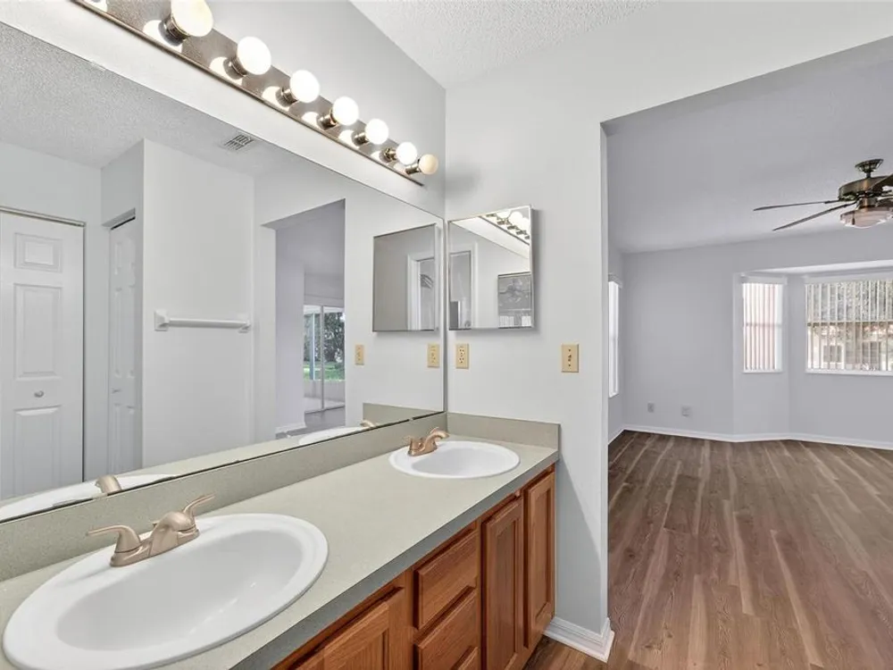 Fresh paint inside and out!!! New Laminate Flooring!!! This beautifully maintained 2-bedroom, 2-bathroom home is nestled in an active 55+ community, perfect for those looking to enjoy a vibrant lifestyle while embracing comfort and convenience. Pennbrooke Fairways offers the very best in Florida retirement living; Activities that are fun, carefree, and affordable! Pennbrooke Fairways is home to many inviting indoor amenities that include a Fitness Center, Activity Center and Grand Hall buildings with full kitchens, a card room, craft room, billiards, ping-pong tables, hair salon, library, and an on-site non-denominational church. Outdoor amenities include two swimming pools and spas, a softball field, tennis courts, pickleball courts, bocce courts, corn hole, shuffleboard, fishing ponds, RV & boat storage, horseshoe pits, and three, 9 hole golf courses, one is a regulation 9 course and two executive courses. When you come home from your active day, you will step into a bright and airy open-concept living space, compliments of your sliding glass doors that lead to your Florida Room/Lanai, ideal for entertaining family and friends. The kitchen has ample counter space, and a cozy dining area, making meal prep a delight. The generous sized bedrooms BOTH feature an en-suite bathroom and walk in closets. The second bedroom offers flexibility not only for guests but a craft room or a home office. Enjoy peaceful mornings or evenings on your private patio, surrounded by lush landscaping—perfect for relaxation or social gatherings. This home is conveniently situated near shopping, dining, and recreational opportunities, this home offers easy access to everything you need. Explore scenic walking trails, local parks, and community events that foster connections with neighbors. This lovely home in a welcoming 55+ community is ready for you to move in and start enjoying life to the fullest. Schedule your private showing today and discover the perfect blend of comfort, community, and convenience!