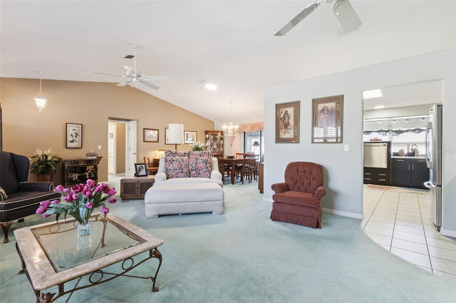 - Ceiling Fan(s), Eat-in Kitchen, Living/Dining Room, Solid Surface Counters, Solid-Wood Cabinets, Split Bedrooms, Vaulted Ceiling(s), Window Treatments