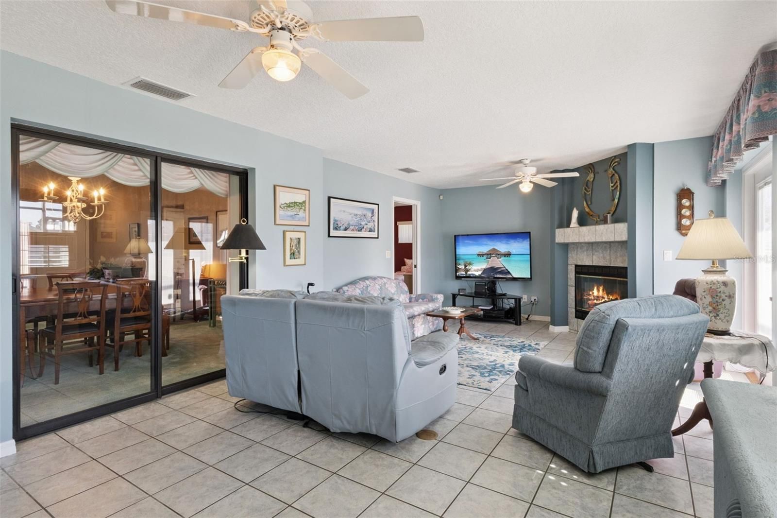 This beautiful home, in the sought after Highland Lakes community, has been very well-maintained by its original owner. The home offers 3 bedrooms, 3 bathrooms, with 2,546 sq. ft. of flexible living space including a family room with a gas fireplace. The spacious primary suite features 2 large walk-in closets and an en-suite bath with dual sinks, a walk-in shower and a jacuzzi tub. On the other side of the home are the spacious 2nd and 3rd bedrooms with expanded double closets and the 2nd bathroom. The kitchen is bright and inviting with dark cabinetry, glass inserts, under-cabinet lighting, with ample counter space, pantry and drawer pull-outs, and a dinette area. The huge kitchen with stainless steel appliances also features a raised dishwasher for your convenience. This property features an oversized 2-car garage with its own full-size bathroom and a large screened rear lanai, opening from the family room French doors with built in blinds, creating an ideal setup for entertaining, letting pets out with ease, or simply enjoying your morning coffee in the Florida breeze. Major updates include a 2025 gas water heater, 2024 roof, a 2024 electrical box and a well-maintained 2006 HVAC system, double-pane energy-efficient windows, blinds, and plantation shutters. Highland Lakes is a premier 55+ community offering an impressive array of amenities. Residents enjoy the heated indoor and outdoor pools and a spacious clubhouse with a fitness center, craft room, library, catering kitchen, game and meeting rooms, billiards, ping pong, and an indoor arena with a stage for live entertainment community events. Outdoor amenities include walking trails, fishing ponds, lighted tennis and pickleball courts, shuffleboard, bocce ball, horseshoe pits, a softball field with concession stand, a covered picnic pavilion with grills, a Craftsman Club / Wood Working Shop (join for just $12/annually), an RV and boat storage (included in HOA), a golf driving range and catch and release fishing. Schedule your private showing today!