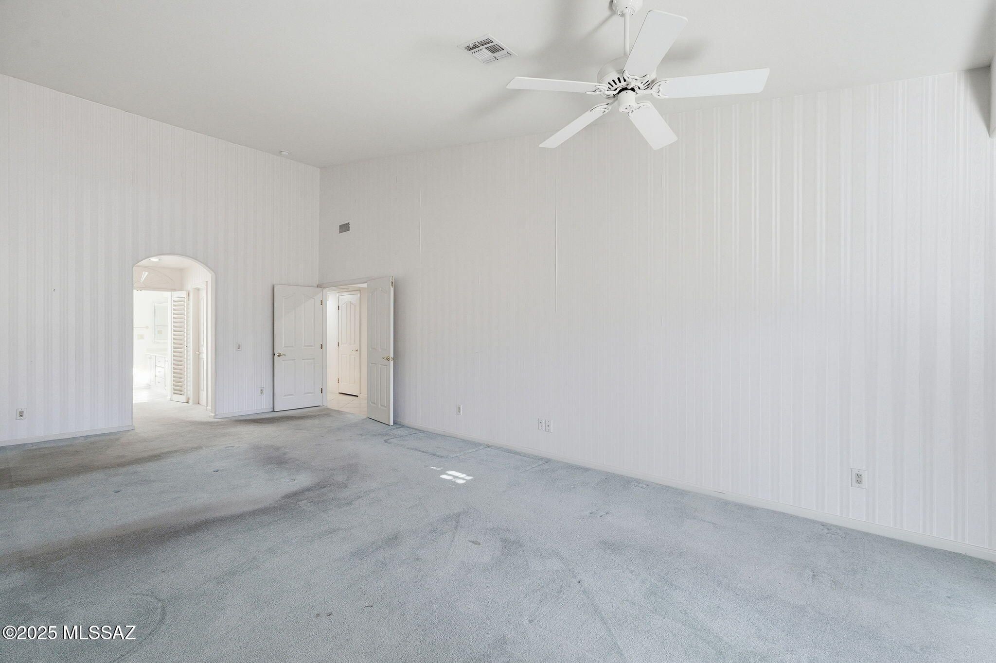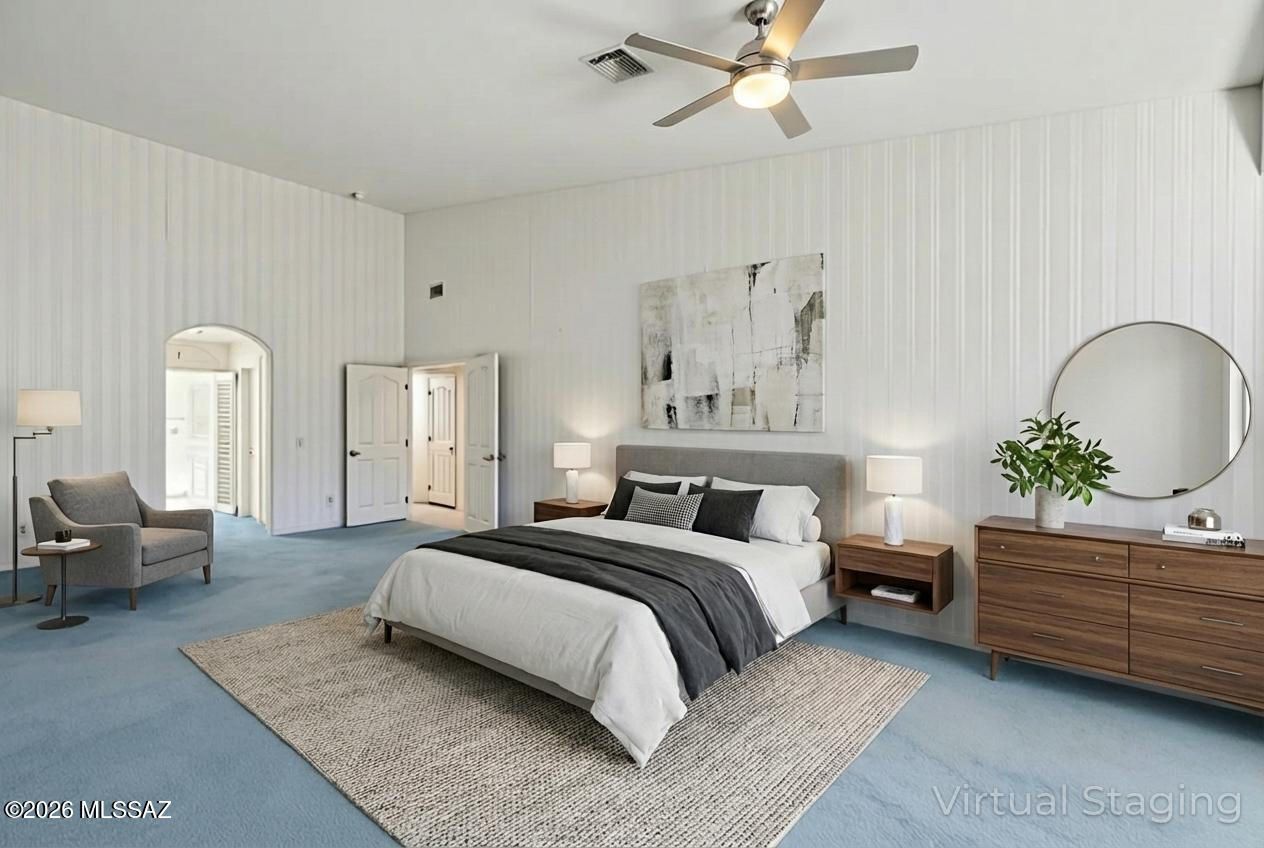 - Ceiling Fan(s), High Ceilings, Primary Downstairs, Skylights, Split Bedrooms, Vaulted Ceiling(s), Walk-In Closet(s), Wallpaper, Wet Bar